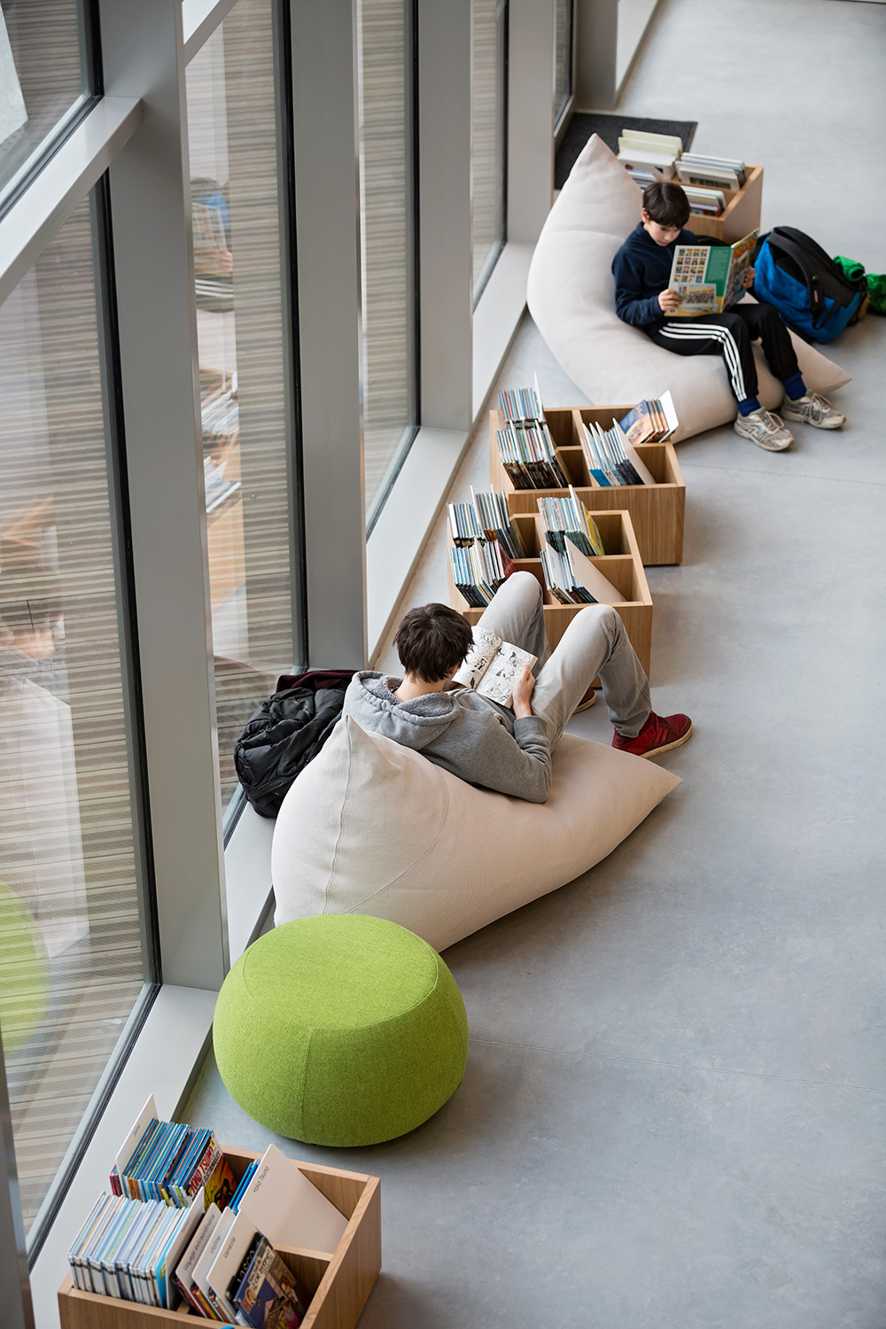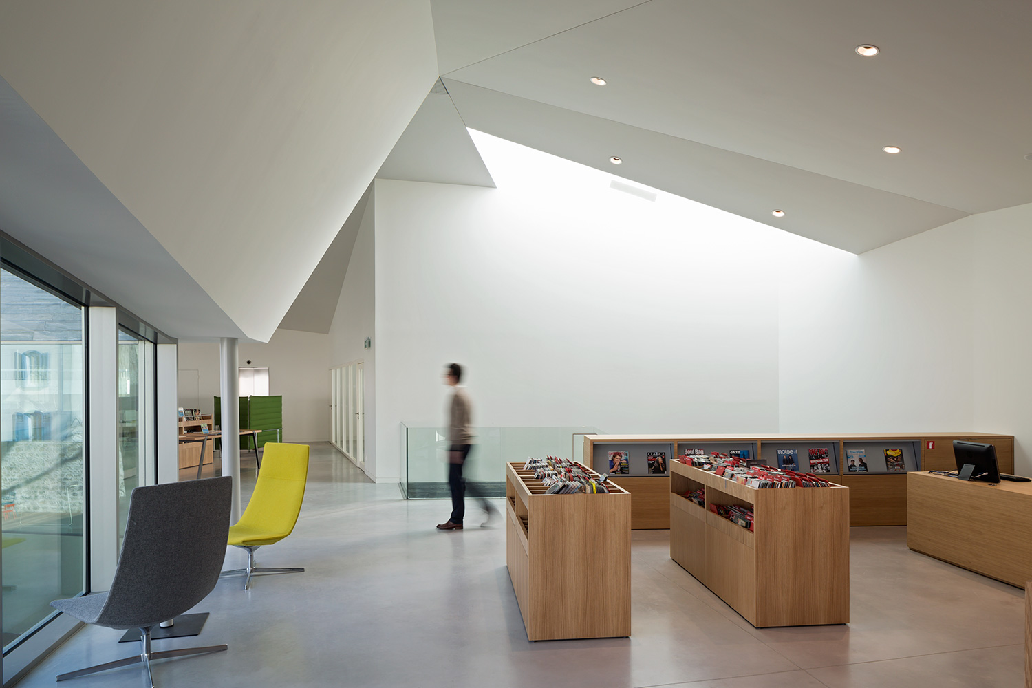 Inredningen i ek och i vitlackerat utförande är till största delen specialdesignad för detta biblioteksprojekt liksom de höga väggplacerade hyllorna. Designen är flexibel med stor anpassningsmöjlighet till framtida, eventuella förändringar av utrymme eller funktion. Denna flexibilitet i produktdesignen kännetecknar även stora delar av vårt standardsortimentet.