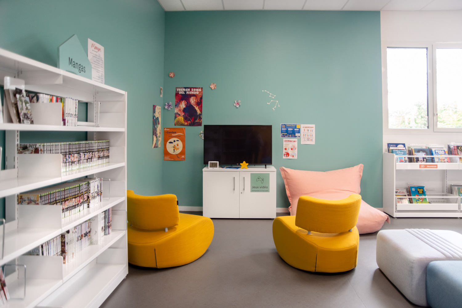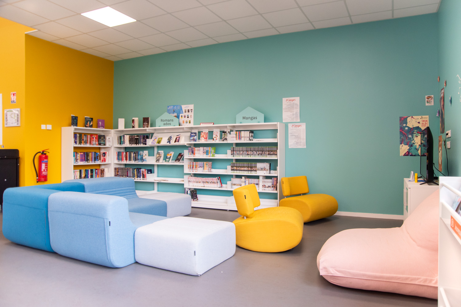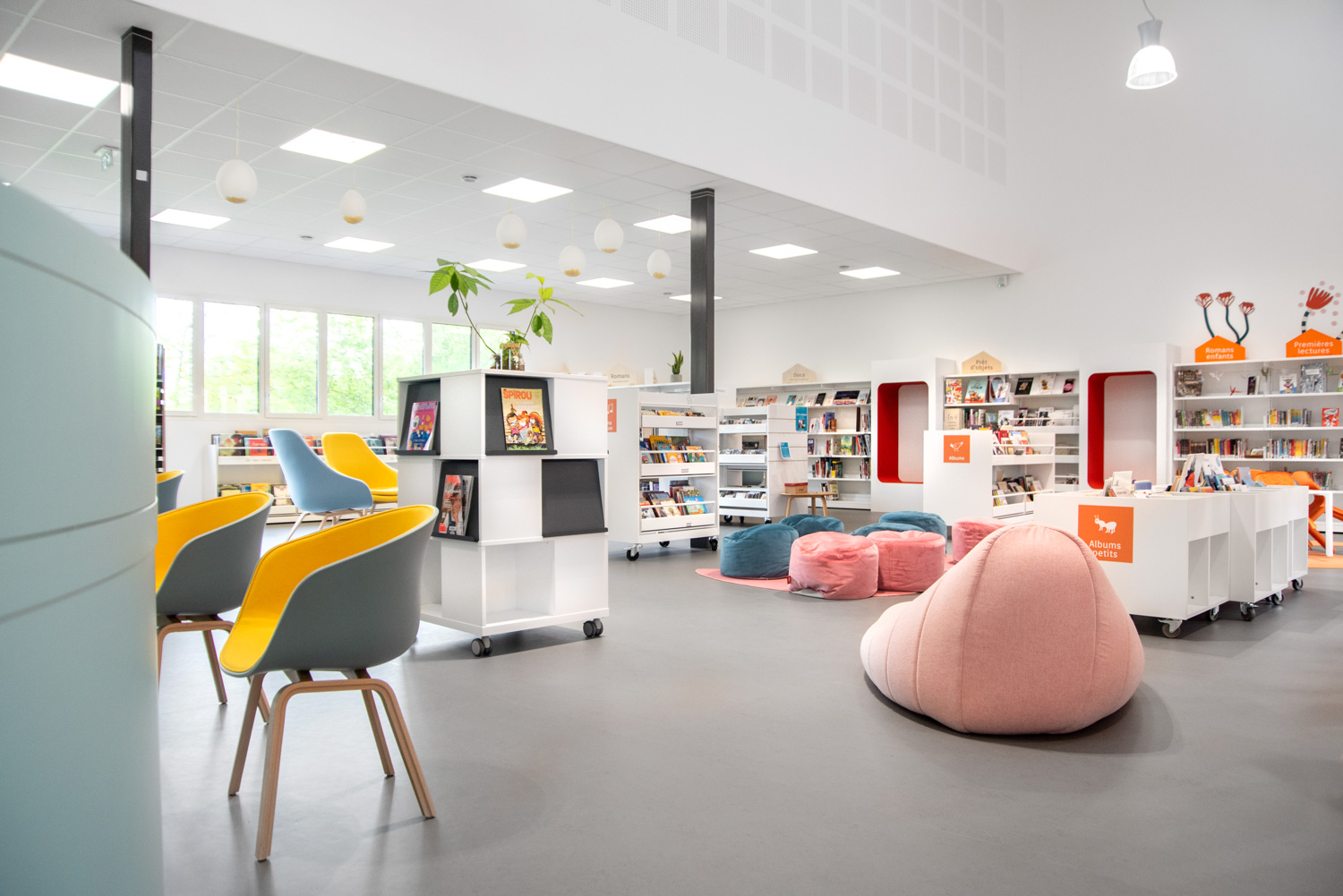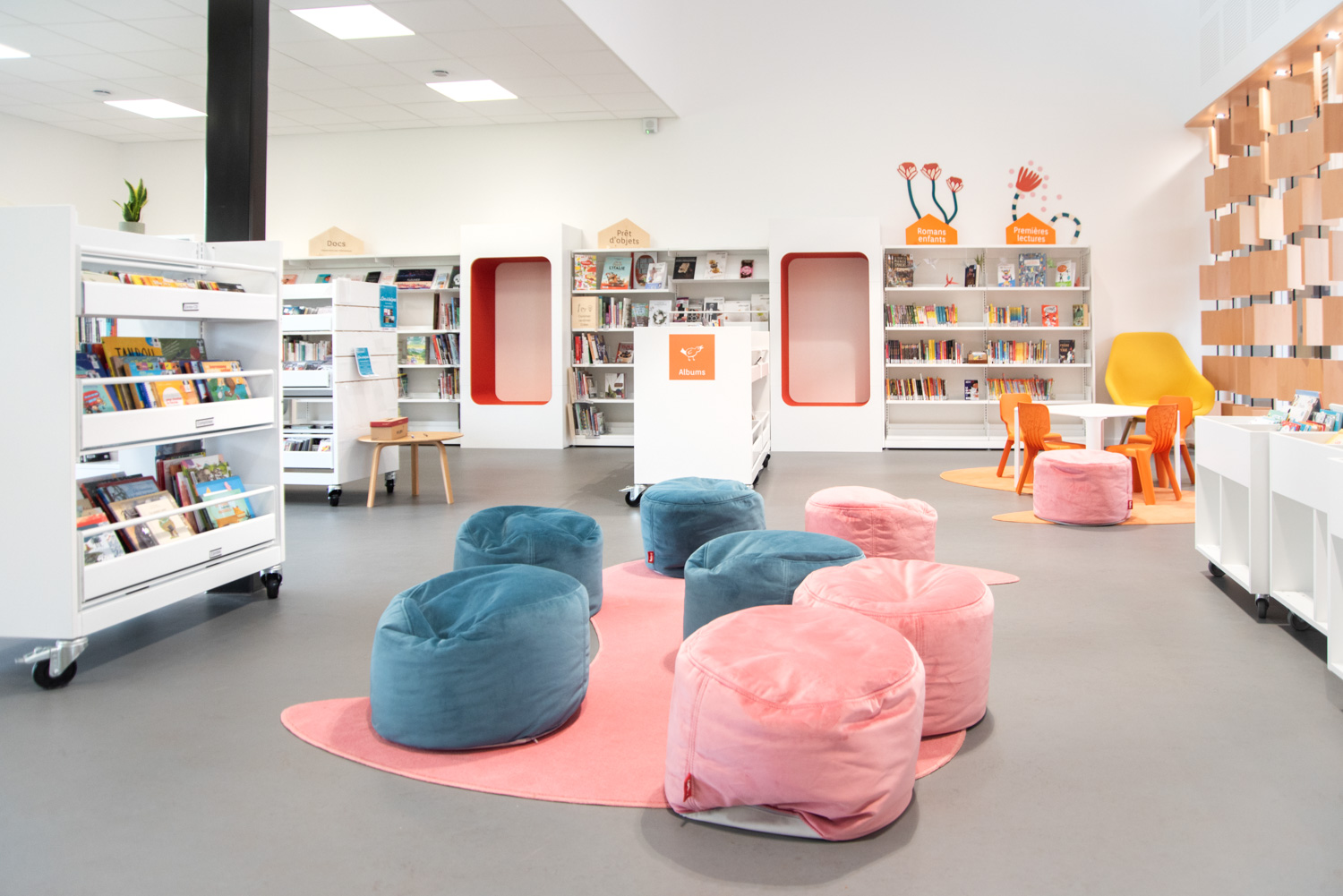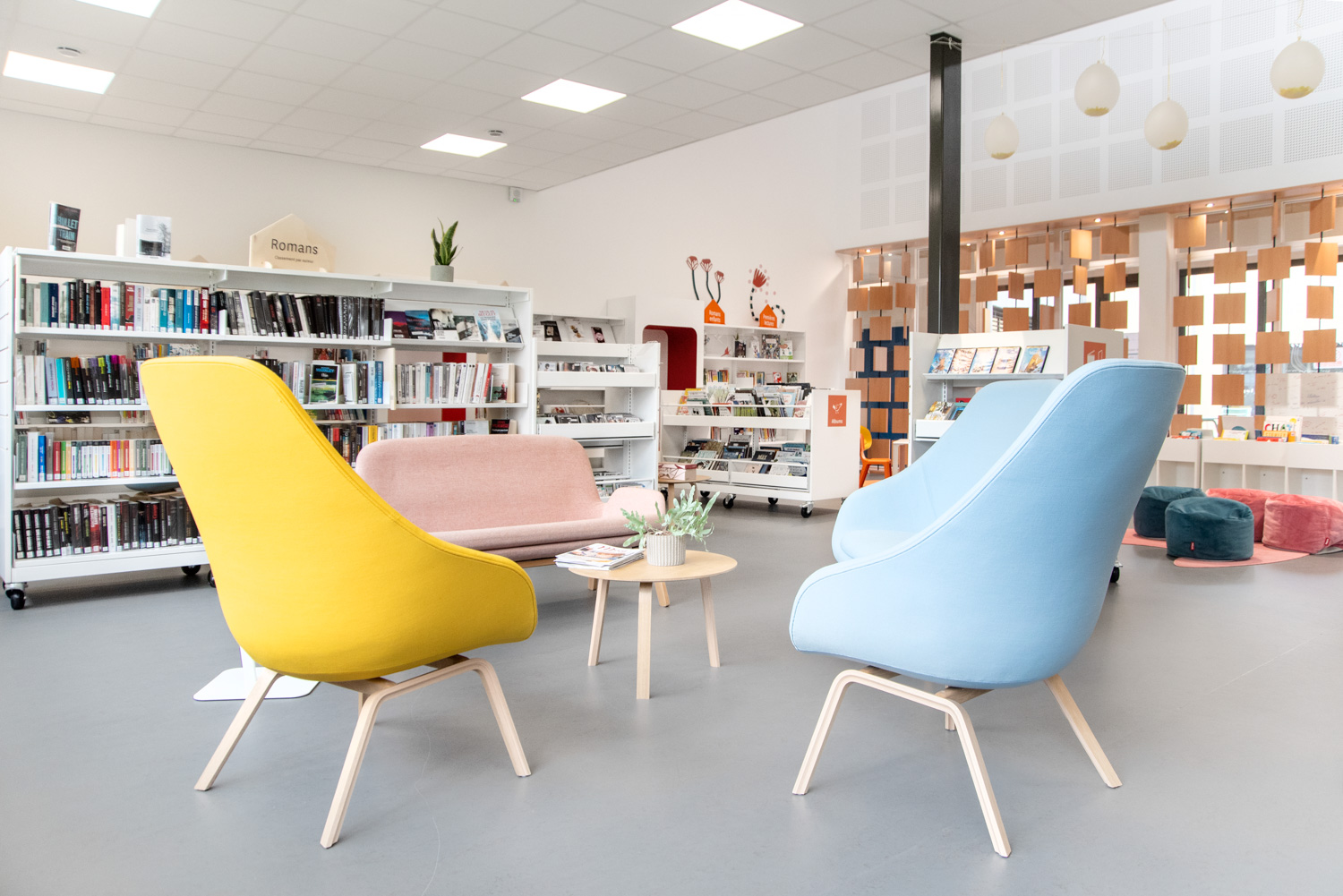 Här finns originella sittmoduler, en vertikal Cocoon och sittpuffar för avskild eller avslappnad läsning.