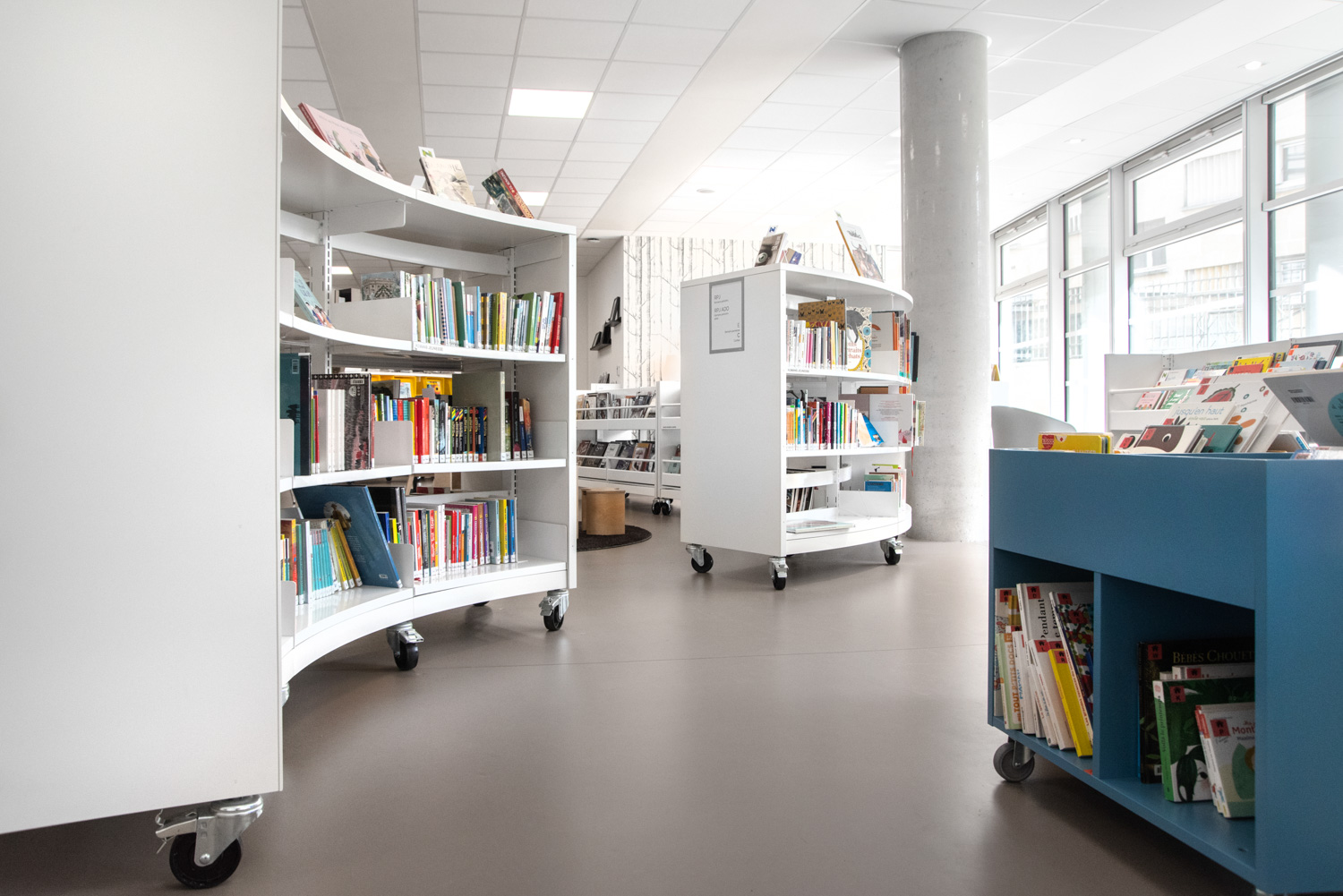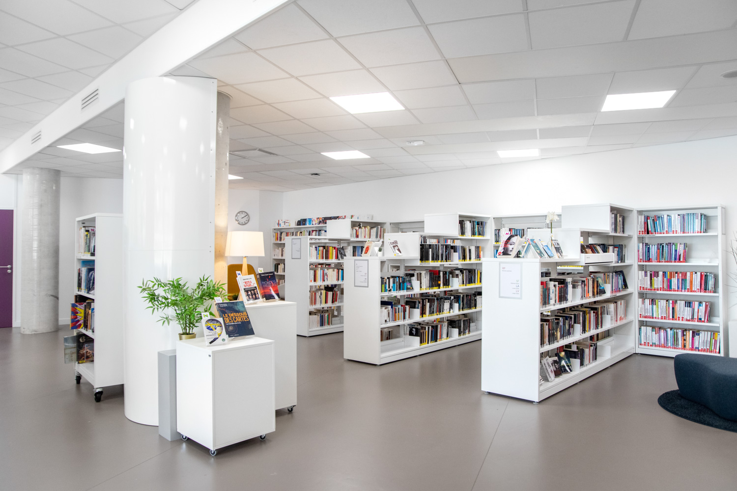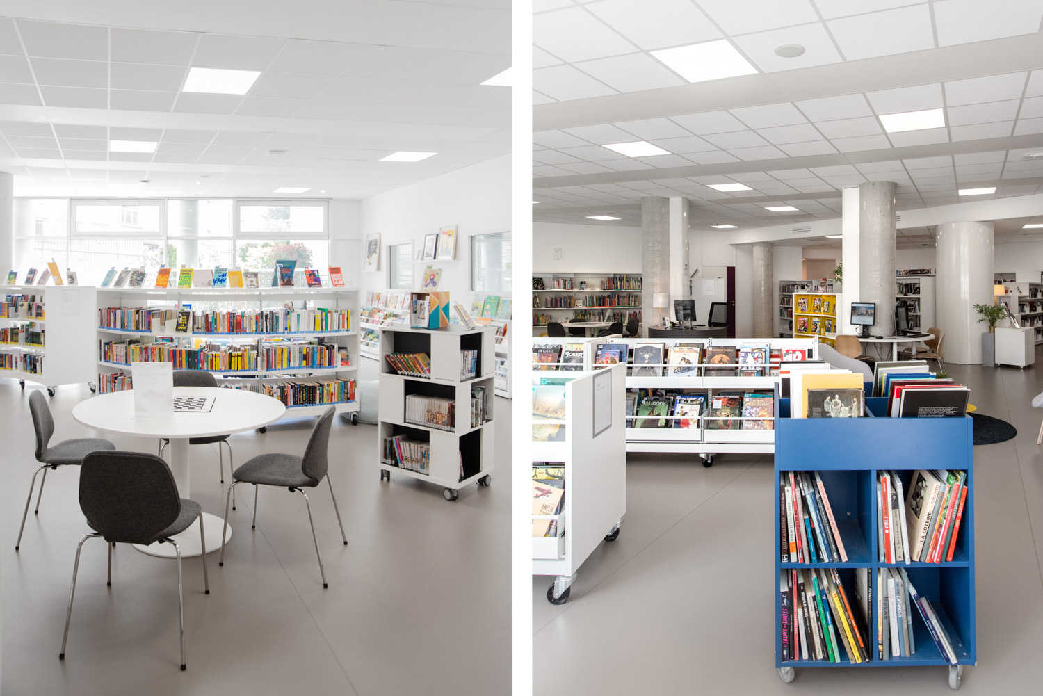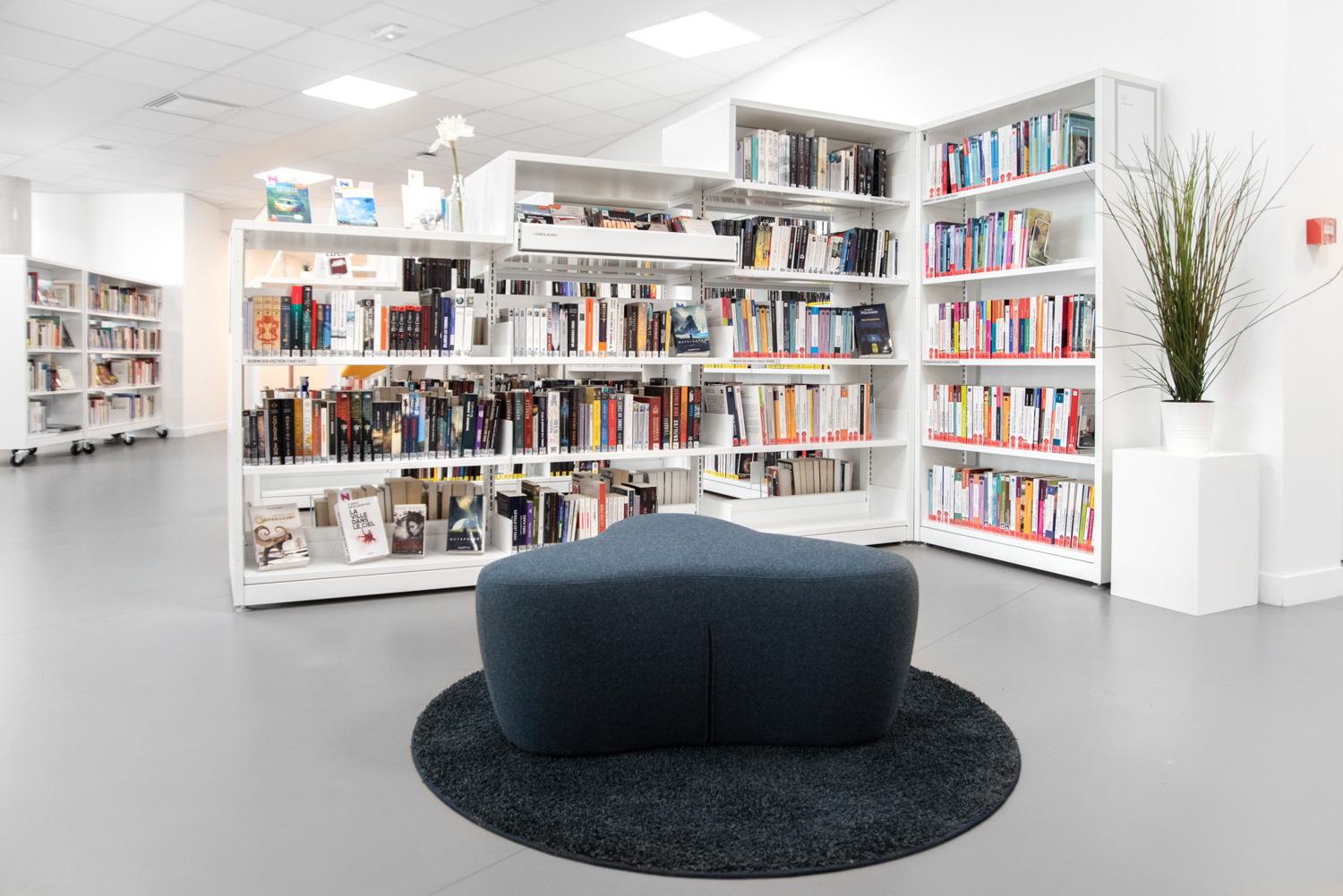 I samarbete med BC Intérieur har biblioteket i La Poterie en glad och flexibel biblioteksdesign som på samma gång är visuellt sammanhängande och tydligt differentierad! Det framgångsrika samarbetet har skapat ett kulturellt rum som bjuder in invånarna att komma in och tillbringa tid på biblioteket genom att lyssna på en skiva i stora fåtöljer, läsa en bra historia eller rolig tecknad serie på bekväma sittpuffar eller arbeta tillsammans i små grupper.