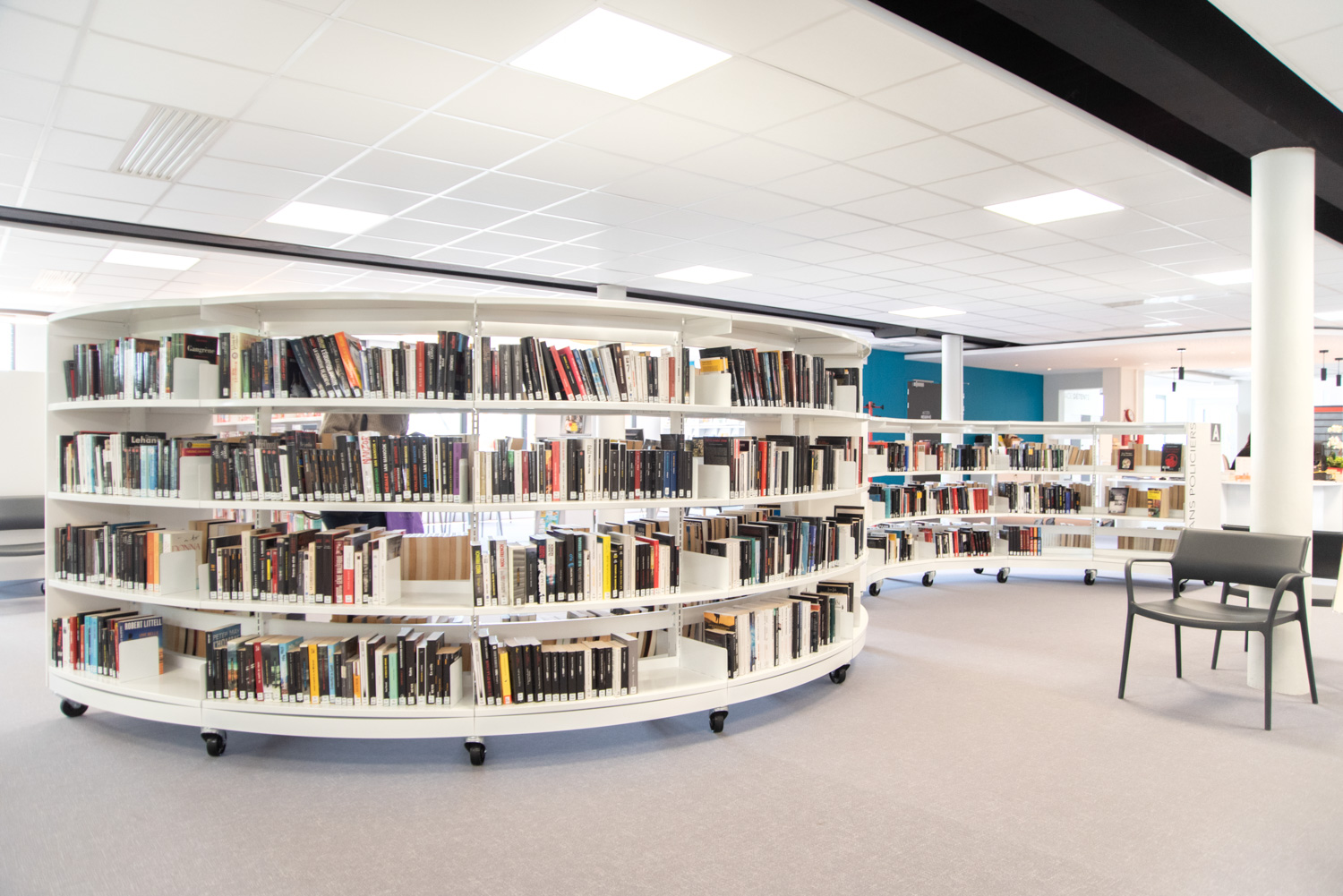 Det nya biblioteket öppnade sina dörrar i mars 2022. Vuxenavdelningen har två stora, runda hyllor, vilket gör att den gamla layouten tillhör det förflutna. En läshydda skapar en mysig atmosfär på barnavdelningen.