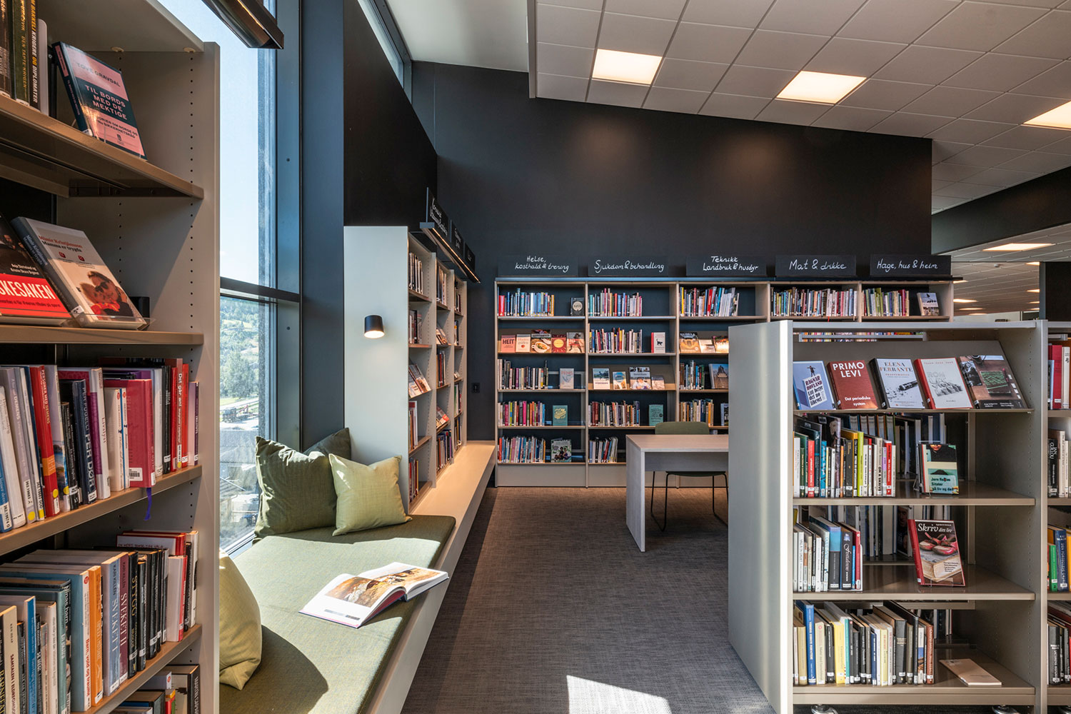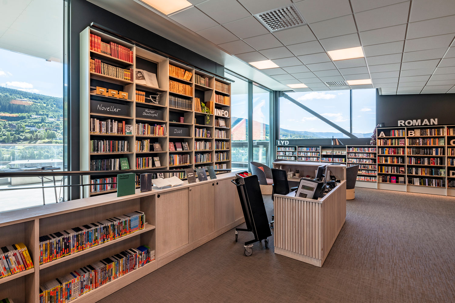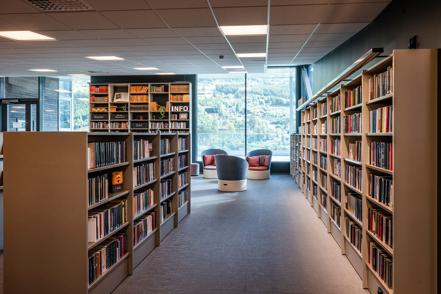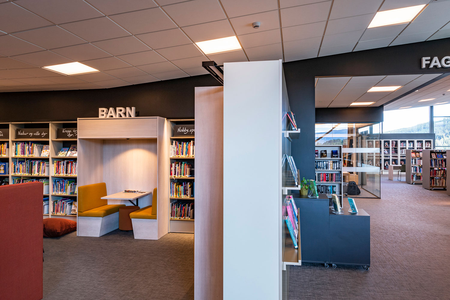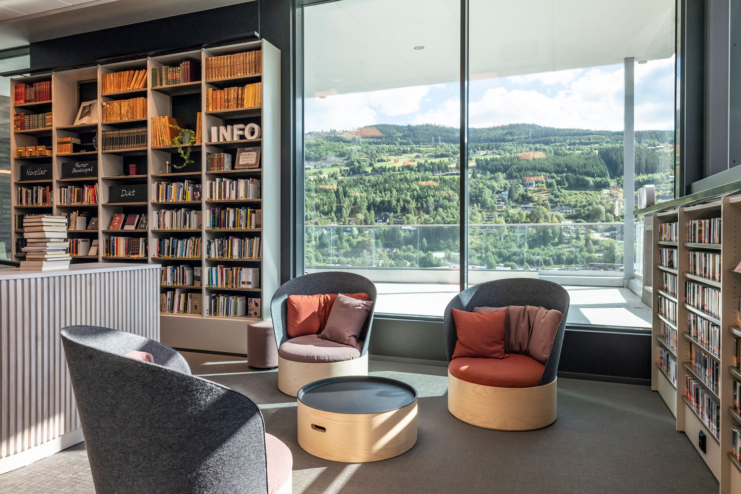 Biblioteket i Ål är fantastiskt beläget ovanpå den nya utbyggnaden av Åls kulturhus. I inredningen har det lagts vikt på luft, ljus och flyttbara möbler. Flexibel inredning betyder att lokalerna lätt kan anpassar till årstider, arrangemang och aktiviteter, och färgskalan är inspirerad av den lokala rosmålningstraditionen.