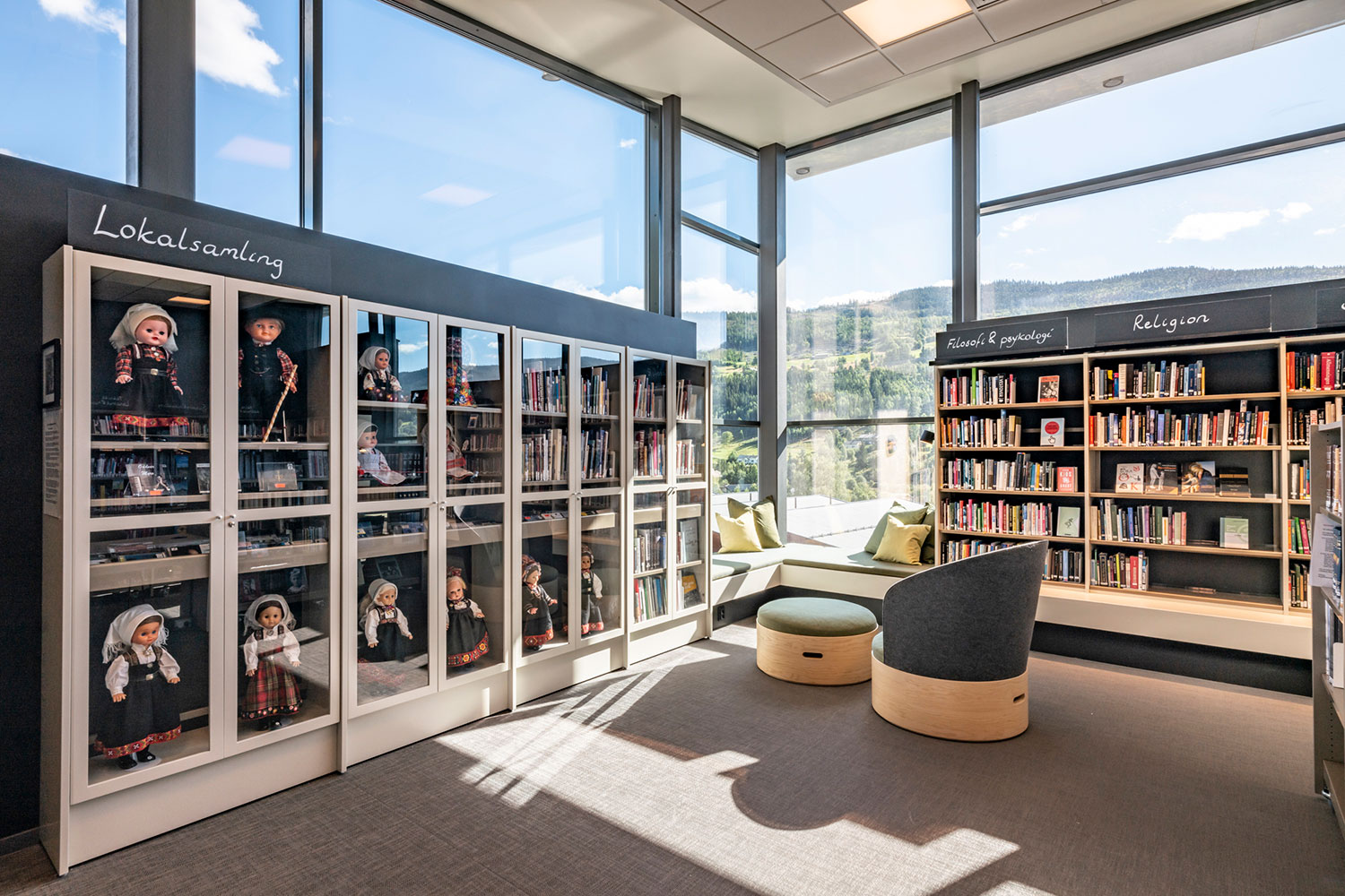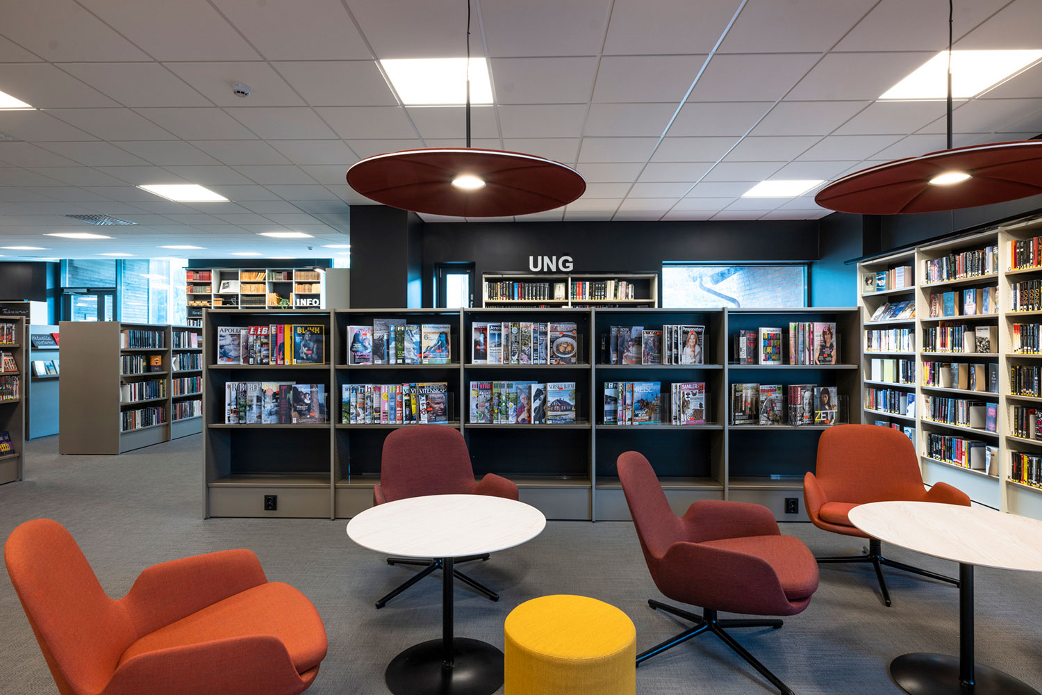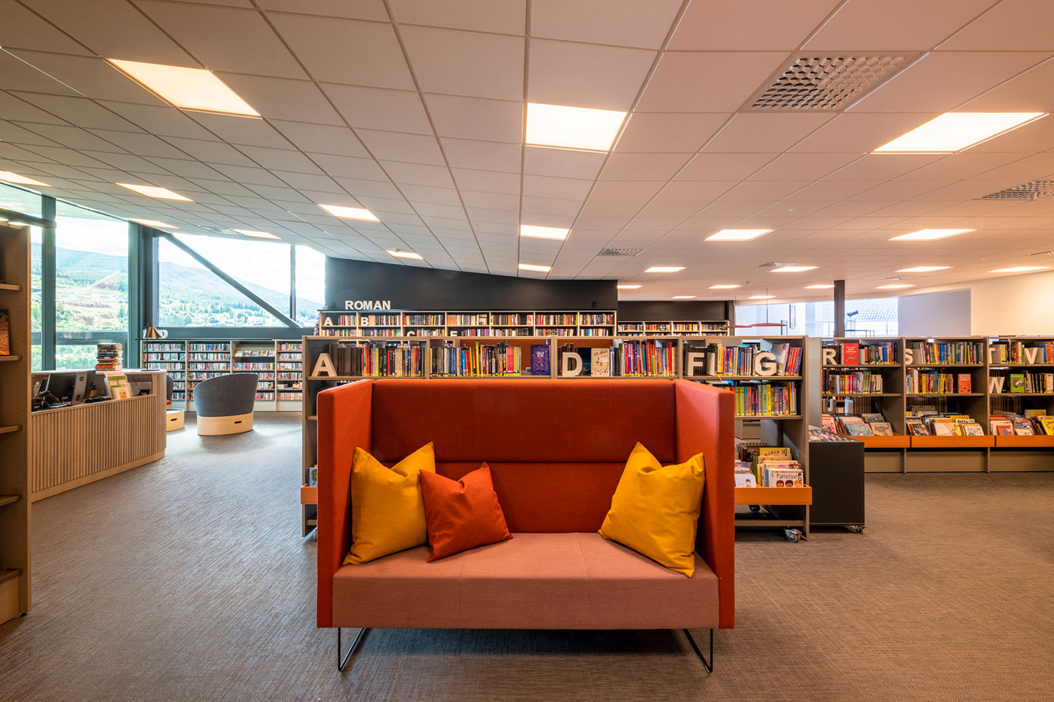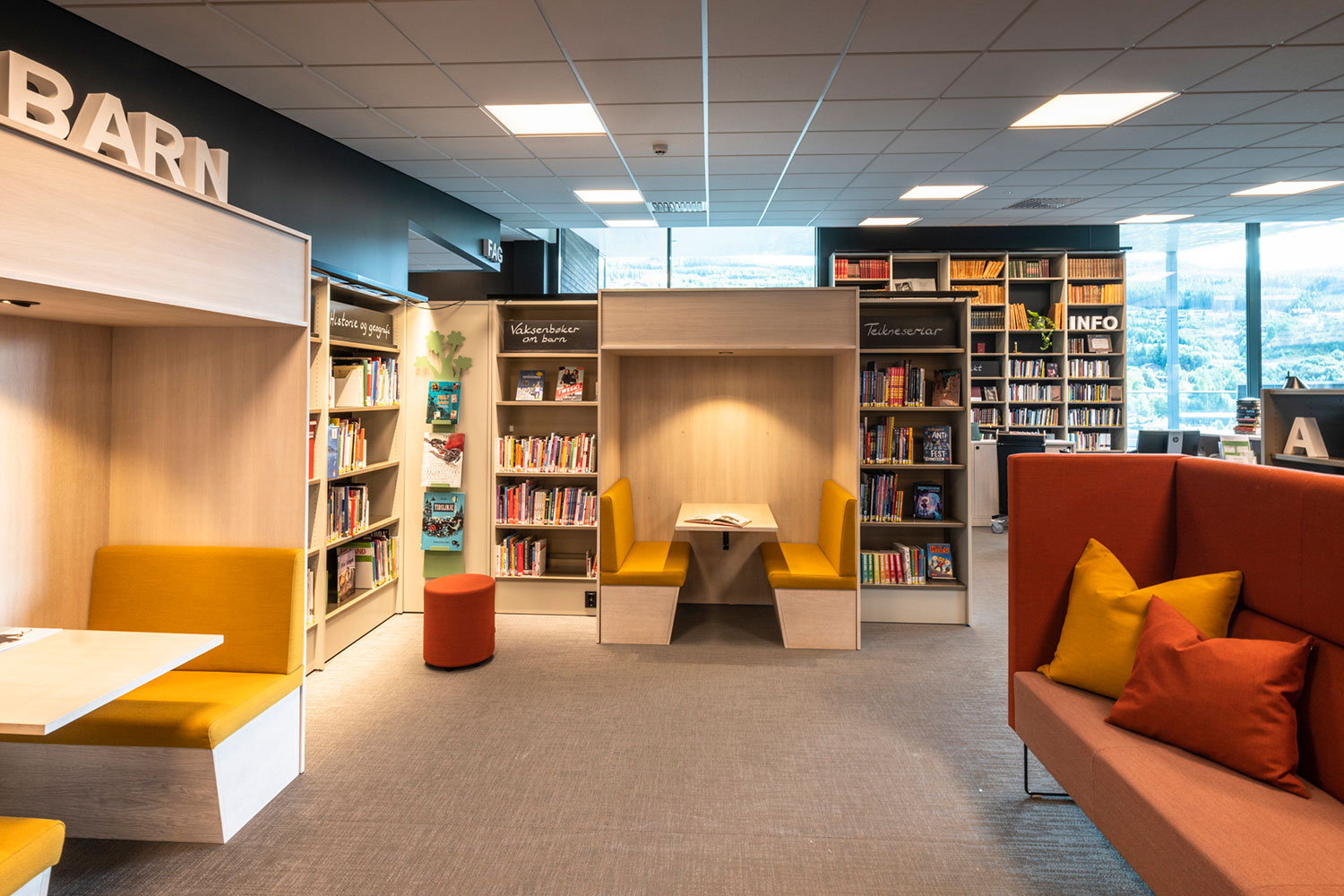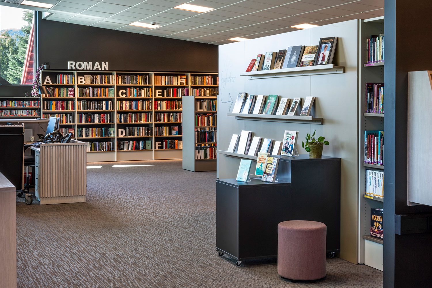 Biblioteket i Ål är fantastiskt beläget ovanpå den nya utbyggnaden av Åls kulturhus. I inredningen har det lagts vikt på luft, ljus och flyttbara möbler. Flexibel inredning betyder att lokalerna lätt kan anpassar till årstider, arrangemang och aktiviteter, och färgskalan är inspirerad av den lokala rosmålningstraditionen.