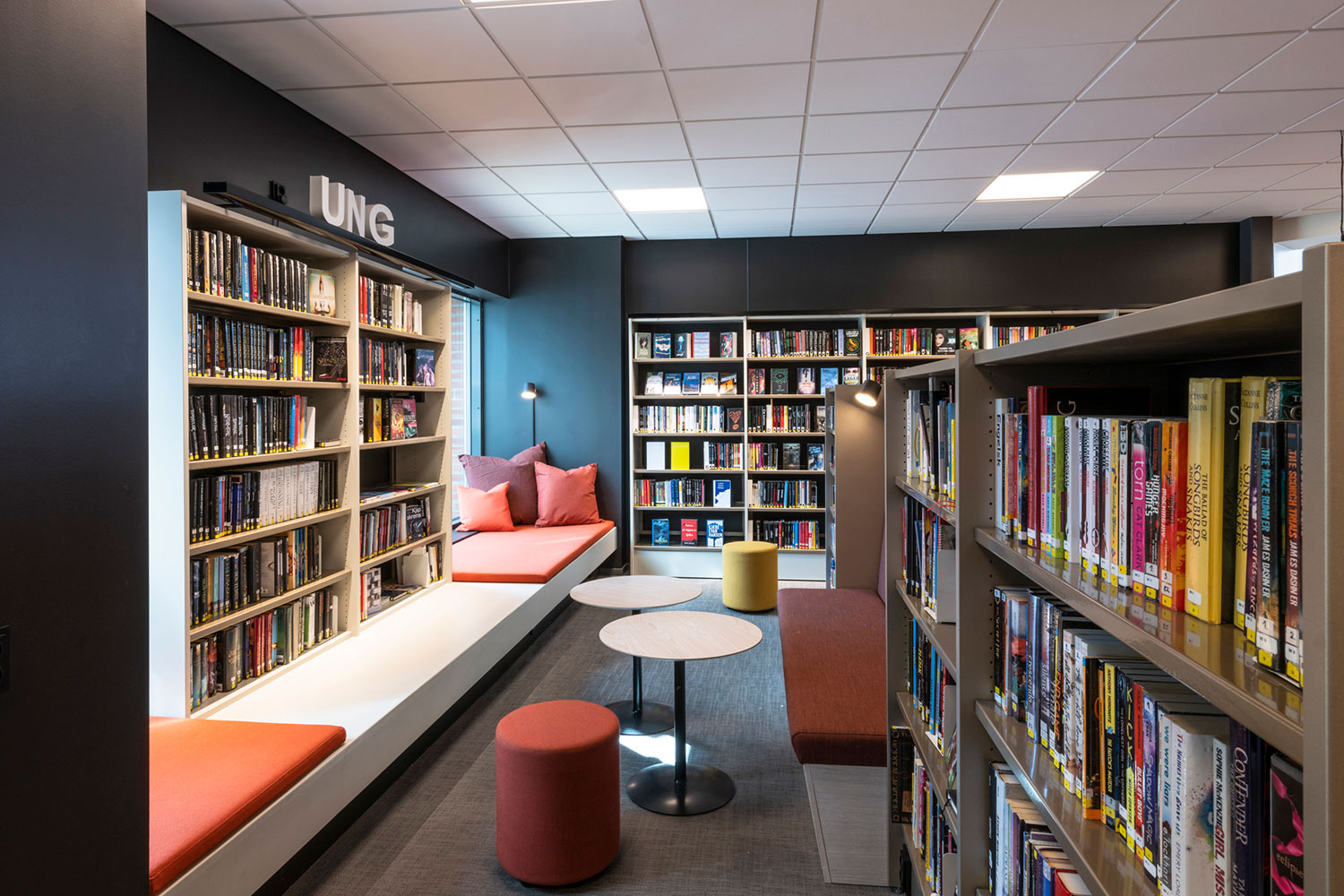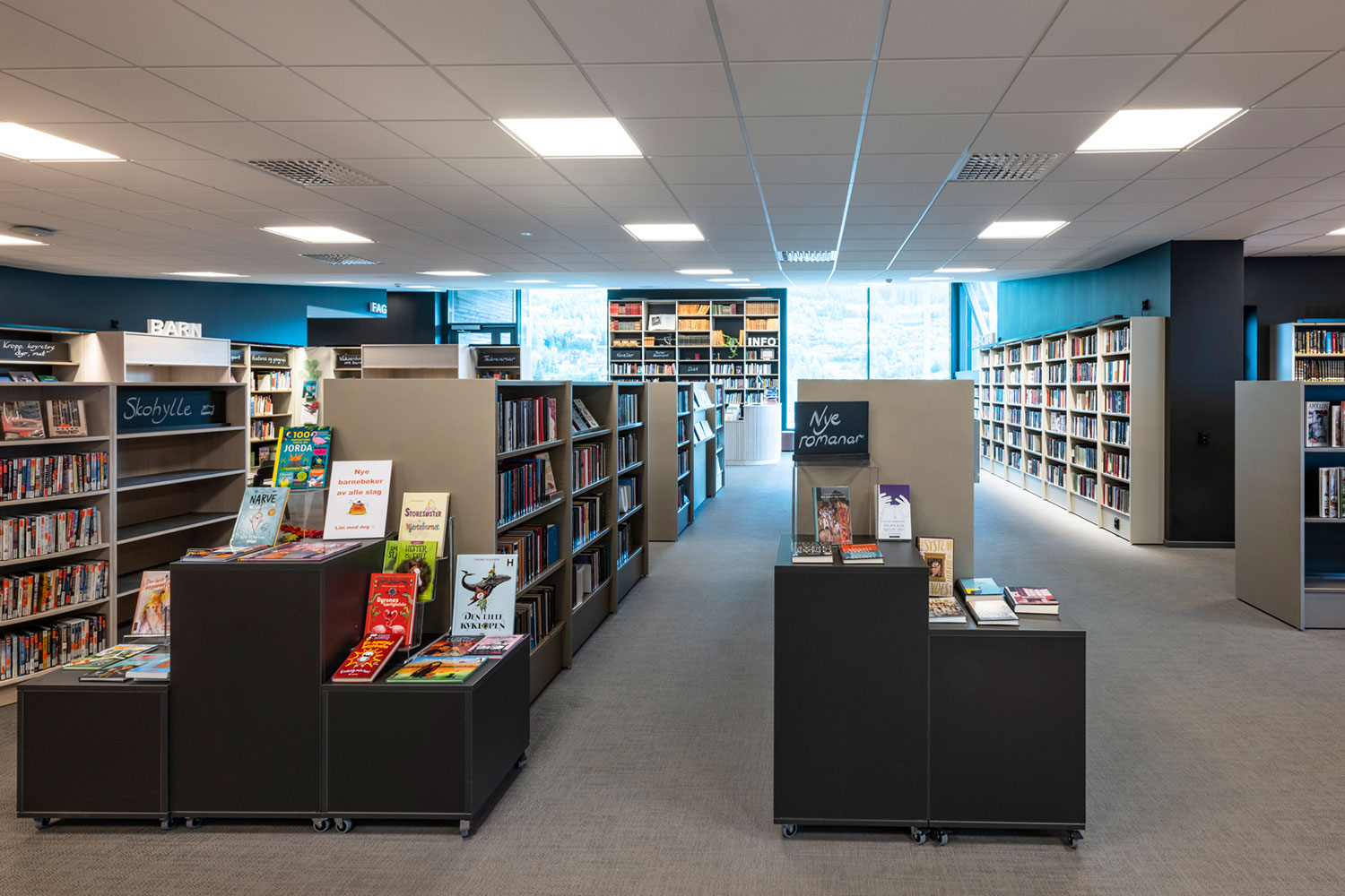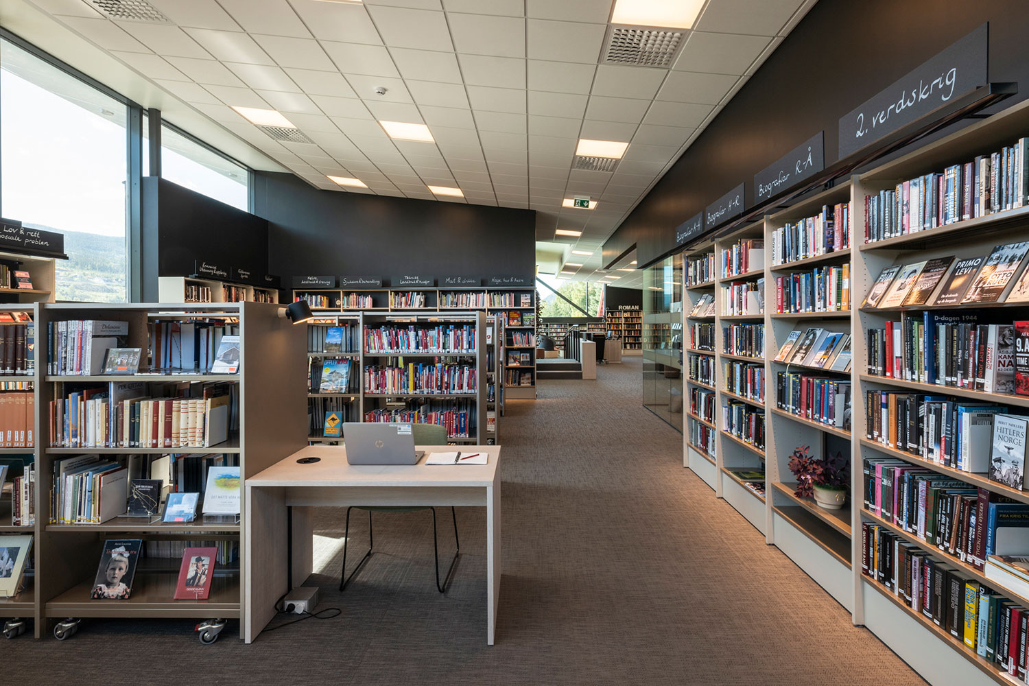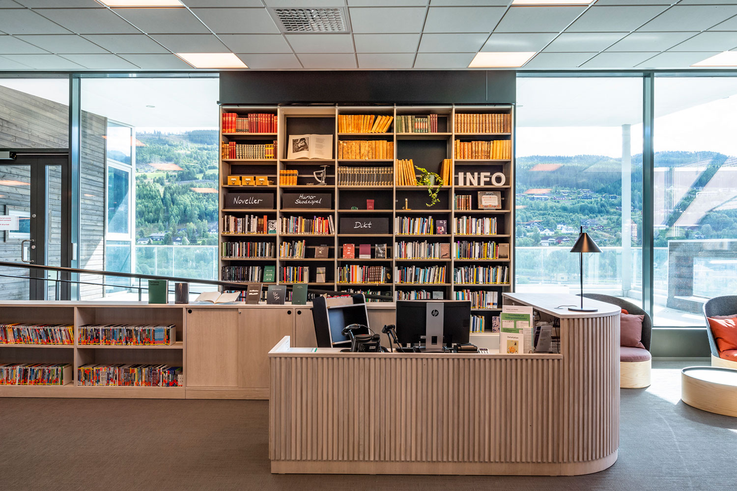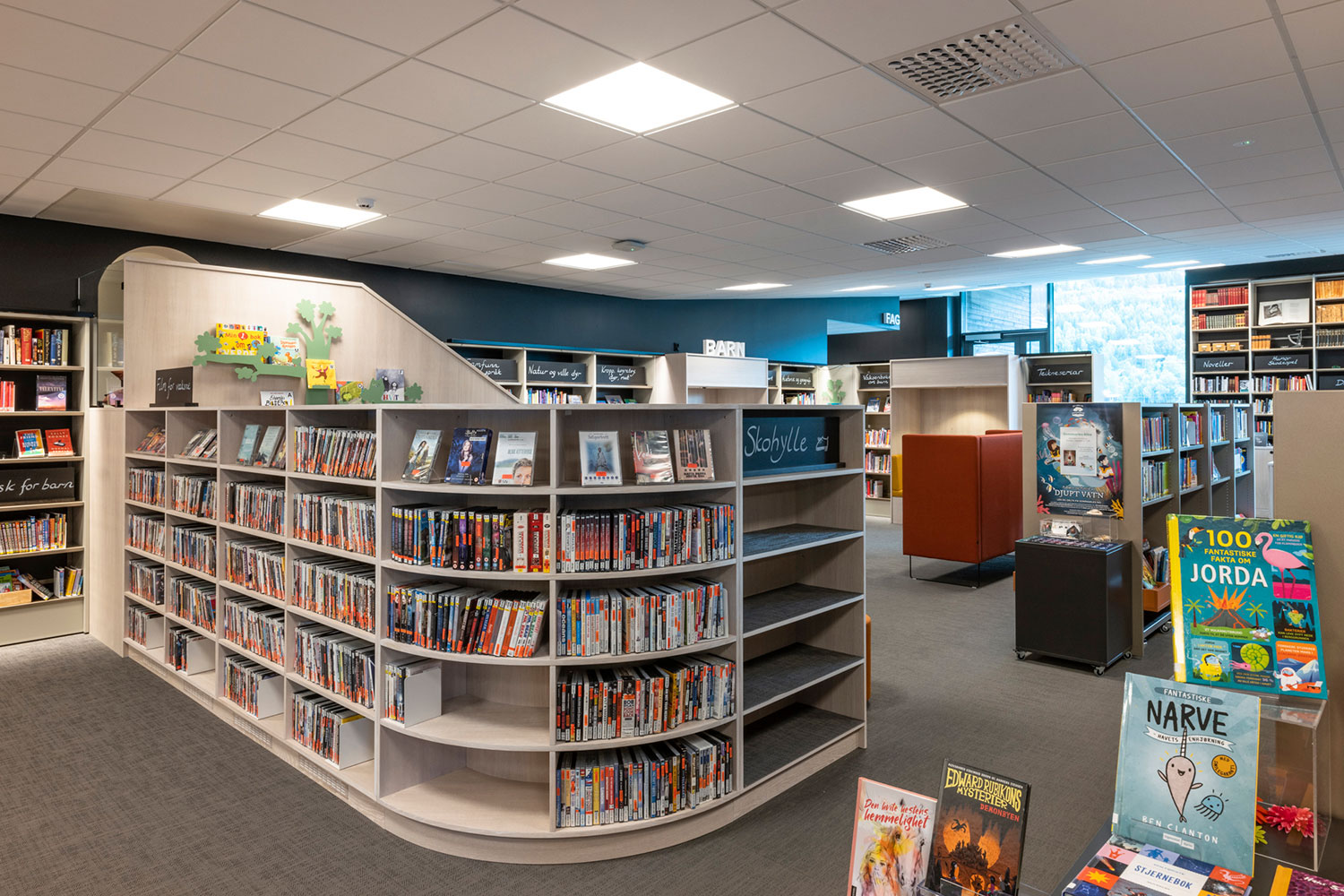 Biblioteket i Ål är fantastiskt beläget ovanpå den nya utbyggnaden av Åls kulturhus. I inredningen har det lagts vikt på luft, ljus och flyttbara möbler. Flexibel inredning betyder att lokalerna lätt kan anpassar till årstider, arrangemang och aktiviteter, och färgskalan är inspirerad av den lokala rosmålningstraditionen.