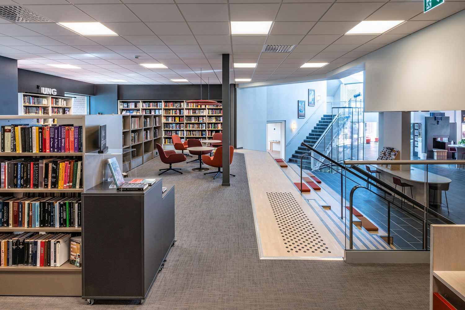 Amfiteatern är kulturhusets samlingspunkt och fungerar som ett ”fågelberg” till alla sorters aktiviteter, informellt mingelområde, scen eller som sittplatser vid arrangemang.