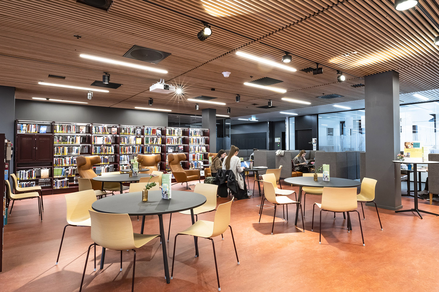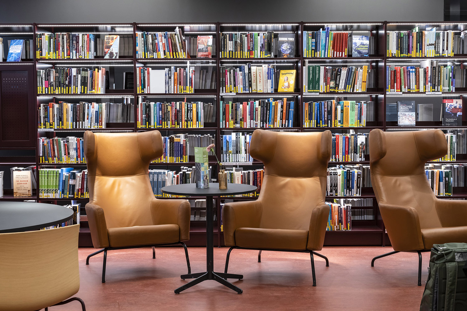 Inbjudande sittområden är viktigt, och i biblioteket finner man både individuella läsplatser och platser för grupparbete.