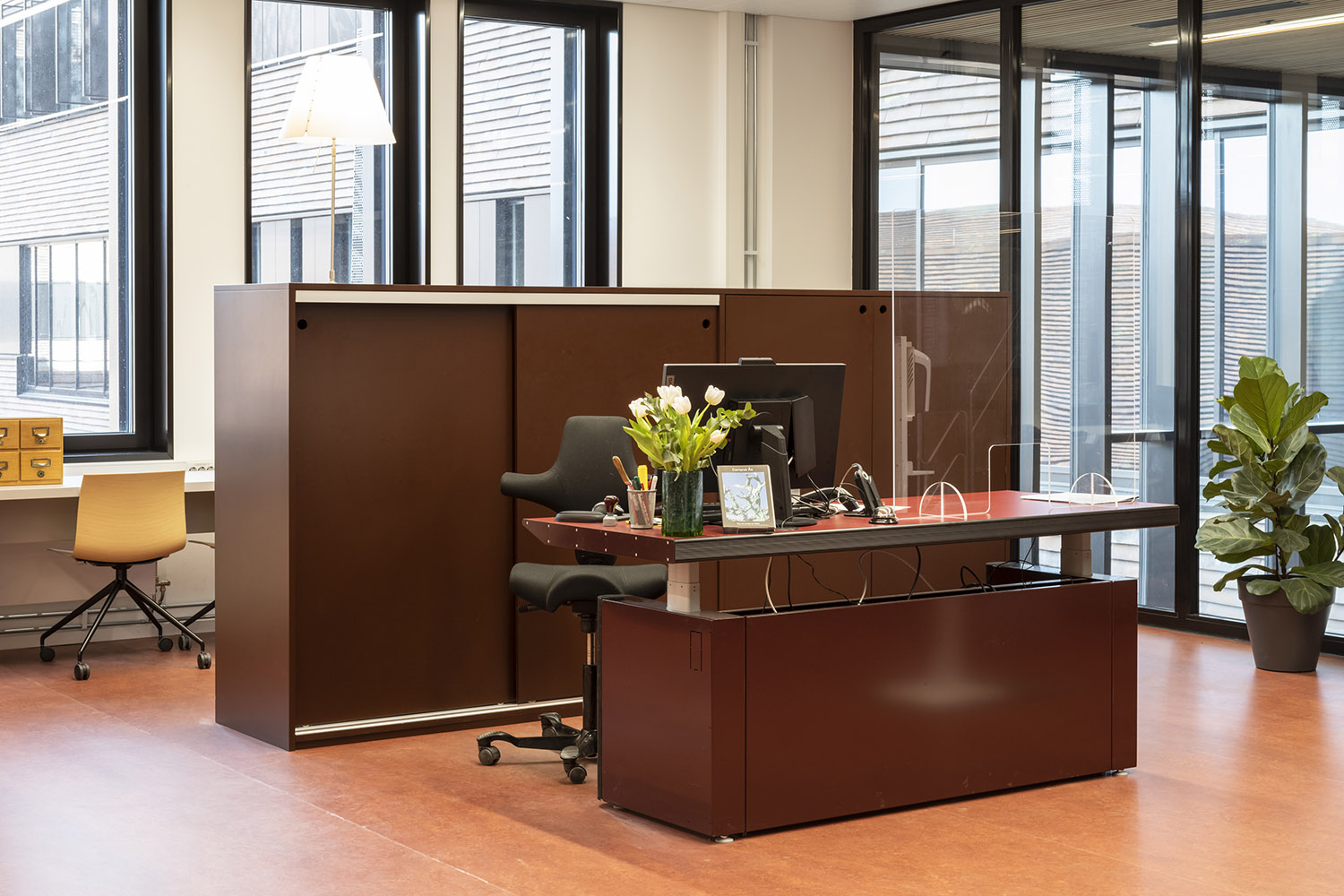 Hyllinredningen är en blandning av låga hyllor på hjul för flexibilitet och höga hyllor med fast monterade, flyttbara stegar för att komma åt de översta hyllplanen. Integrerad LED-belysning på varje hyllplan gör det lättare att läsa boktitlarna.