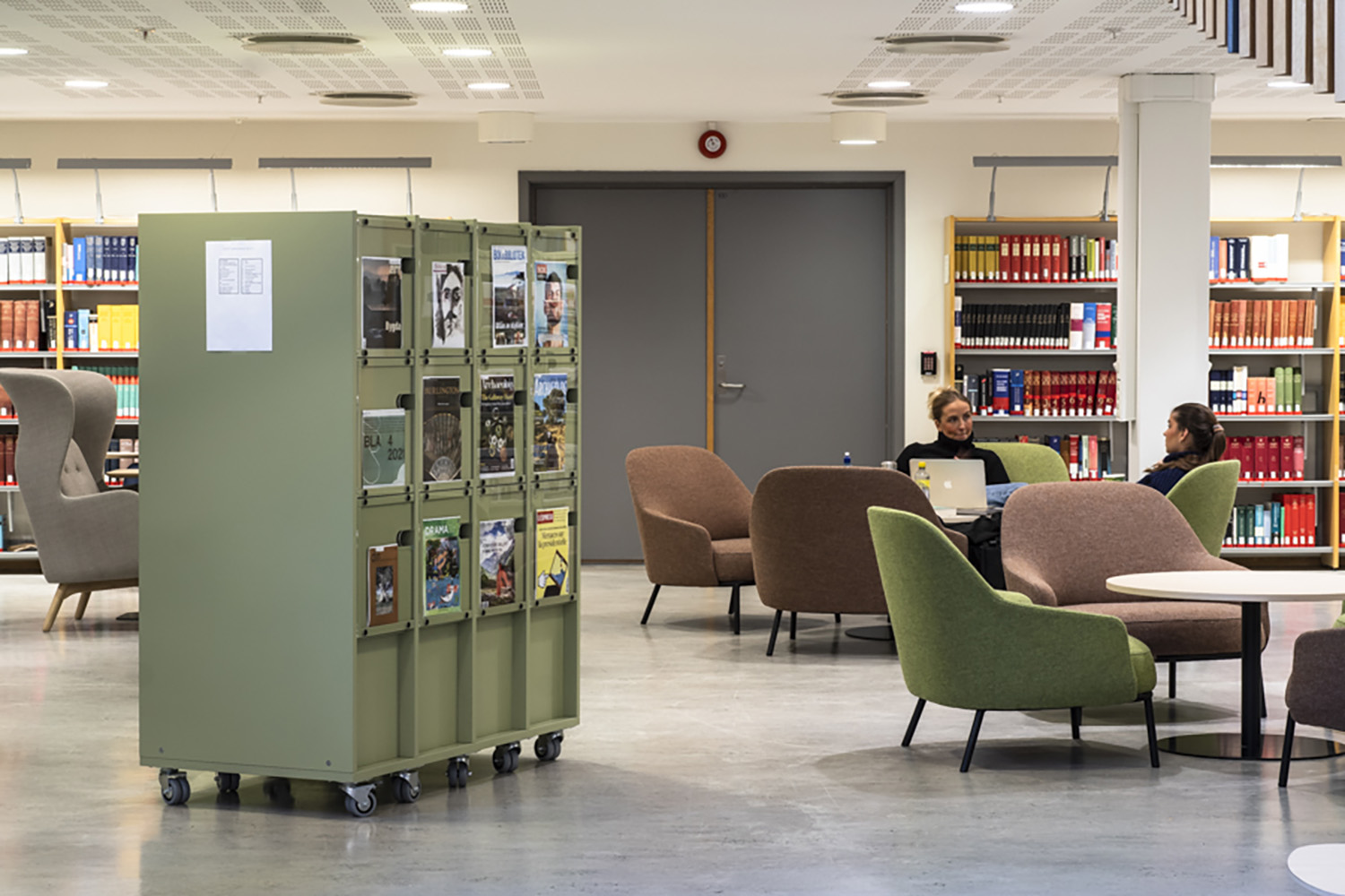 Många biblioteksmöbler hålls i lugna färger som matchar väggfärgen och ger bra kontrast till övrig inredning.