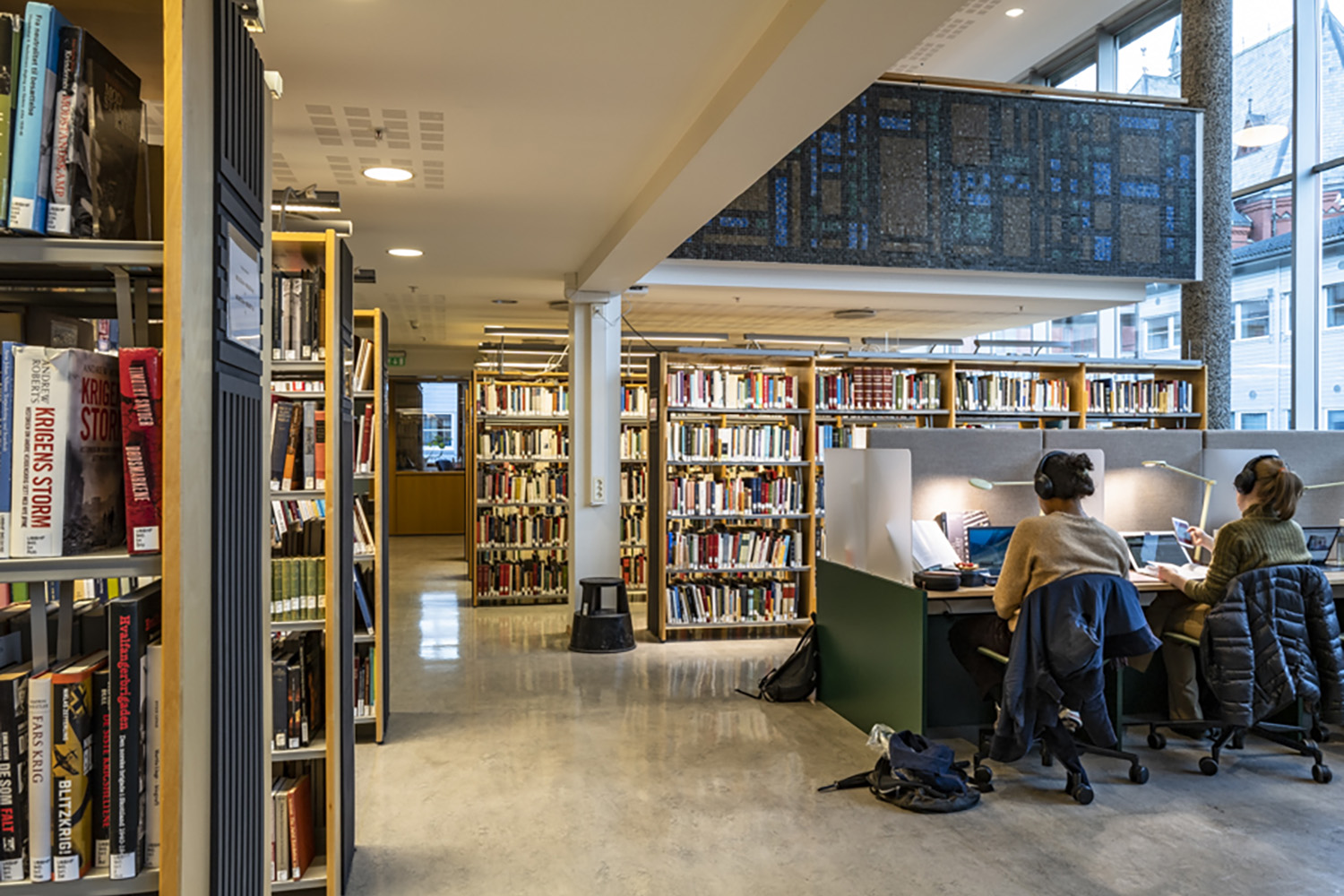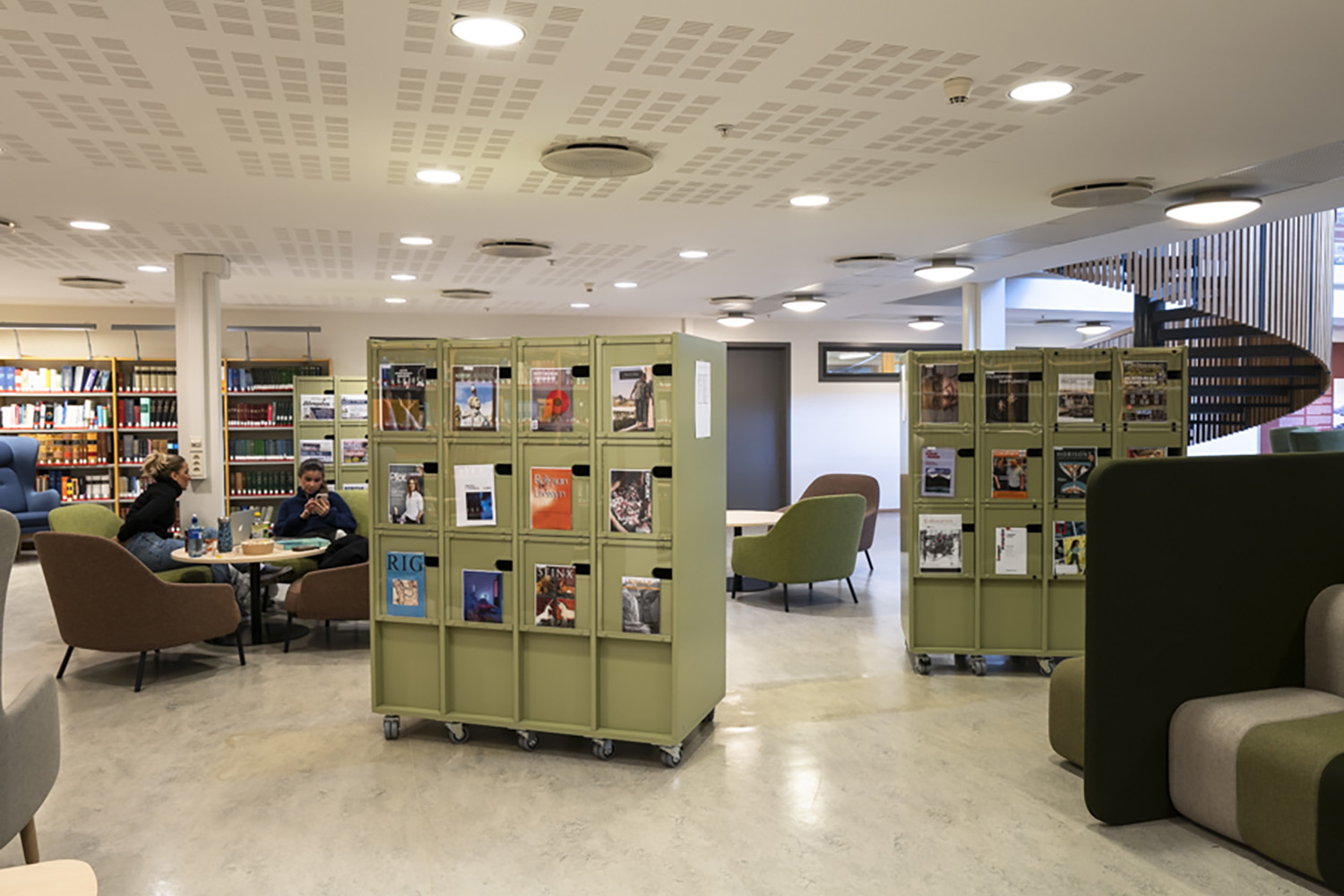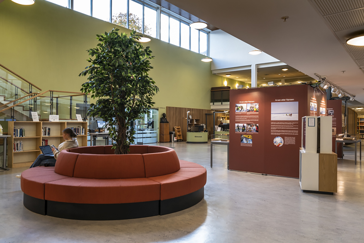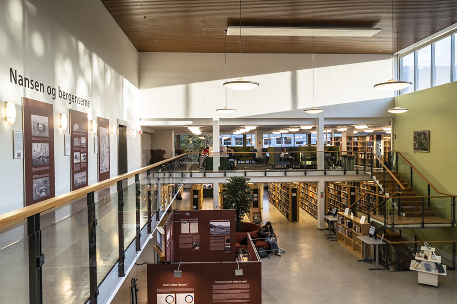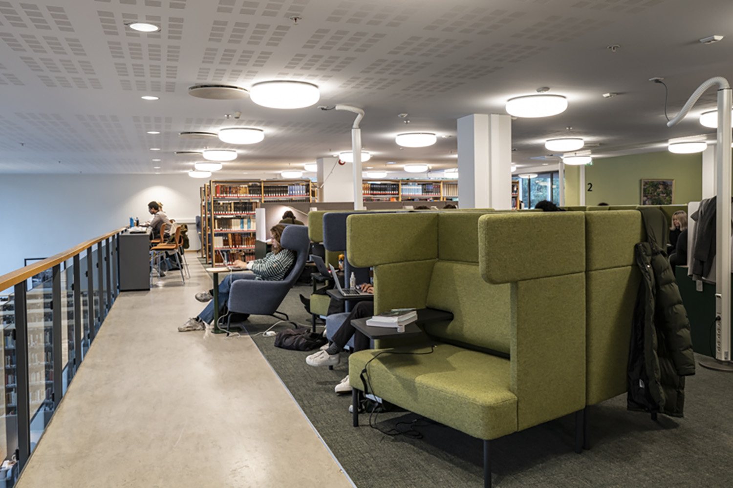 I inredningen har, förutom praktiska studieplatser, tyngdpunkten lagts på att skapa små, mysiga sittgrupper. Ett stort område möjliggör olika sorters utställningar och erbjuder enkel tillgång till informationssök.