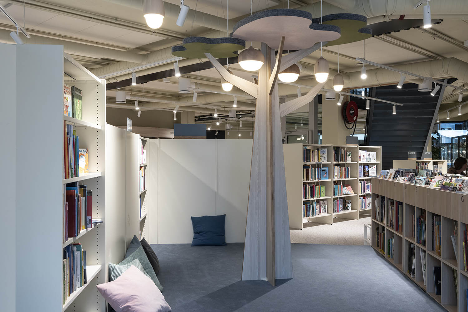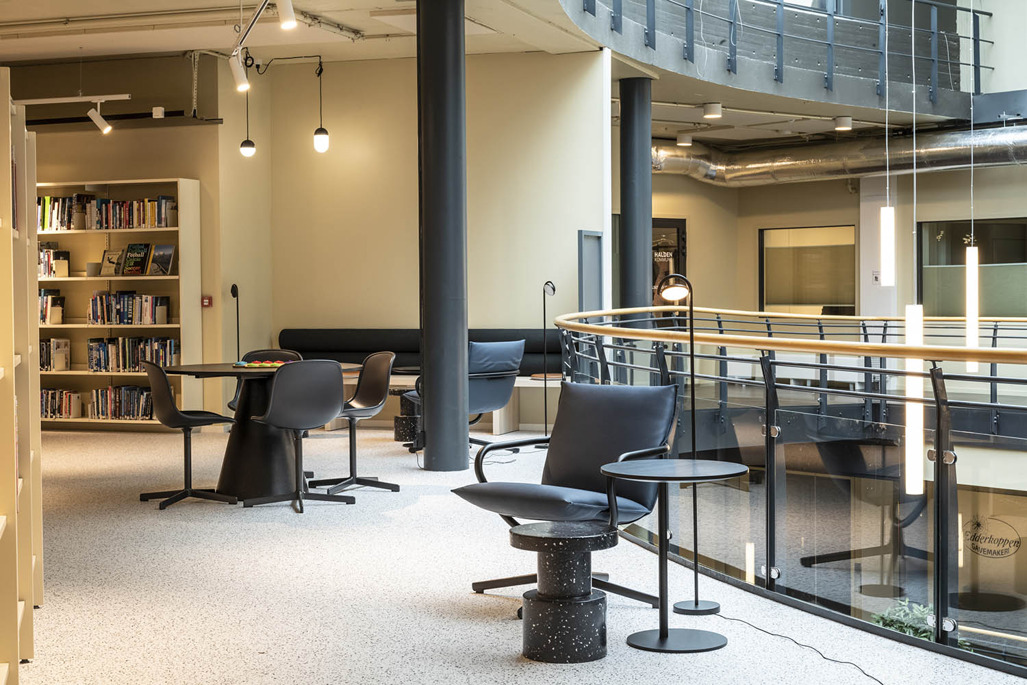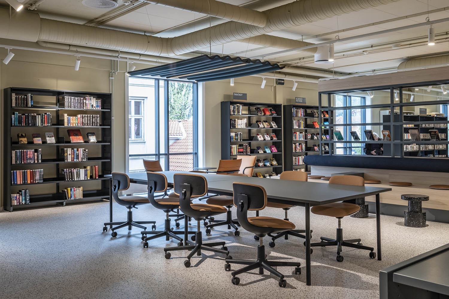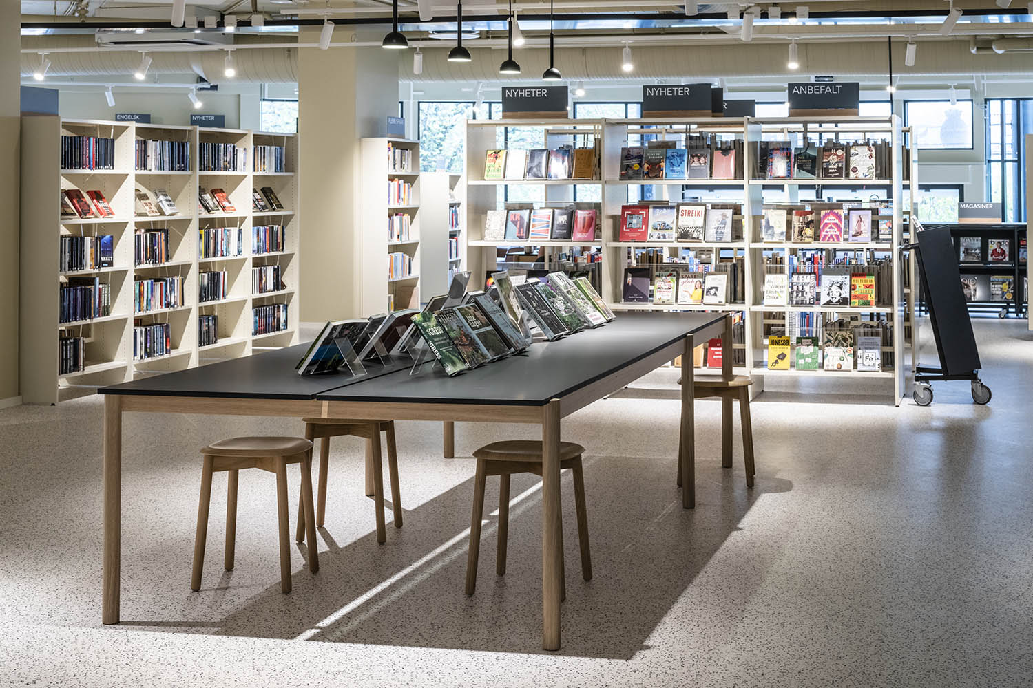 Generellt är biblioteket inrett med hyllor i både ljusa och mörka färger som kompletterar varandra och tillsammans med resten av möblerna skapar en inbjudande och mysig stämning med plats för alla besökare.