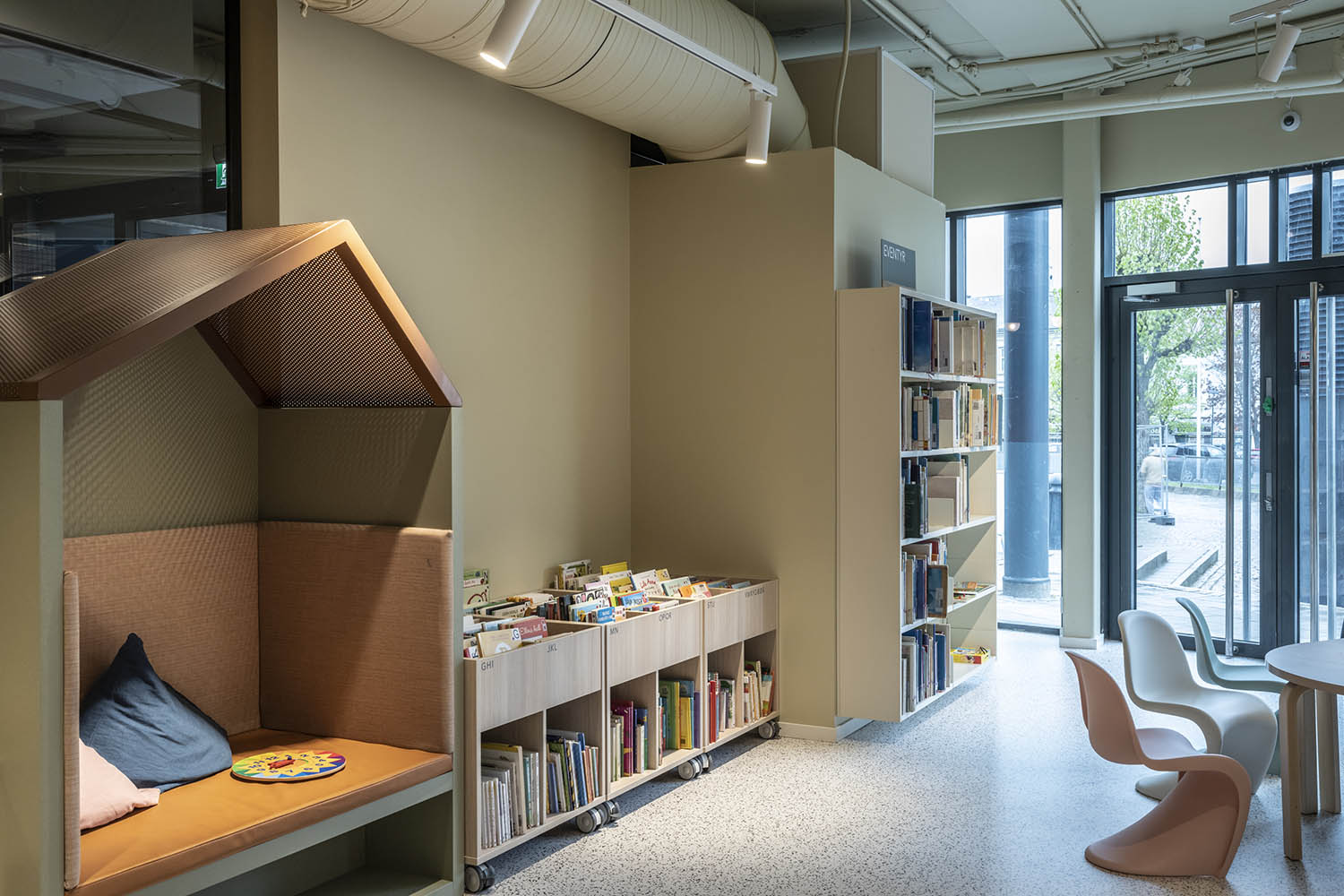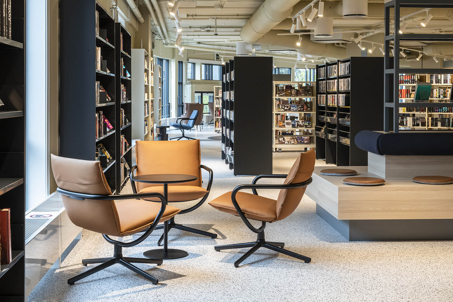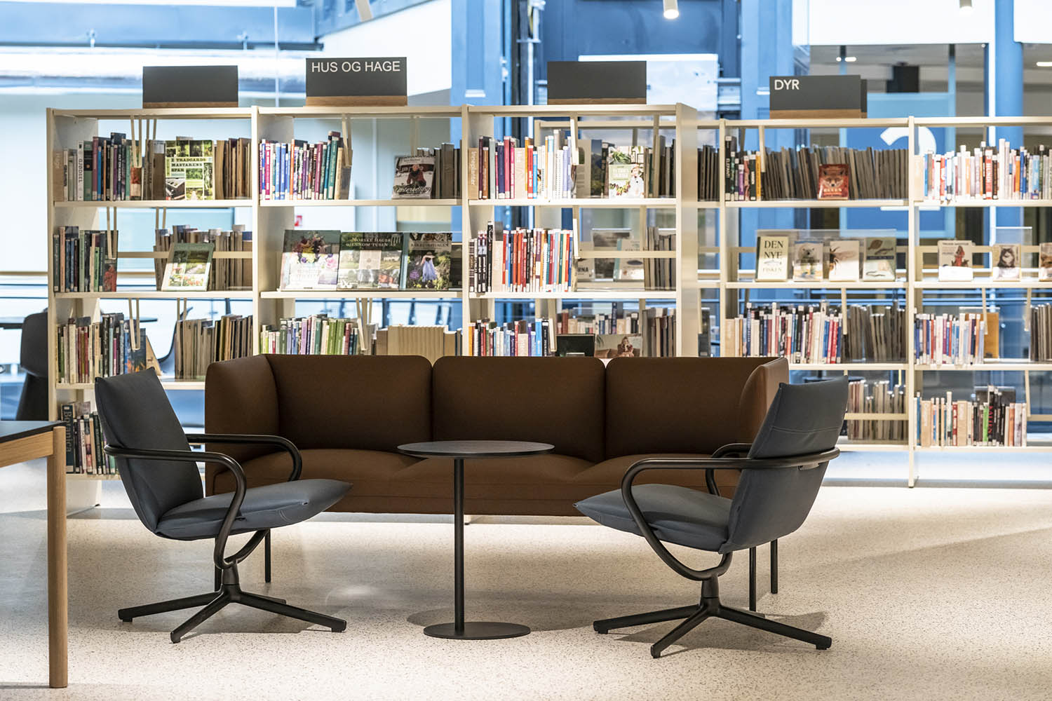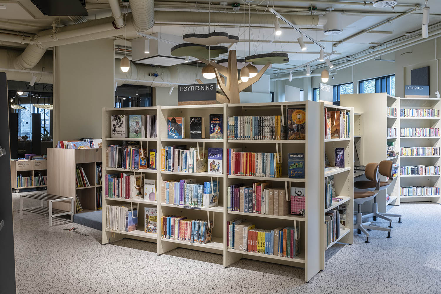 Generellt är biblioteket inrett med hyllor i både ljusa och mörka färger som kompletterar varandra och tillsammans med resten av möblerna skapar en inbjudande och mysig stämning med plats för alla besökare.