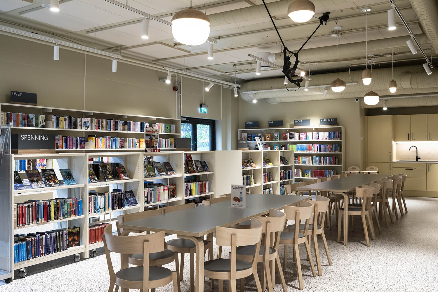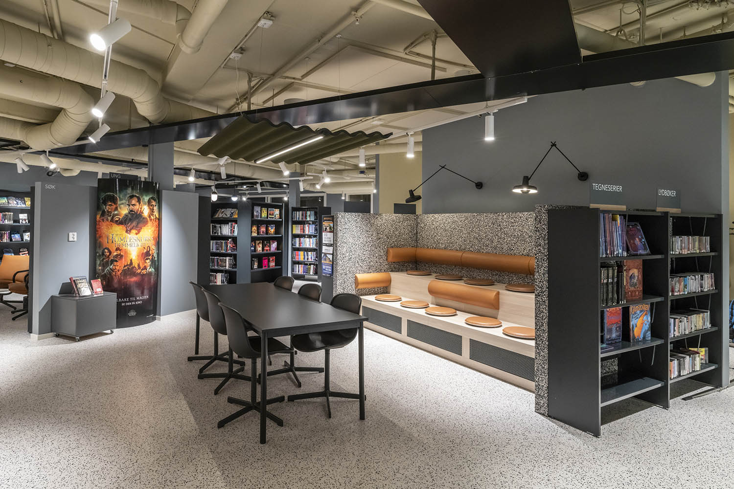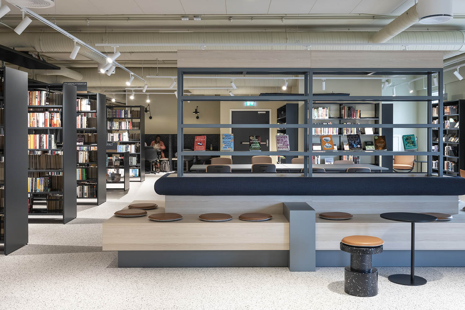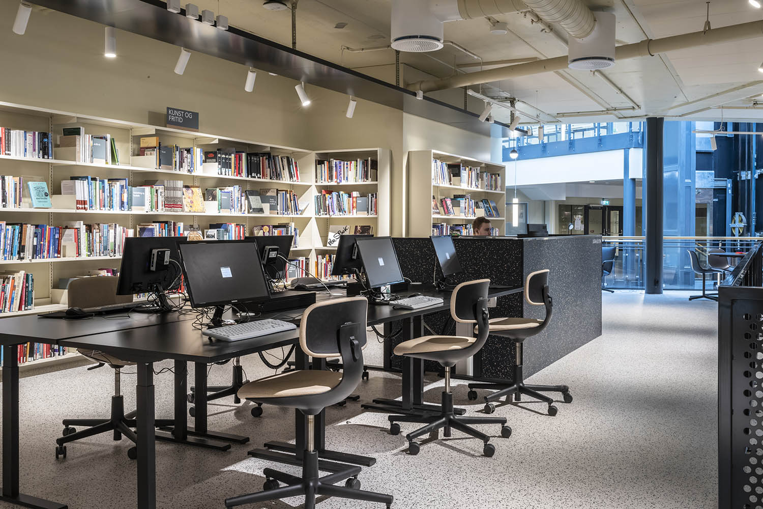 Generellt är biblioteket inrett med hyllor i både ljusa och mörka färger som kompletterar varandra och tillsammans med resten av möblerna skapar en inbjudande och mysig stämning med plats för alla besökare.