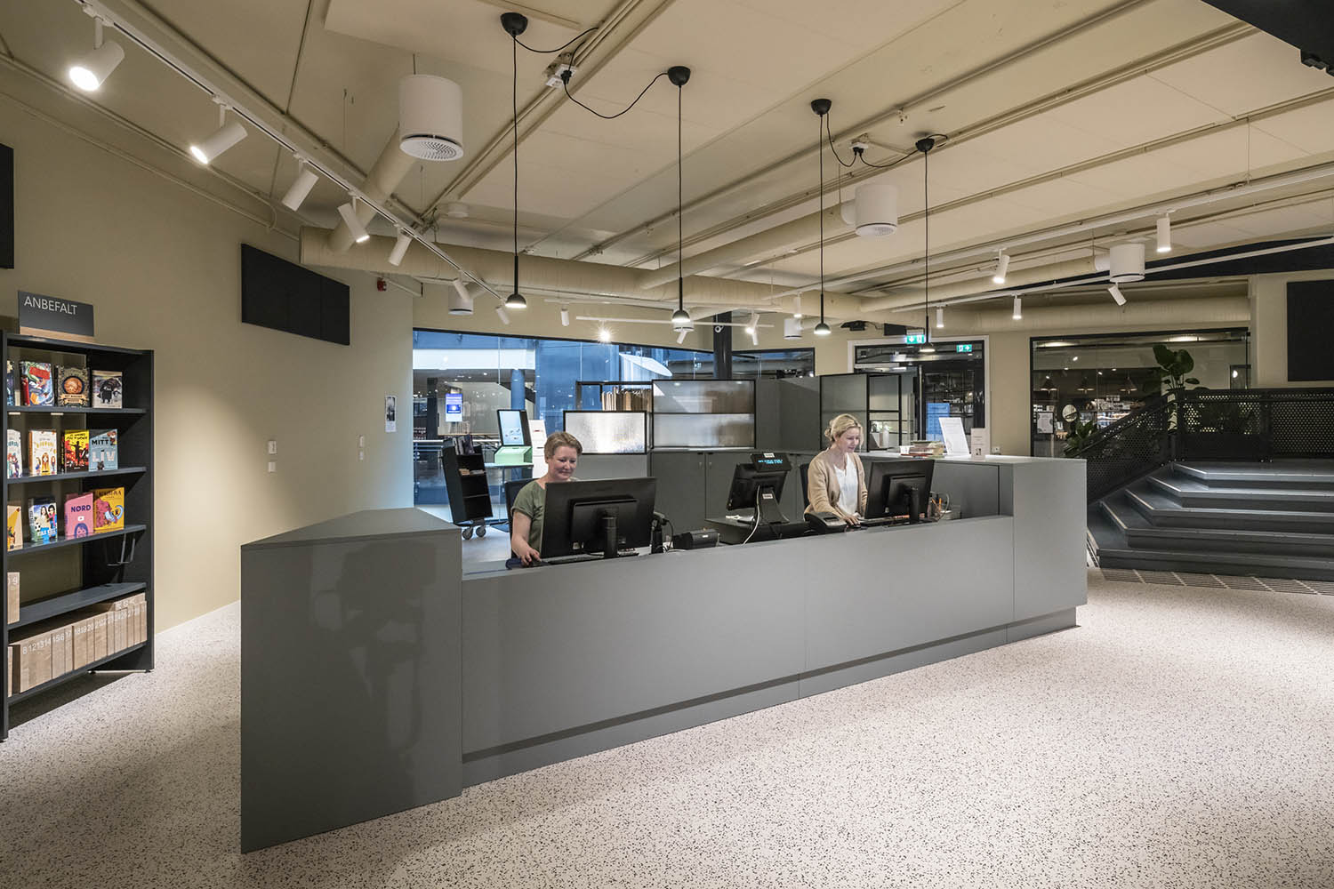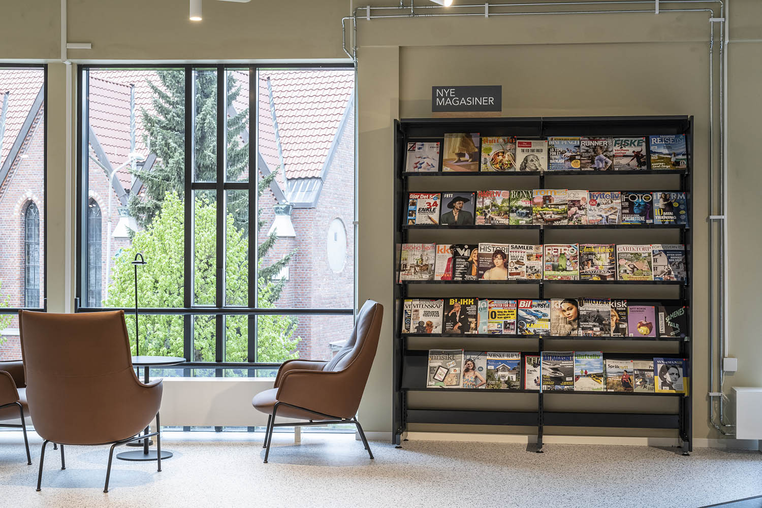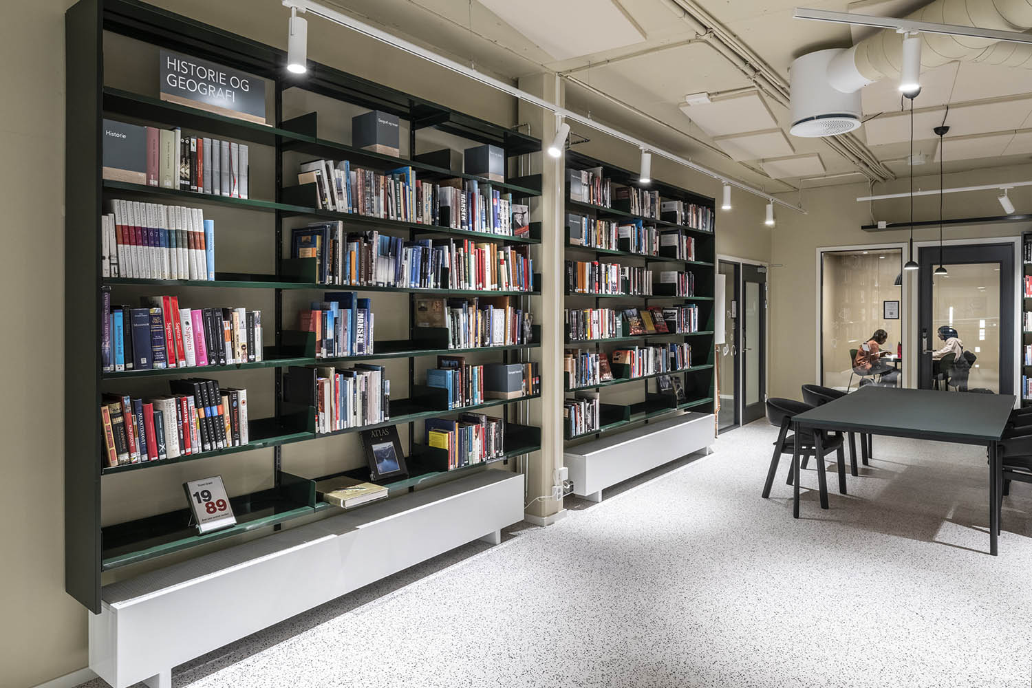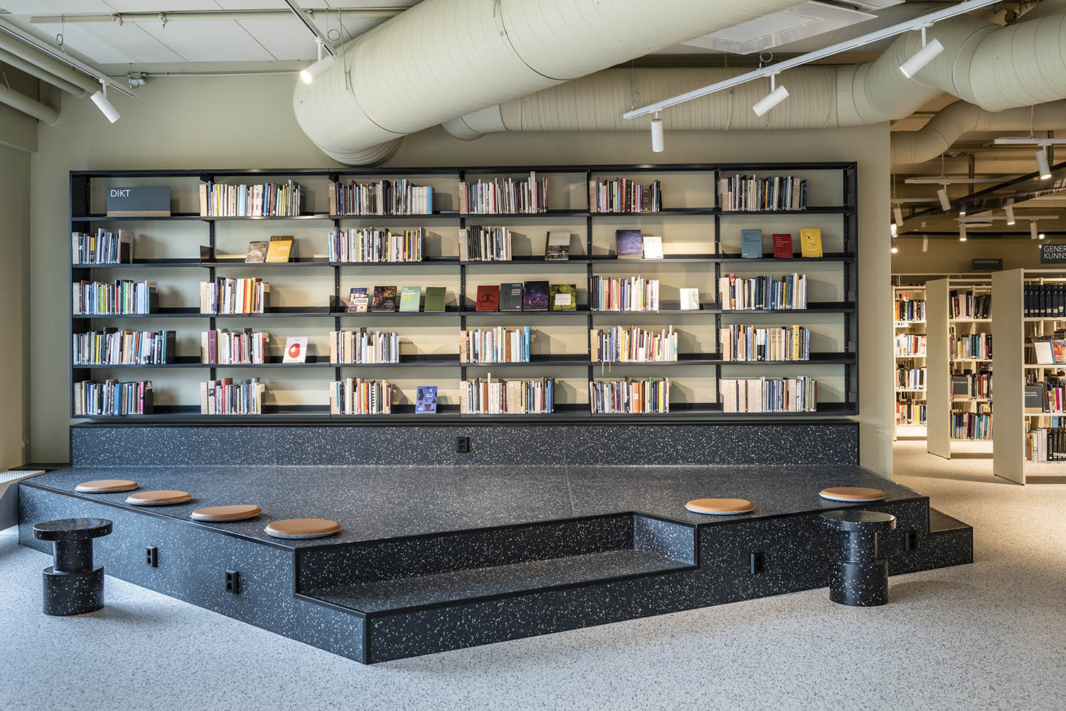 Generellt är biblioteket inrett med hyllor i både ljusa och mörka färger som kompletterar varandra och tillsammans med resten av möblerna skapar en inbjudande och mysig stämning med plats för alla besökare.