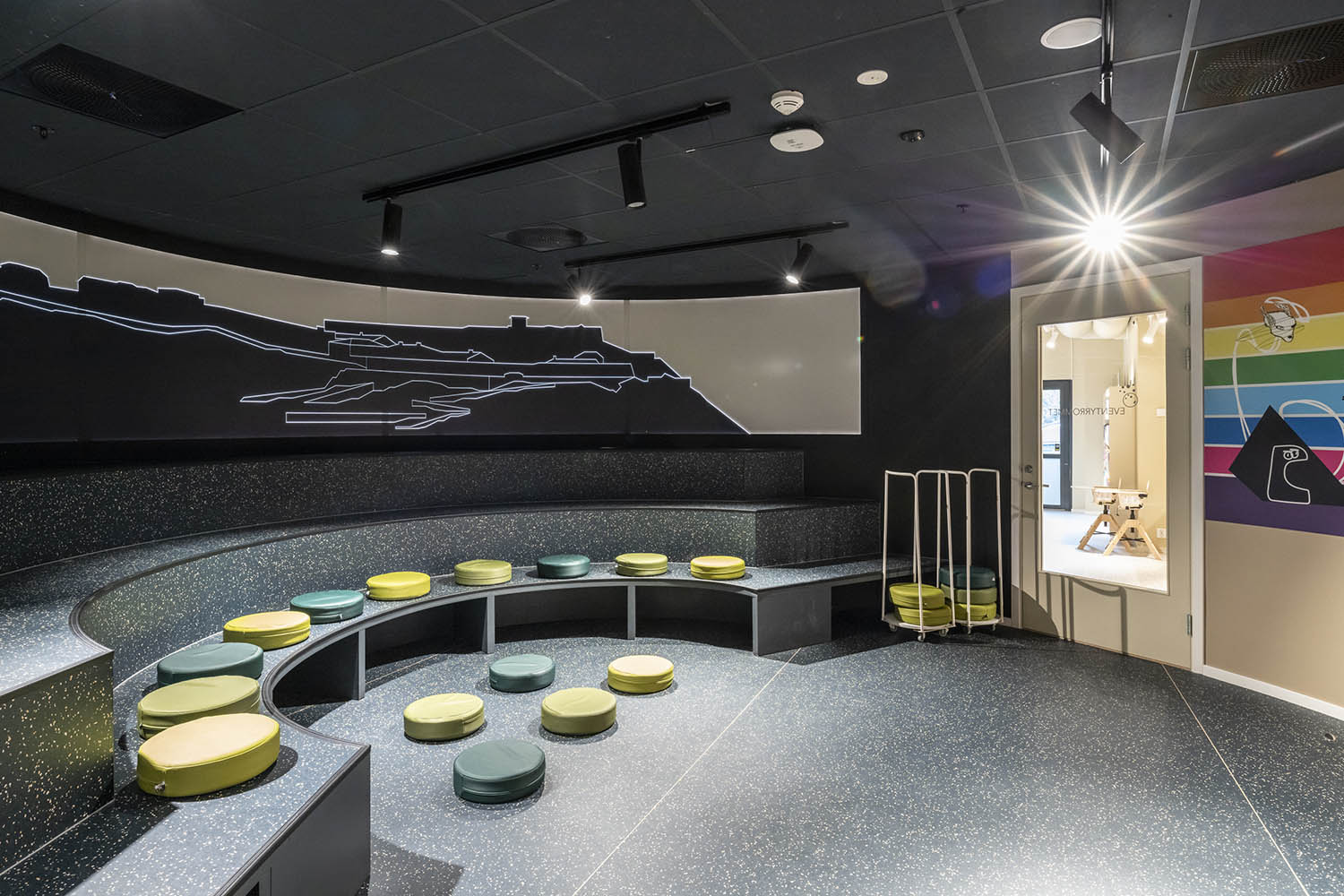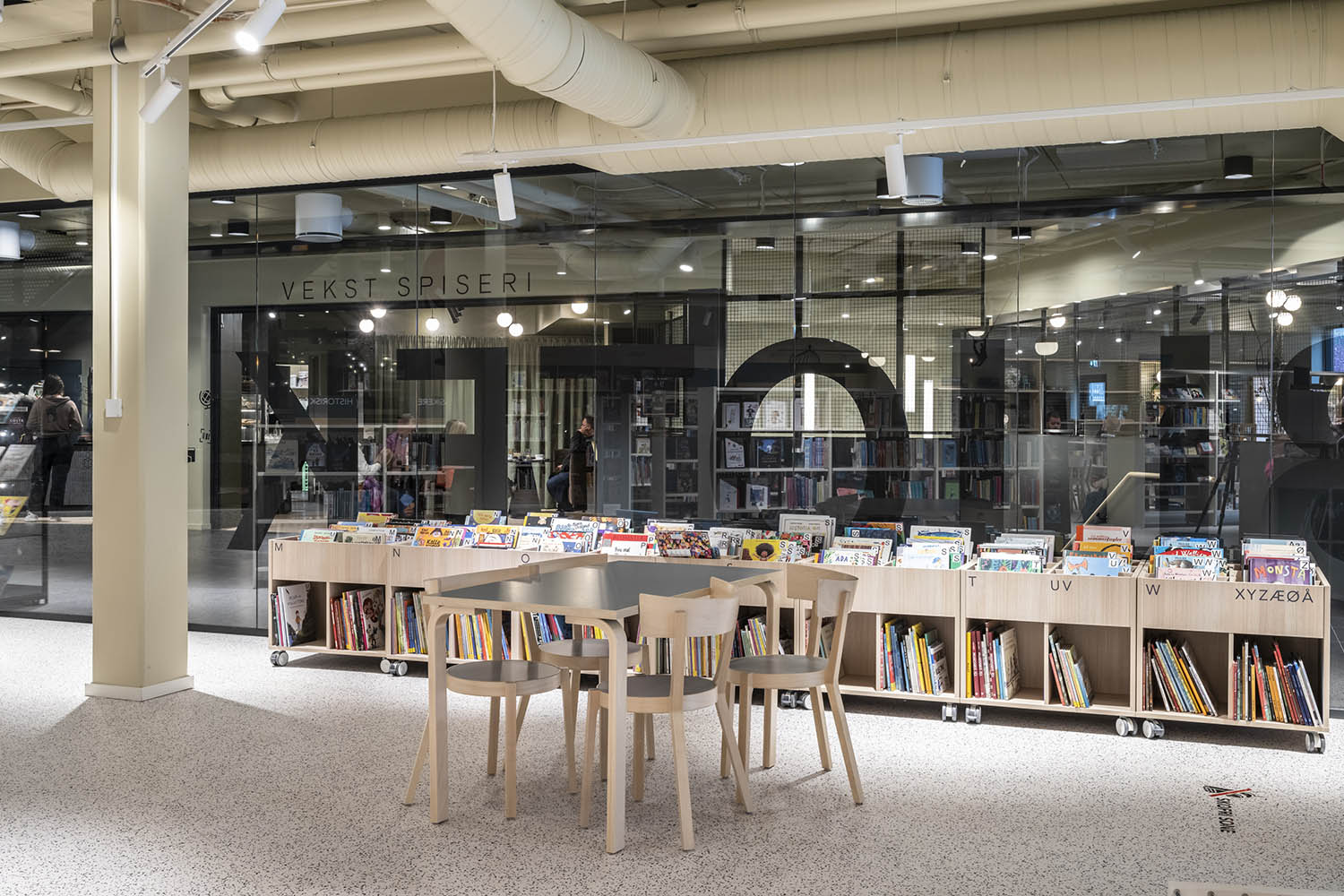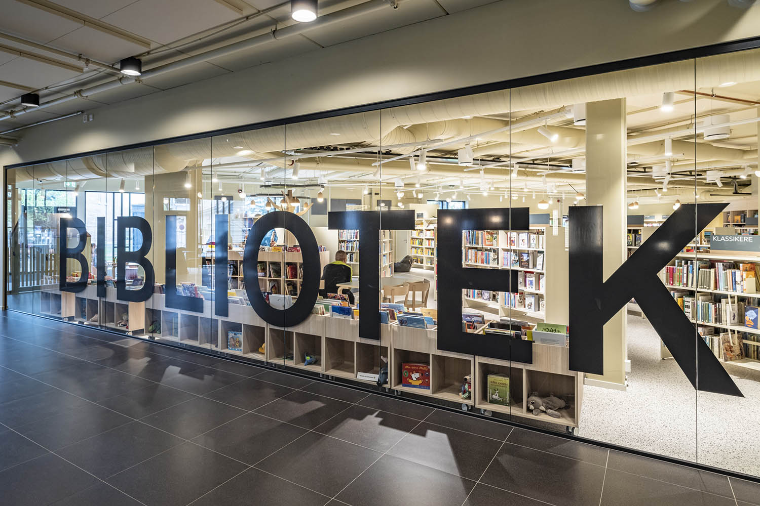 Biblioteket är uppdelat på två våningar och har blivit en varm oas i det nya kulturhuset. På bottenvåningen finns barn- och ungdomsavdelningen med egna zoner för barn och unga. Där finns bland annat ett spelrum samt ett äventyrsrum som erbjuder barnböcker. På samma våning finns också självbetjäningsautomater samt ett område för reserverat material.