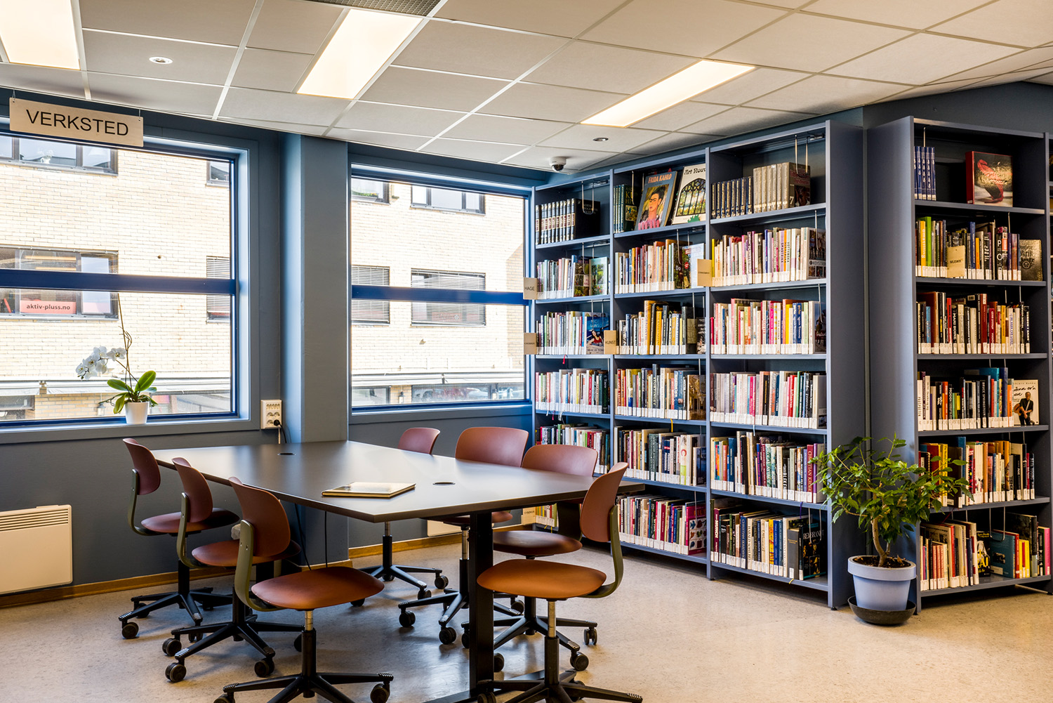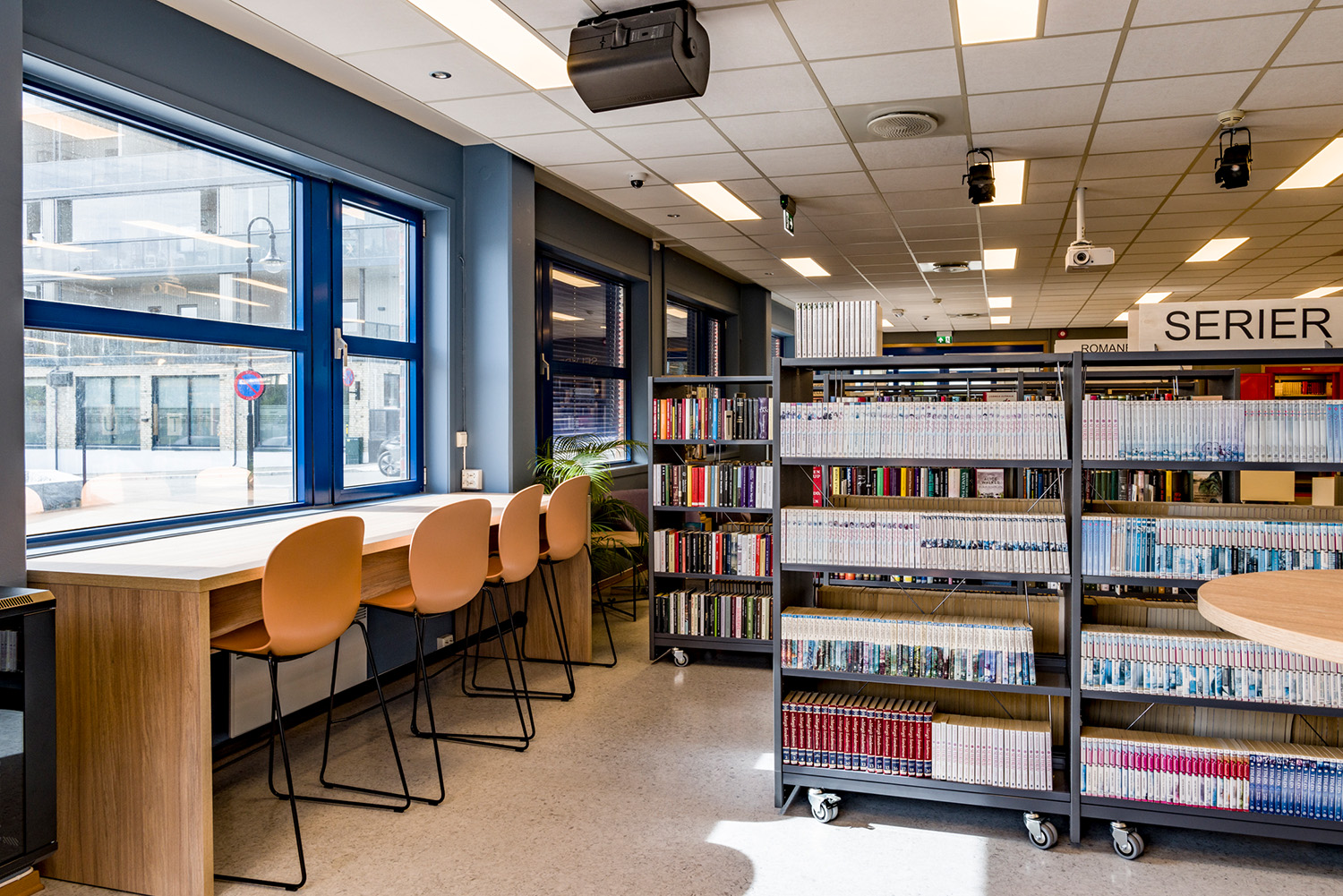 Under renoveringen har biblioteket också lagt stor vikt vid återbruk. En del möbler och hyllor har renoverats eller anpassats i stället för att bytas ut. Antalet sittplatser har ökat avsevärt, och verkstadsområdet har ett stort arbetsbord som är redo för kurser, kreativt samarbete och spännande projekt. Här kan du också låna allt från symaskiner till spel och leksaker – perfekt för både barn och vuxna som vill utforska och skapa tillsammans.
