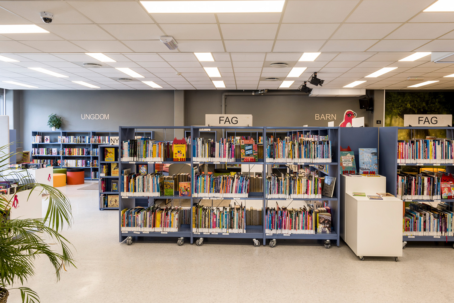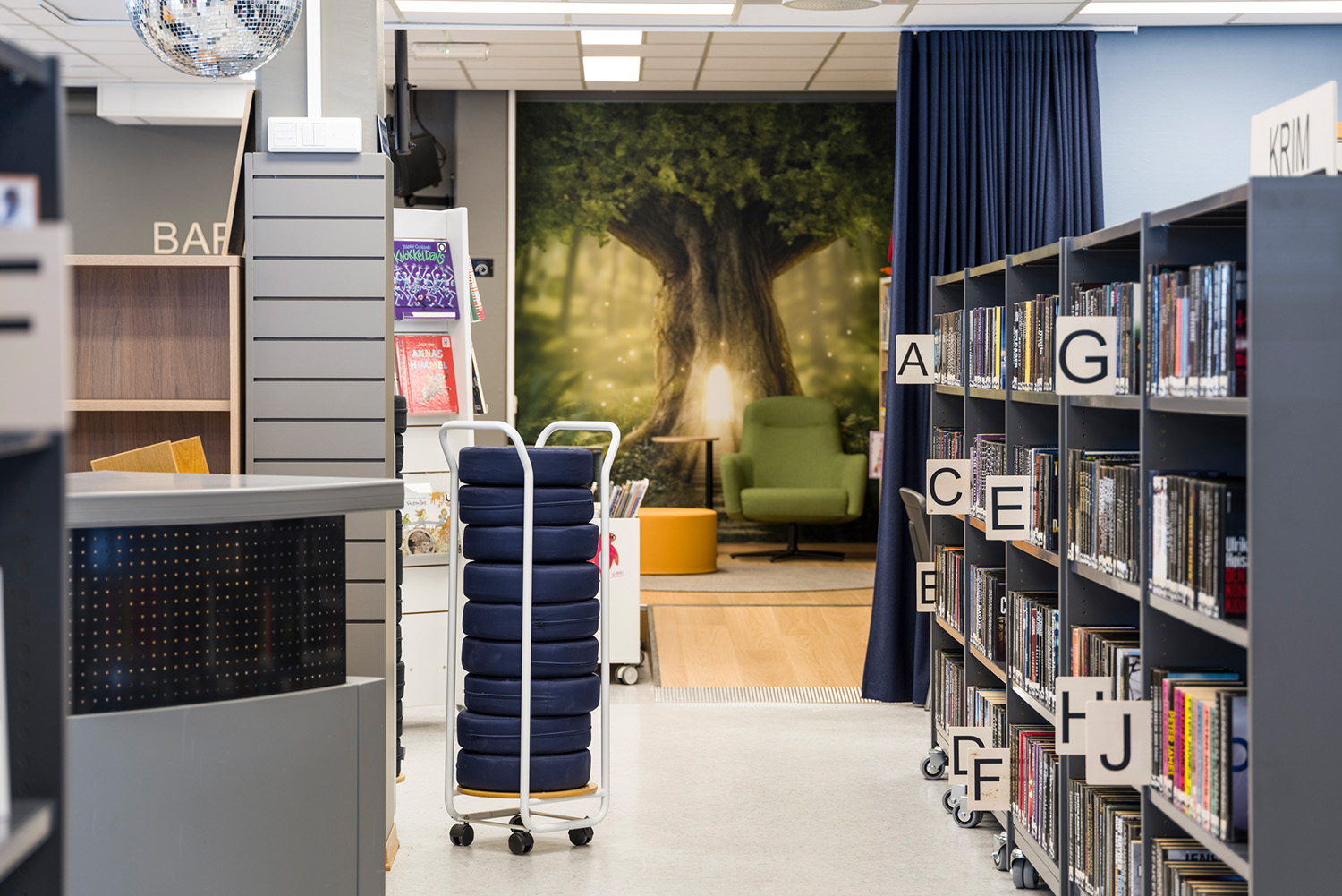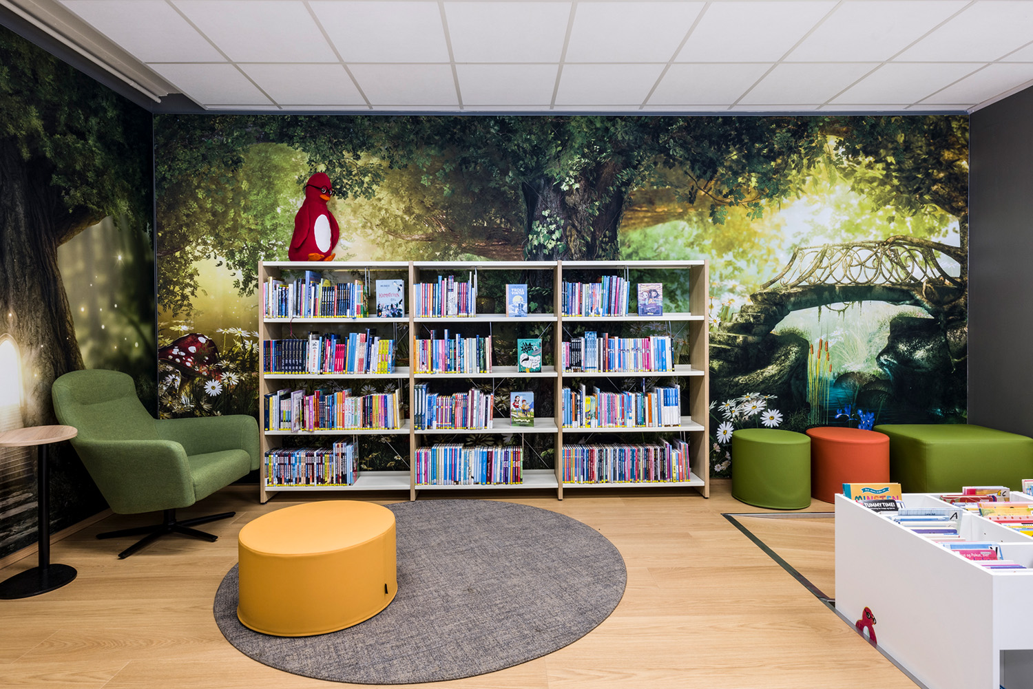 I bakre delen av barnavdelningen har biblioteket sin egen lilla magiska skog. Med väggdekorationer och en platsbyggd scen har rummet blivit den perfekta platsen för berättande, teaterlekar och andra upplevelser. De flyttbara bokhyllorna och mjuka sittpuffarna gör det enkelt att förvandla området – från en förtrollad skog till en läshörna eller en kultur scen – beroende på behovet.