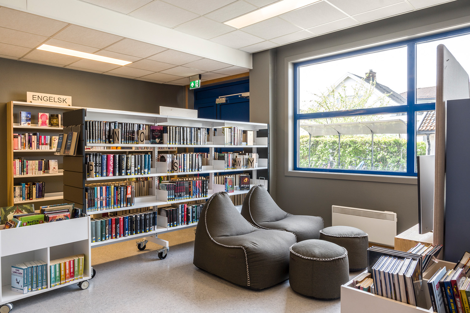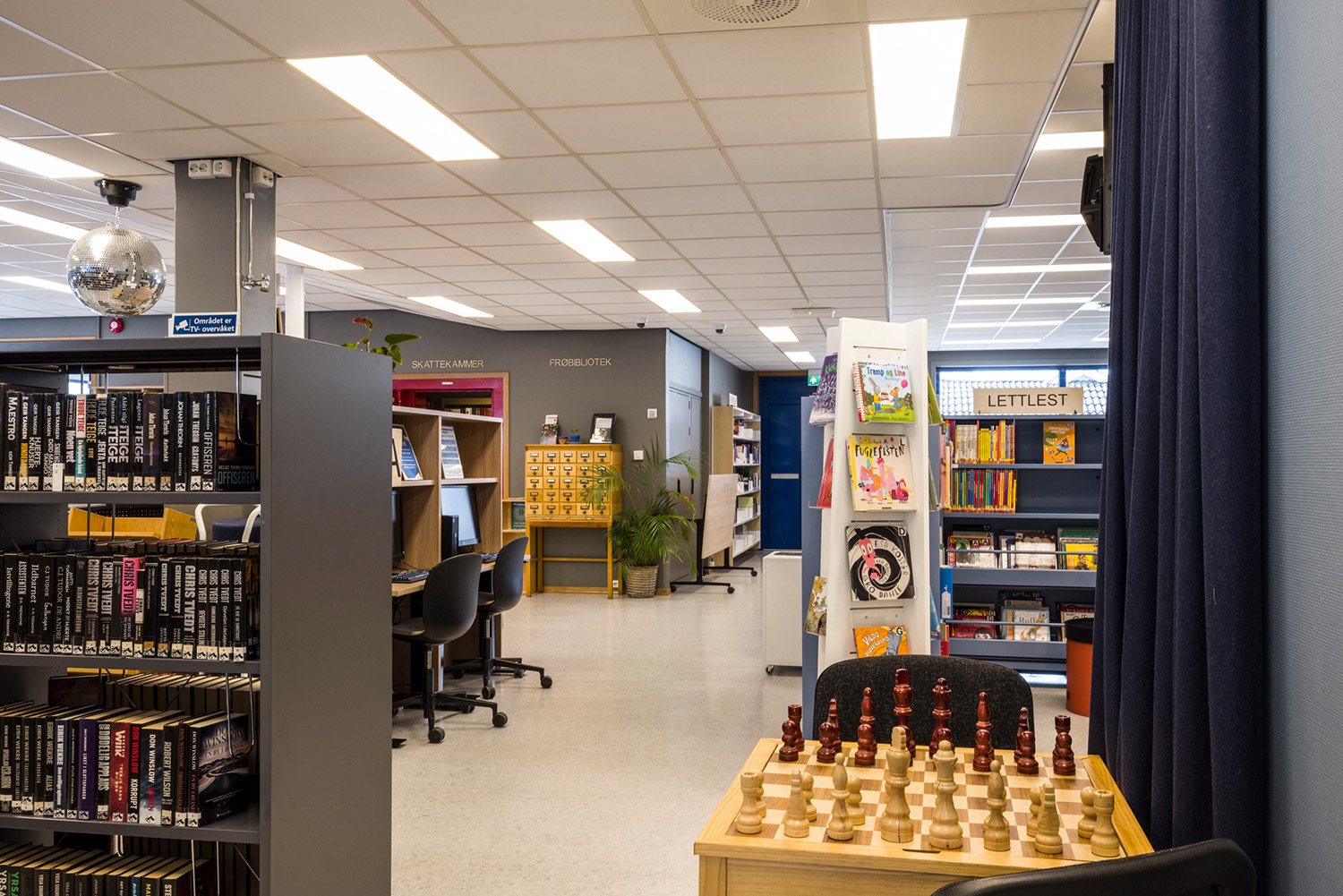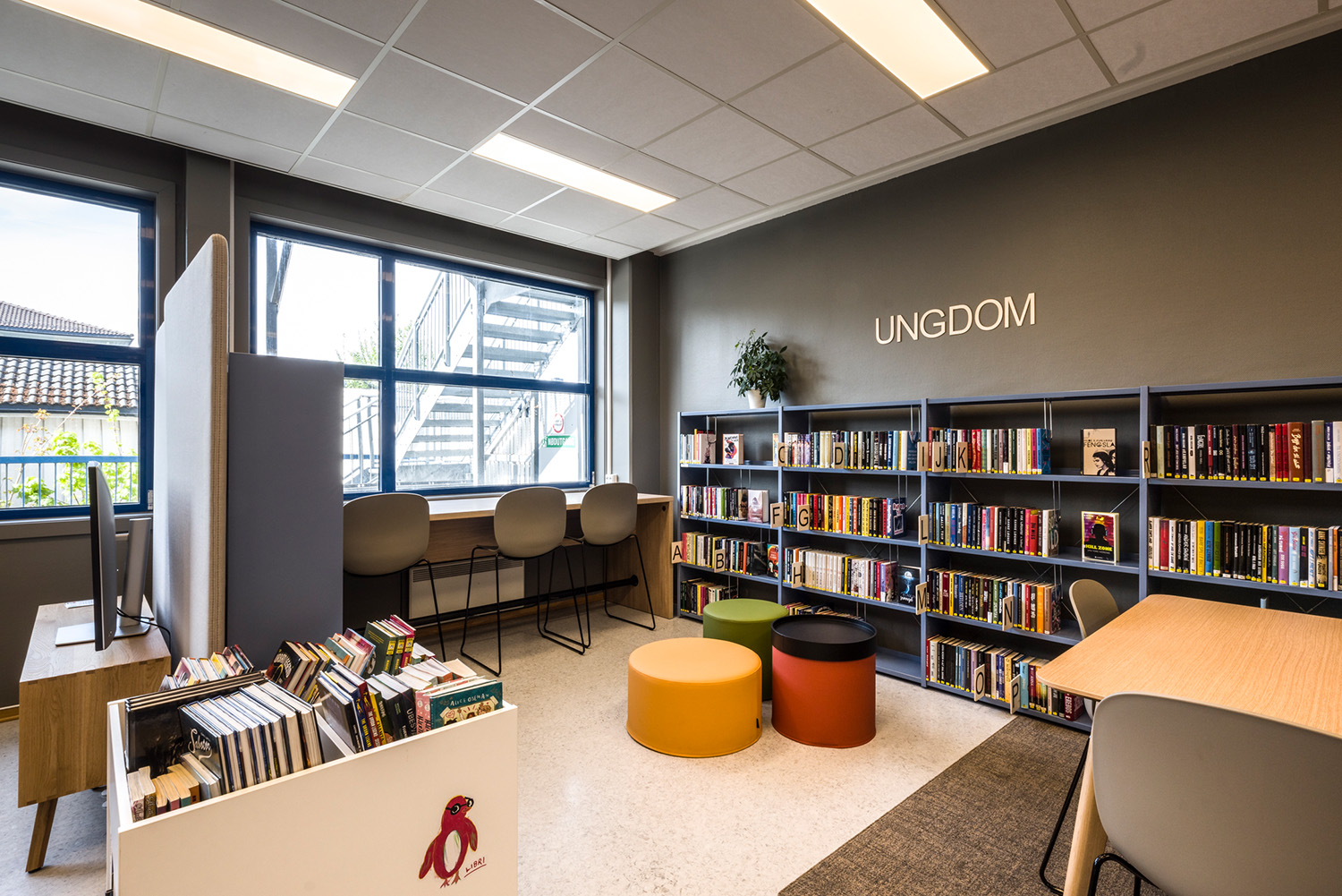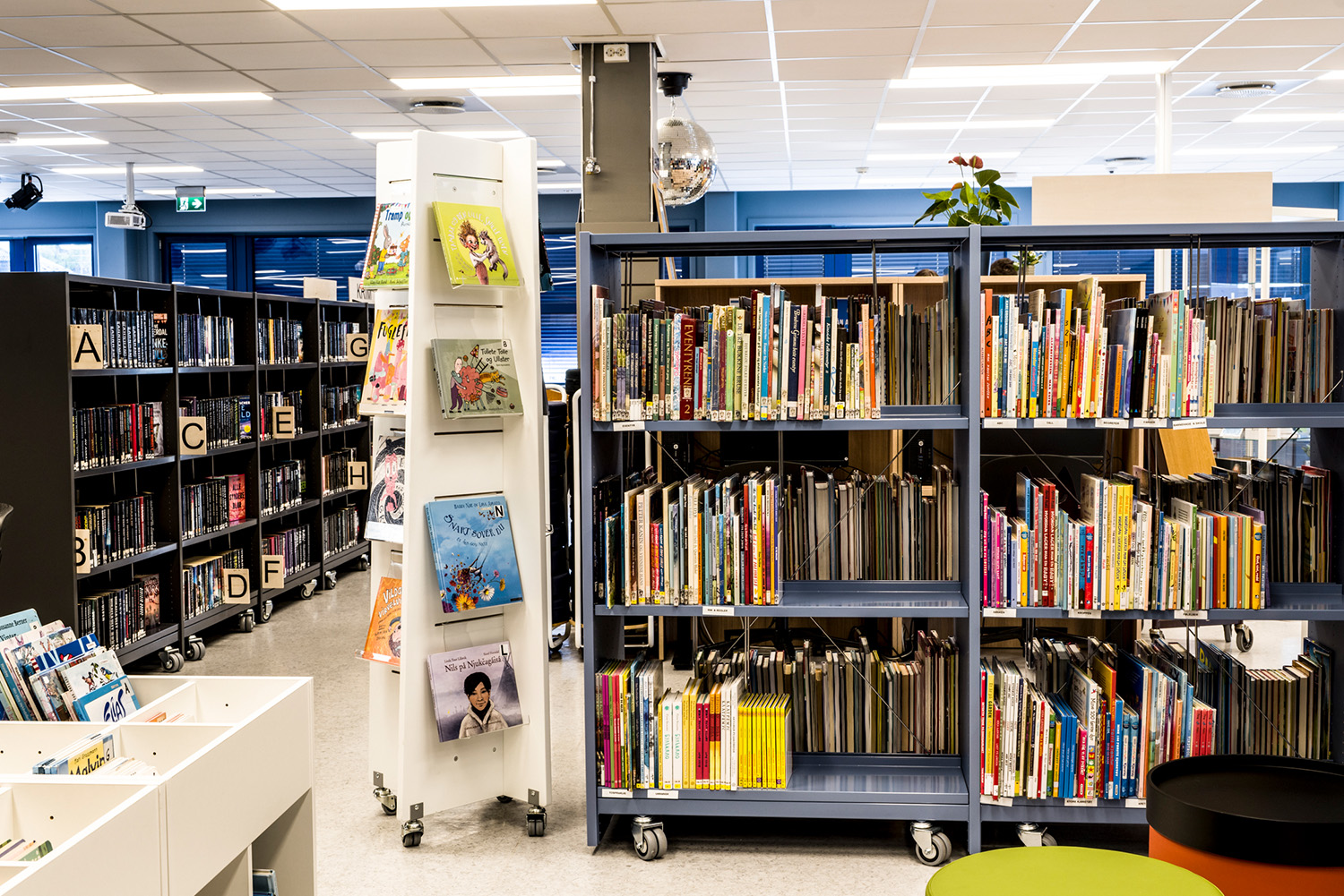 I bakre delen av barnavdelningen har biblioteket sin egen lilla magiska skog. Med väggdekorationer och en platsbyggd scen har rummet blivit den perfekta platsen för berättande, teaterlekar och andra upplevelser. De flyttbara bokhyllorna och mjuka sittpuffarna gör det enkelt att förvandla området – från en förtrollad skog till en läshörna eller en kultur scen – beroende på behovet.