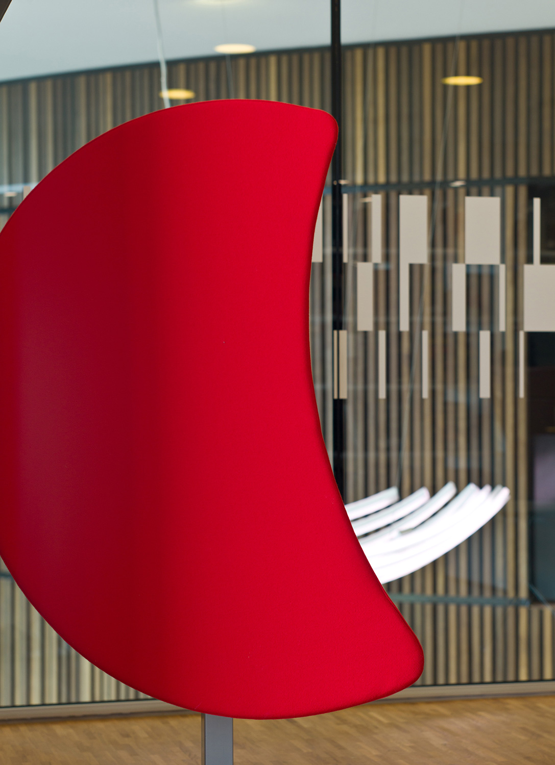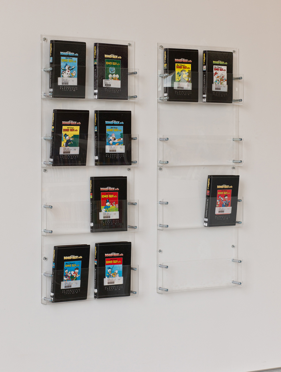 att de lutar är varje hyllplan från nedersta nivån och uppåt placerat aningen innanför den under. Kombinationen – plus LED-belysning – gör det lätt att se böckerna. Den visuella effekten är mycket iögonenfallande.