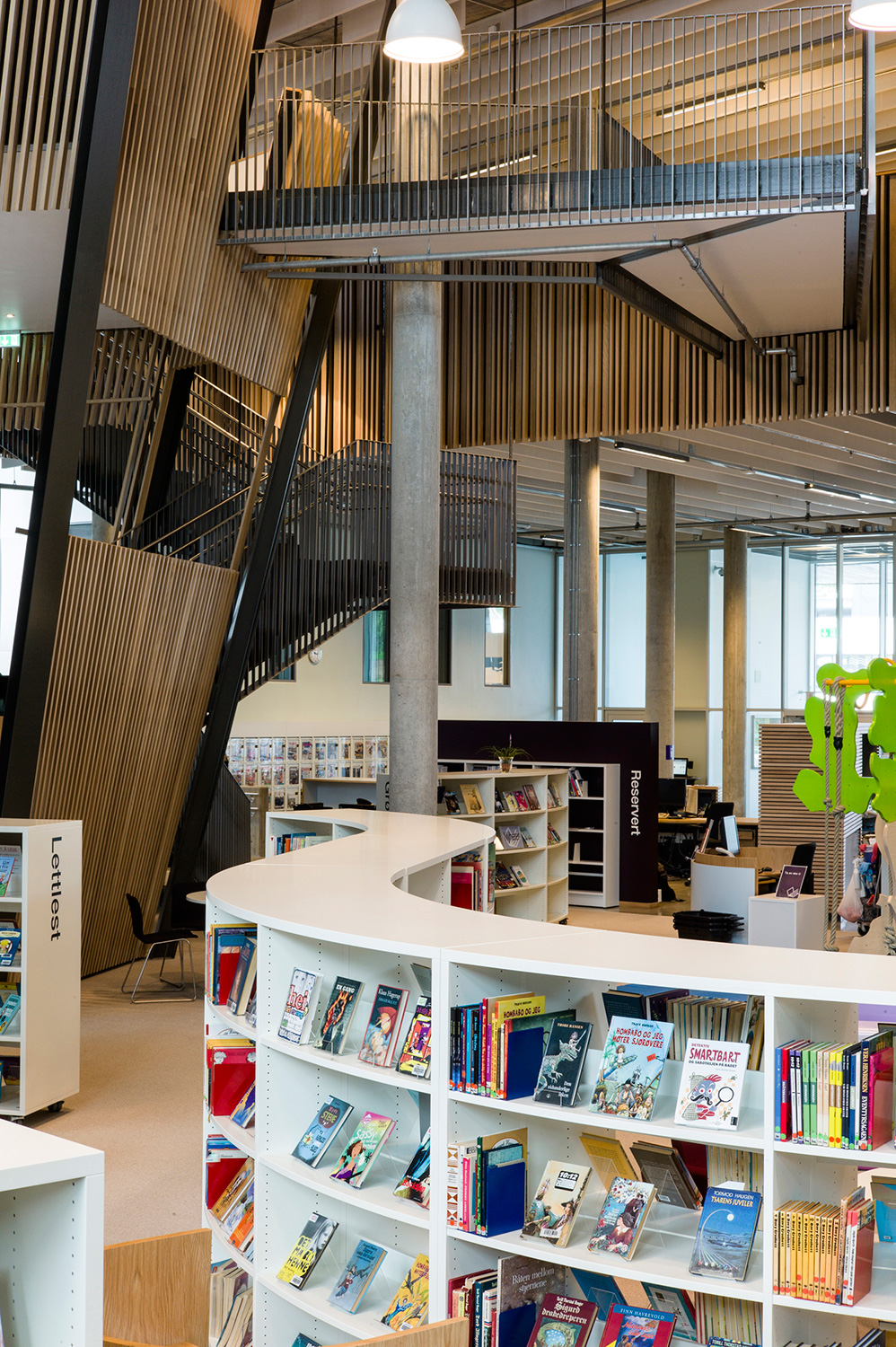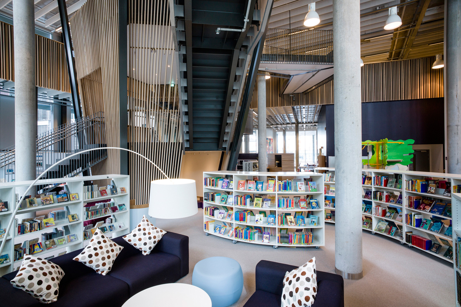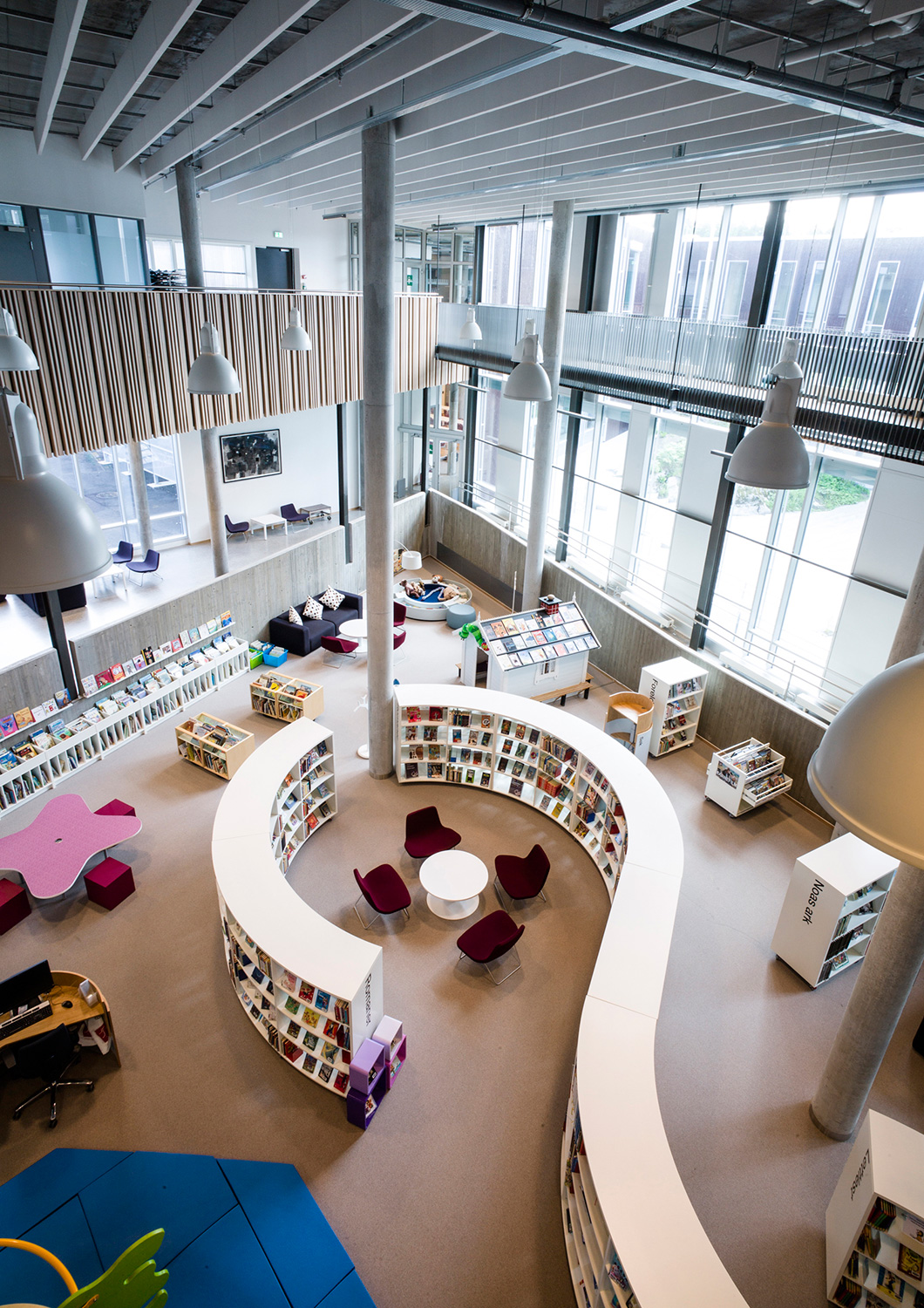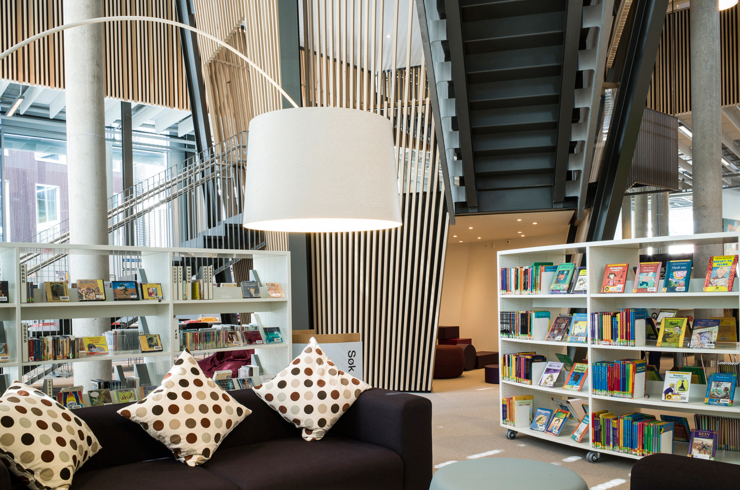 Det är ett bibliotek som kännetecknas av nytänkande med organiska former och mjuka kurvor. Det visar sig inte bara i arkitekturen utan också i hyllinredningen som följer den organiska formen. Där är massor av läsbord och bekväma sittplatser, informationspunkter och självbetjäningsstationer, vilka göra biblioteket till er sant nöje för besökarna.