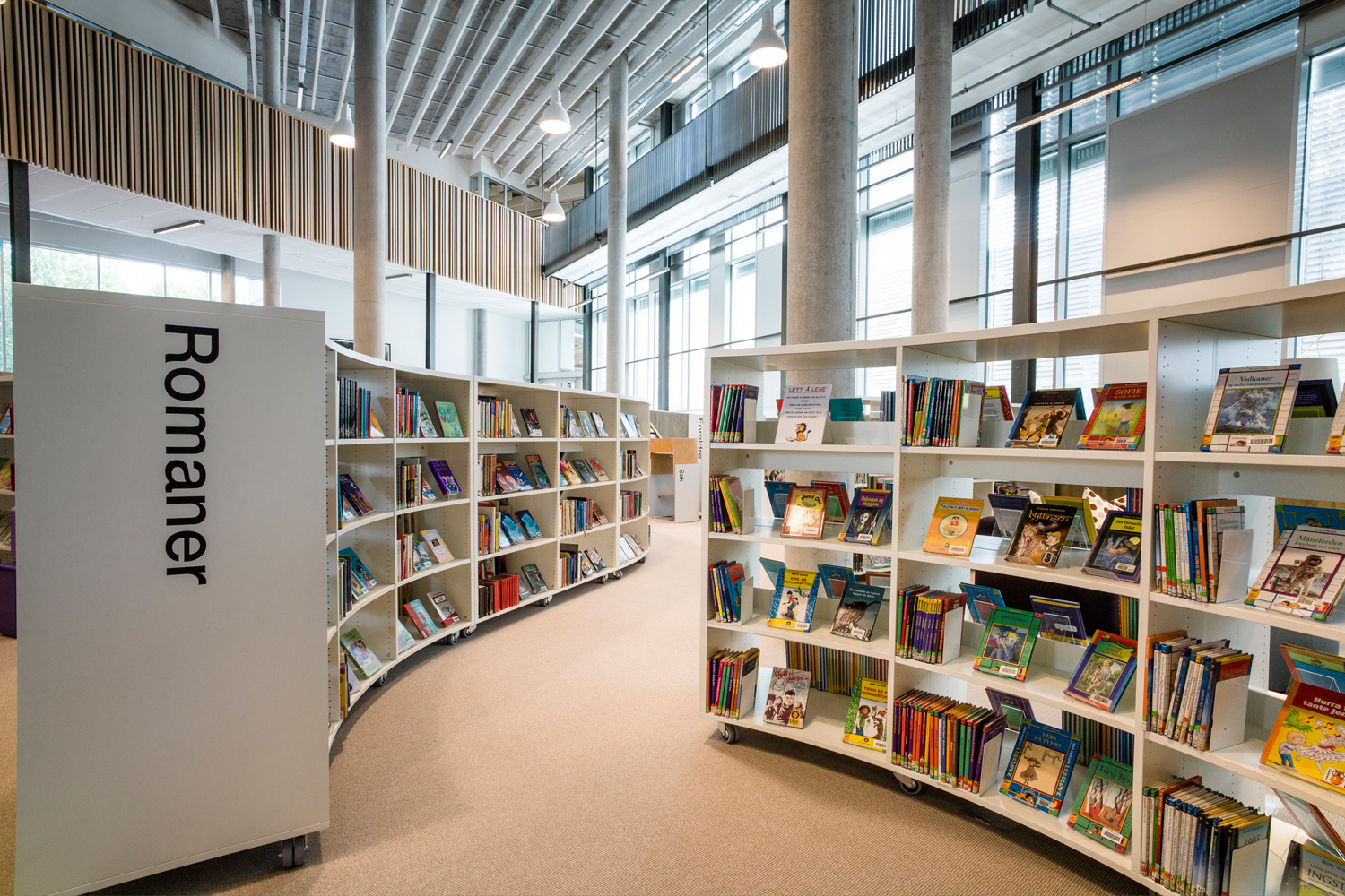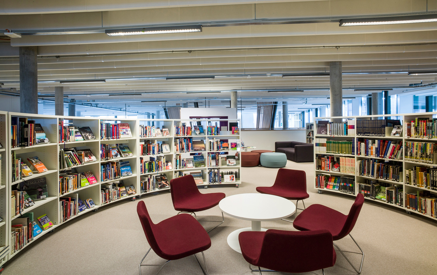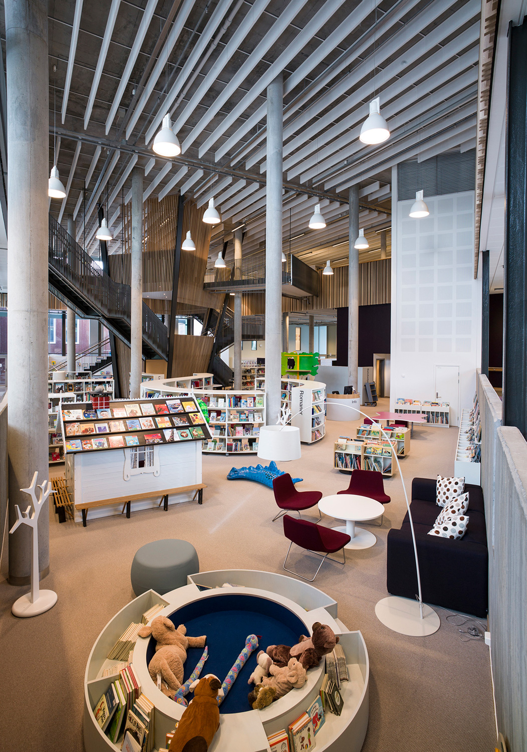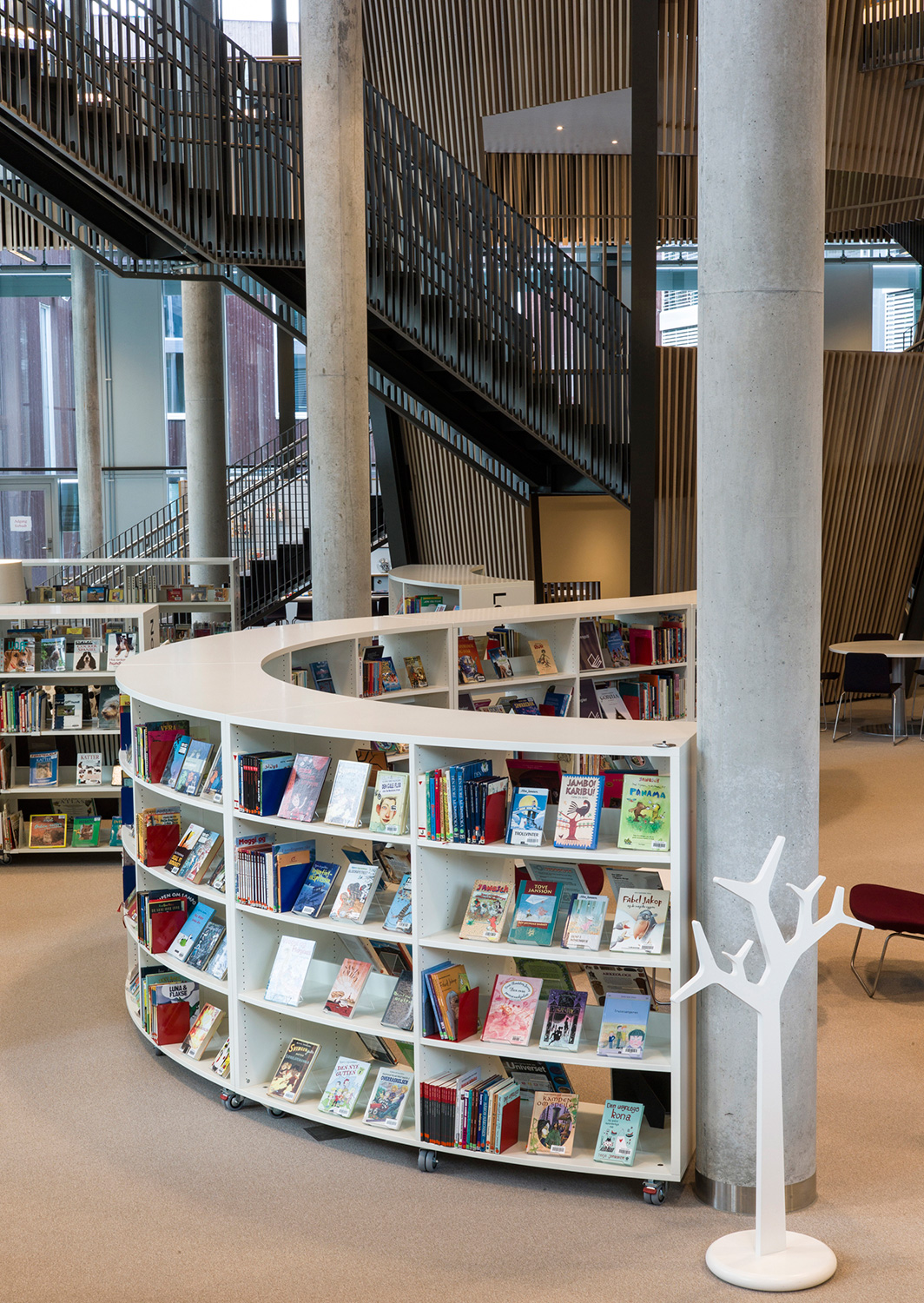Det är ett bibliotek som kännetecknas av nytänkande med organiska former och mjuka kurvor. Det visar sig inte bara i arkitekturen utan också i hyllinredningen som följer den organiska formen. Där är massor av läsbord och bekväma sittplatser, informationspunkter och självbetjäningsstationer, vilka göra biblioteket till er sant nöje för besökarna.