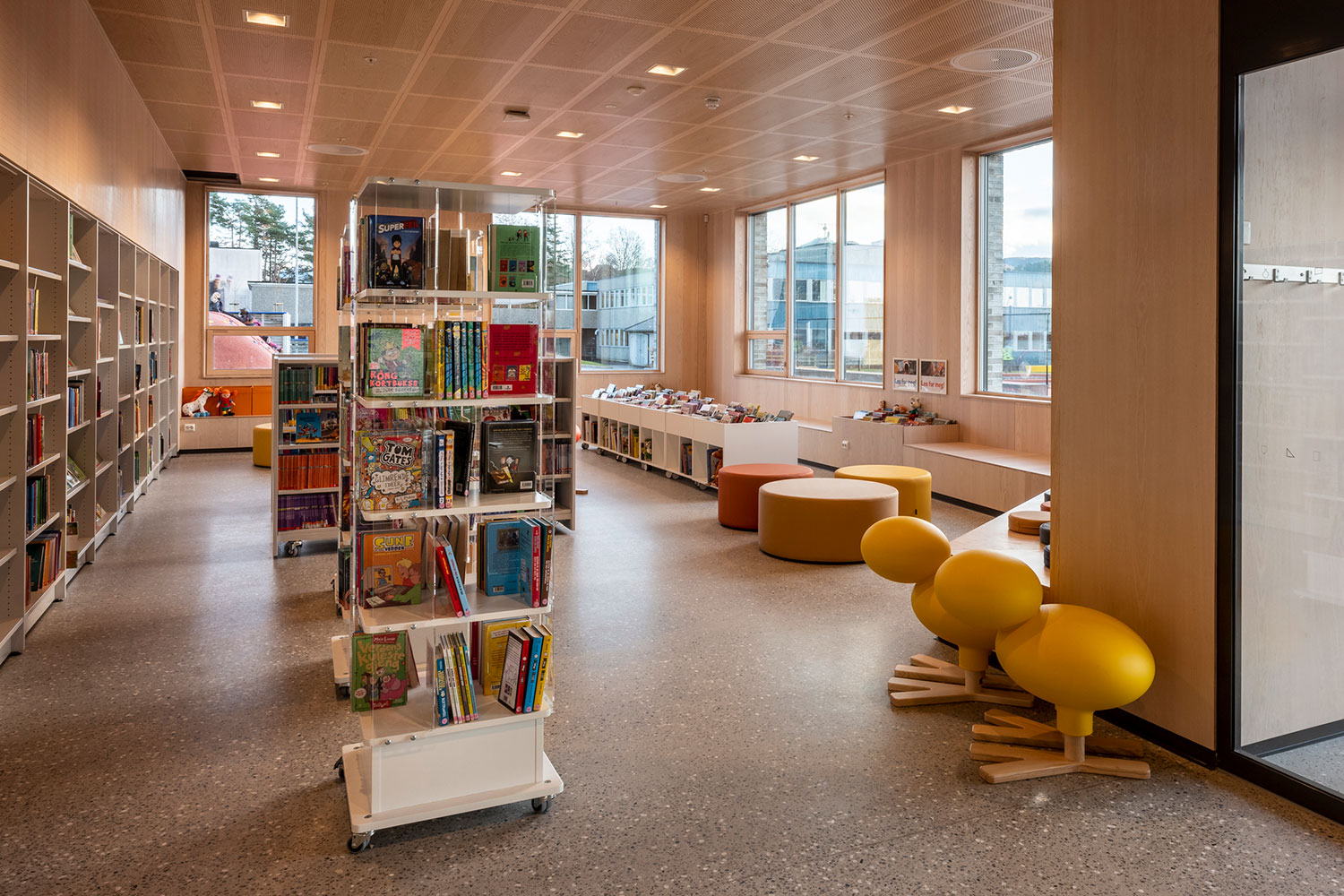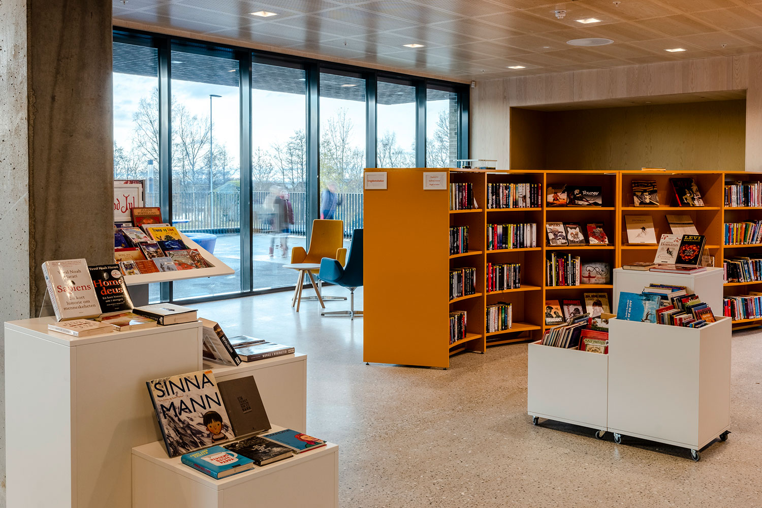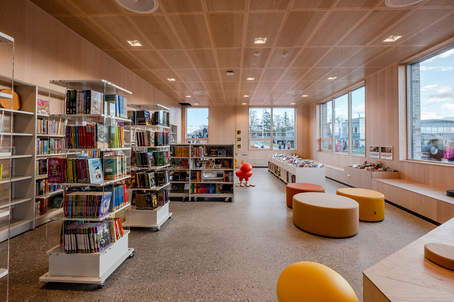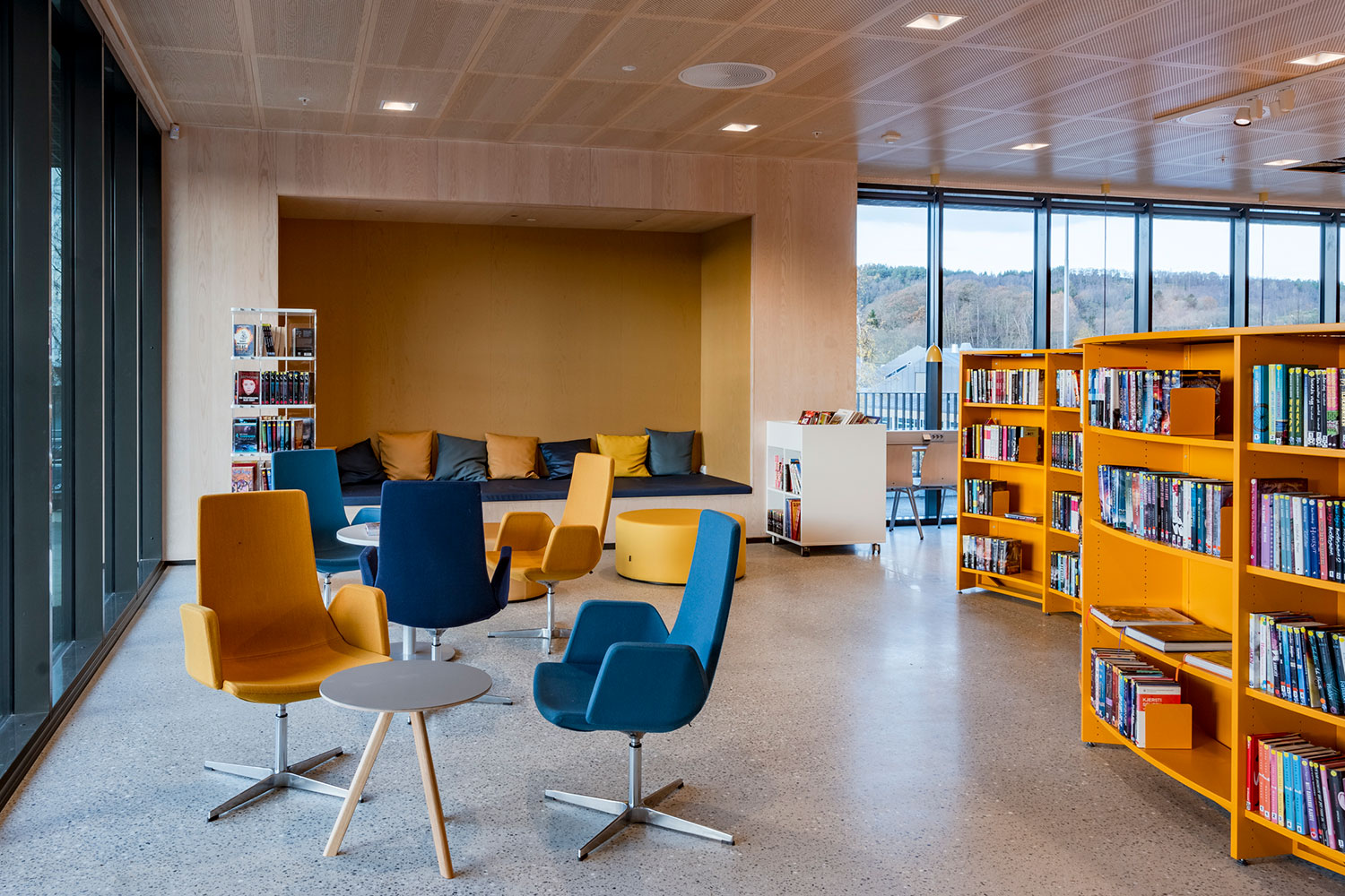 Organiska former på delar av inredningen, tillsammans med varma interiörfärger ger biblioteksrummet en modern och inbjudande känsla.