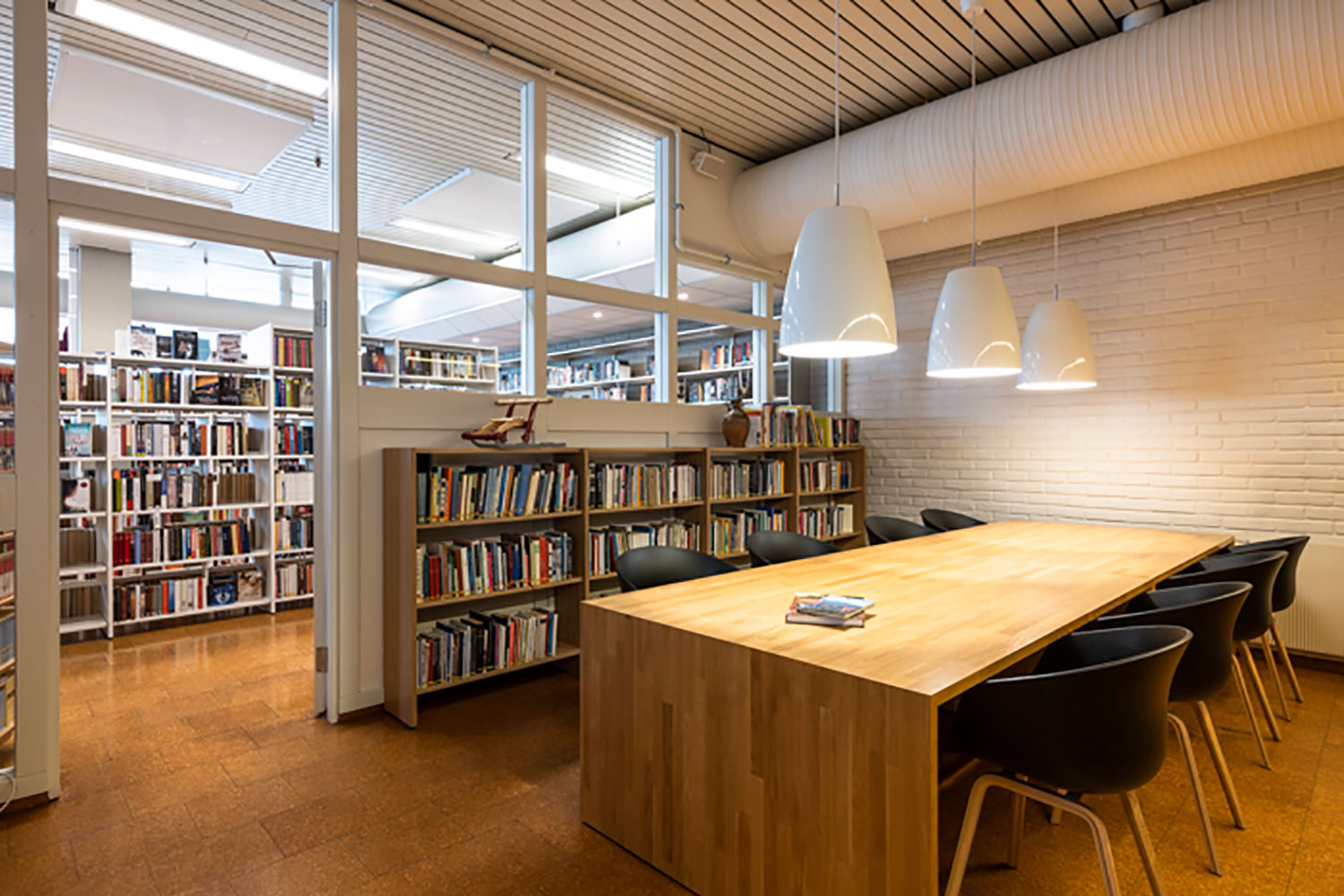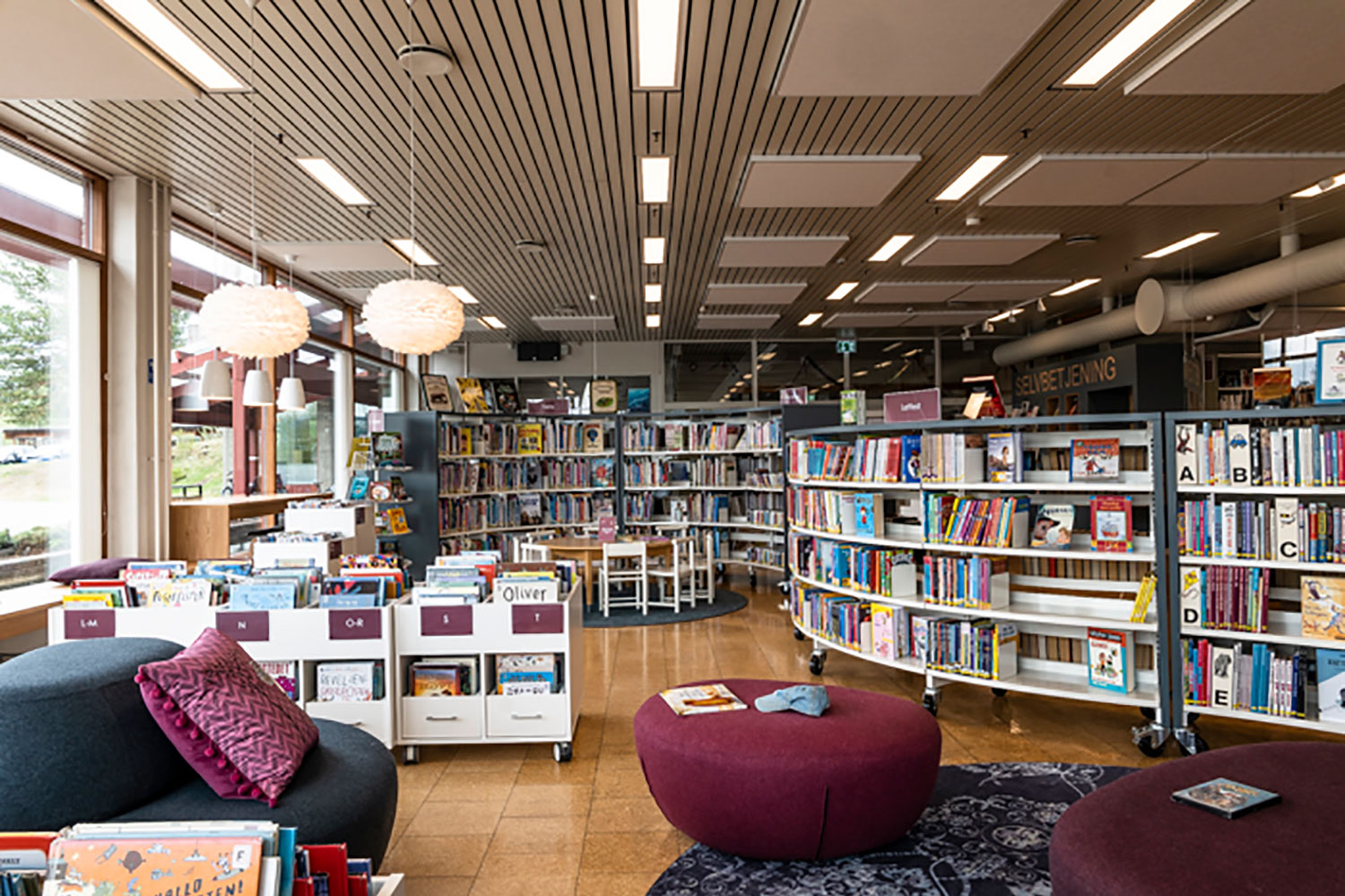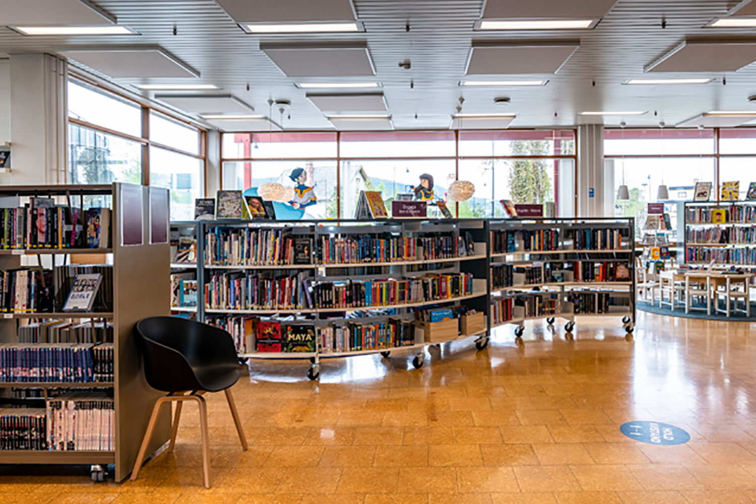 Flyttbara hyllskepp och möbler på hjul ger stor flexibilitet när lokalerna ska användas till arrangemang och aktiviteter. De högsta hyllorna är placerade längs väggarna och lägre hyllor används fristående runtomkring så att biblioteksrummet framstår som inbjudande med god överblick.