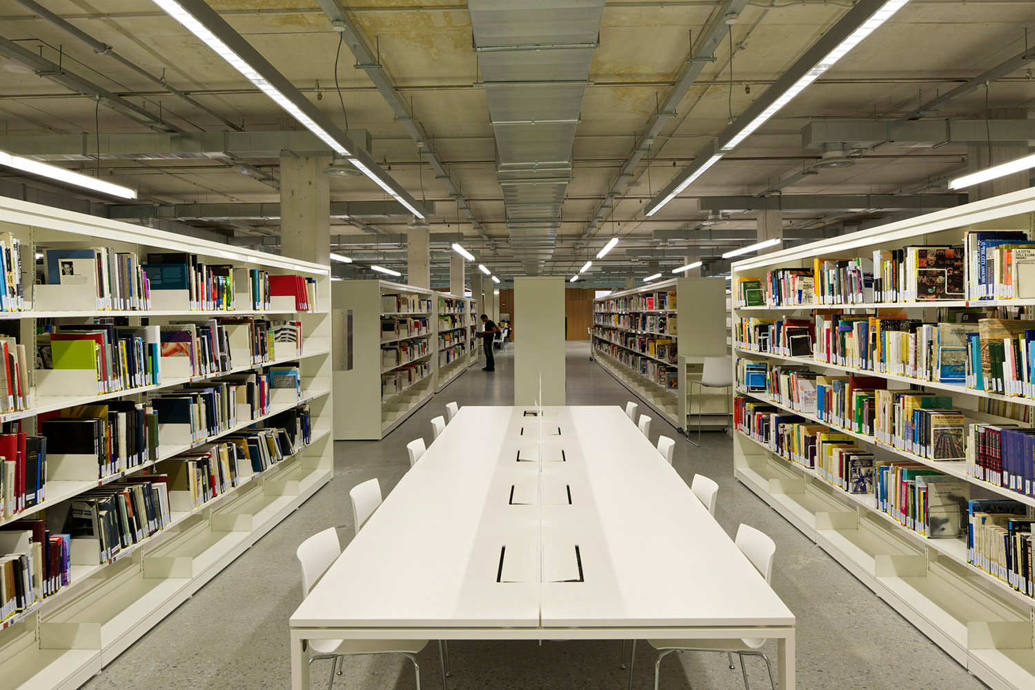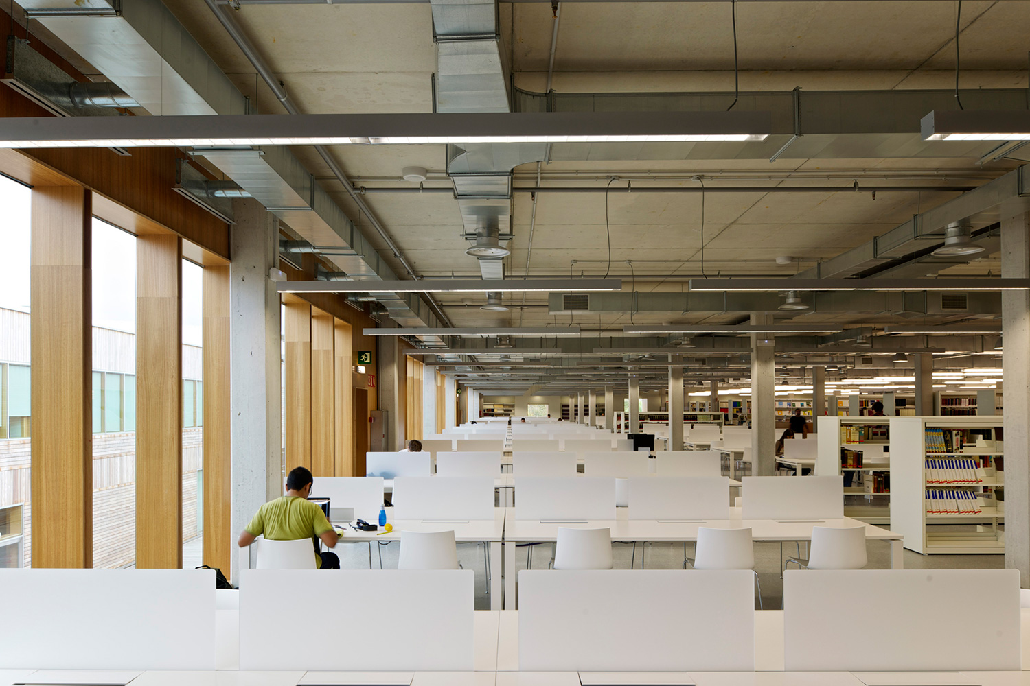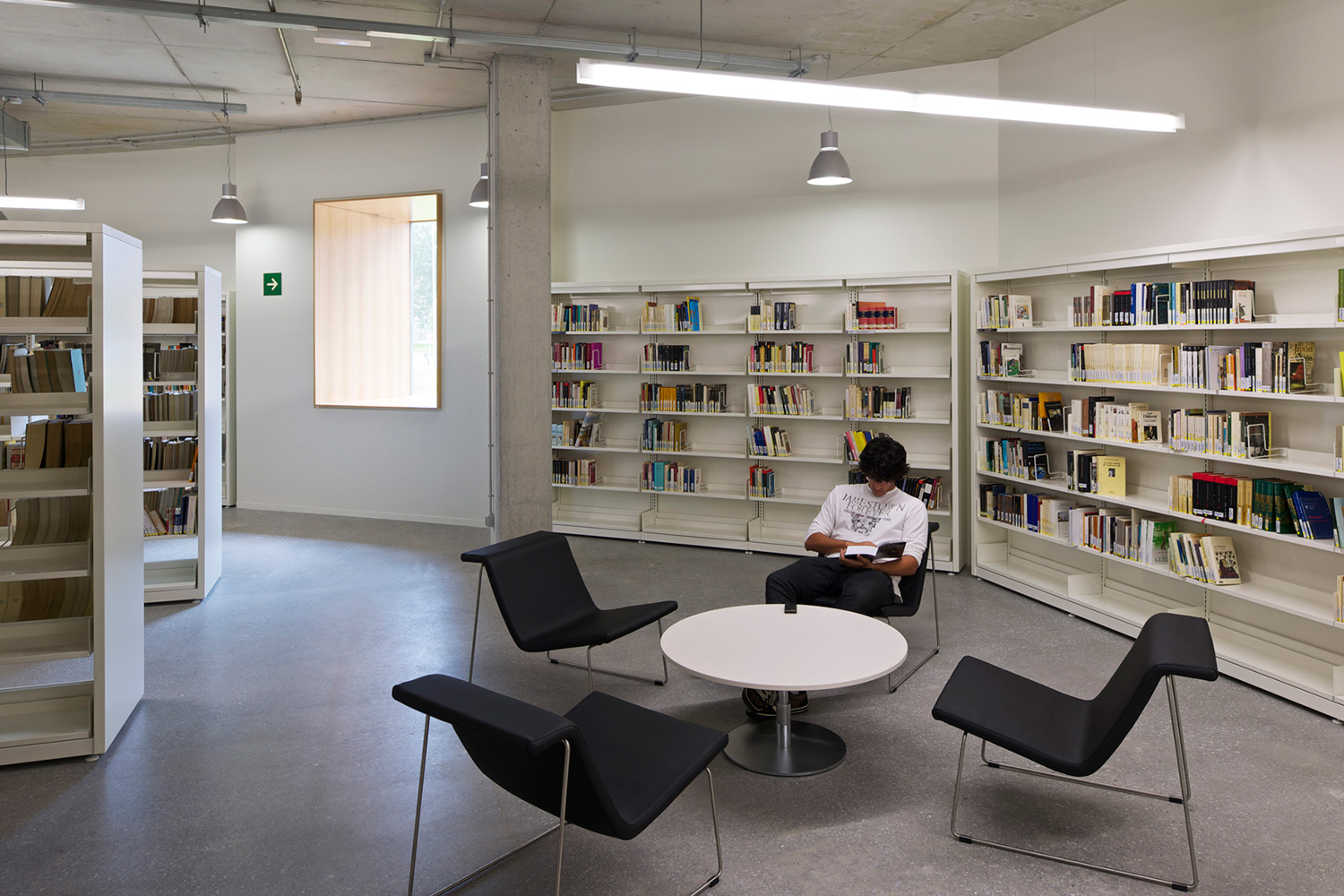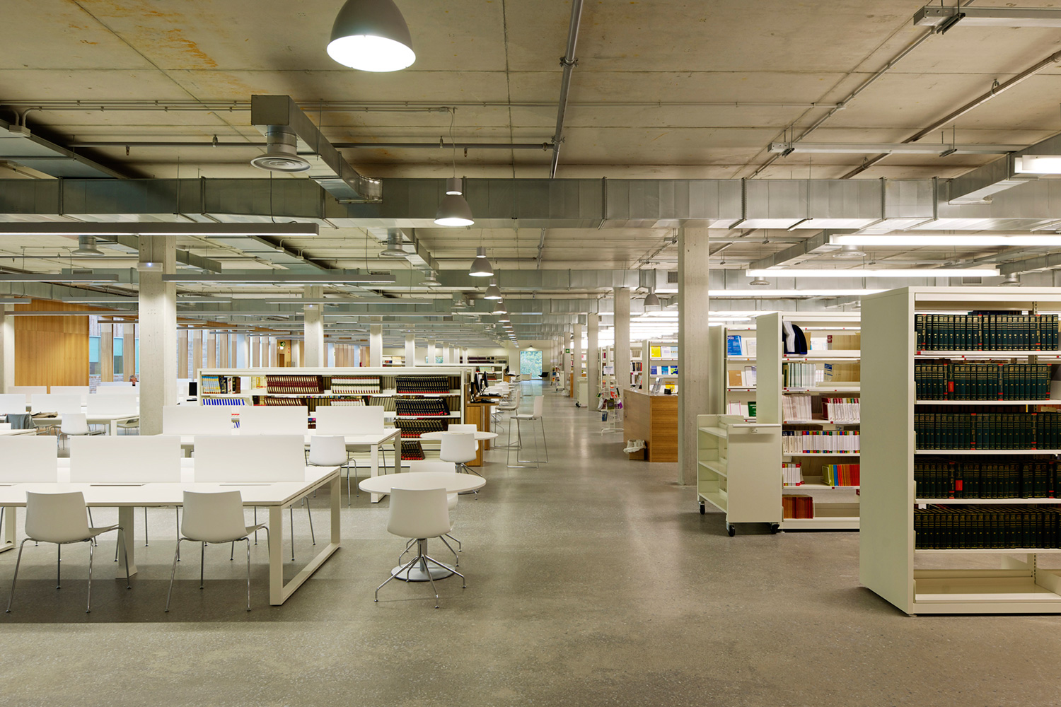 En innergård delar den två våningar höga byggnaden i två asymmetriska delar. Den större delen rymmer bibliotekets boksamling. Den andra, mindre delen erbjuder läsesal och auditorium. BCI levererade 17.000 löpmeter av 60/30 Stålhyllor med 40 mm tjocka slutgavlar och topphyllplan. Specialritade vita bokvagnar fulländar inredningskonceptet.