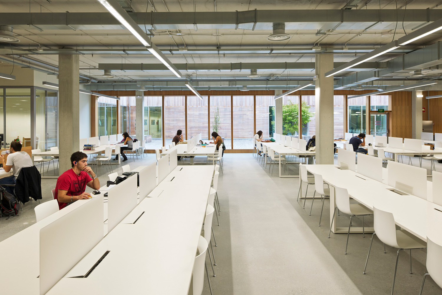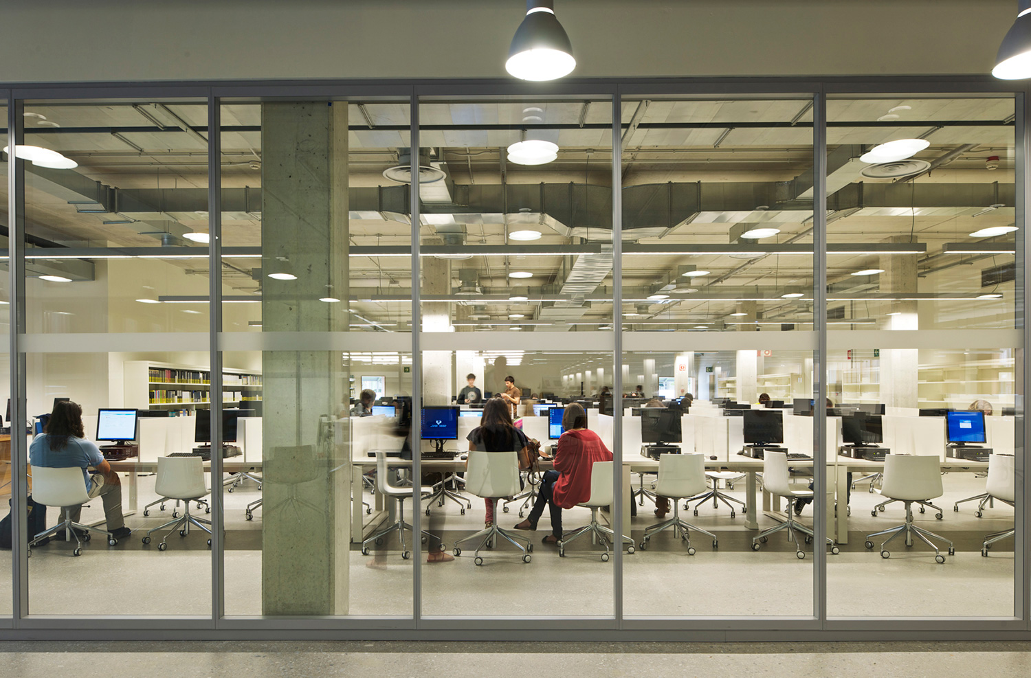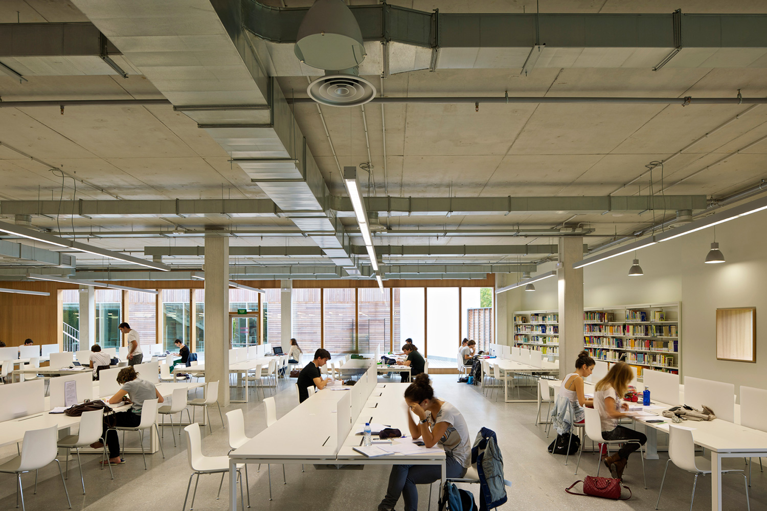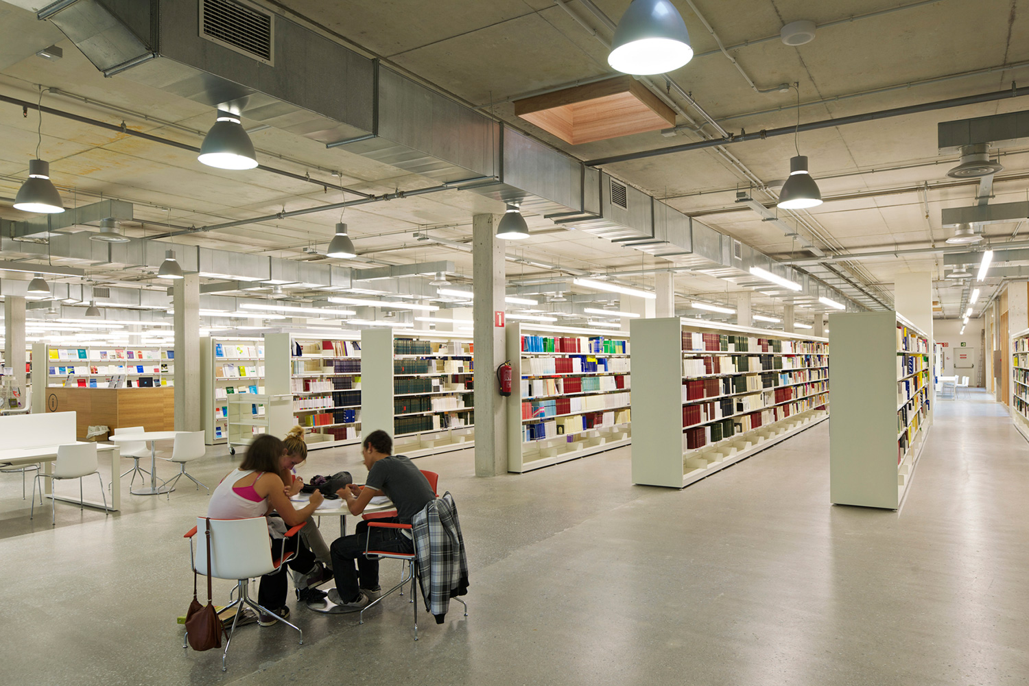 En innergård delar den två våningar höga byggnaden i två asymmetriska delar. Den större delen rymmer bibliotekets boksamling. Den andra, mindre delen erbjuder läsesal och auditorium. BCI levererade 17.000 löpmeter av 60/30 Stålhyllor med 40 mm tjocka slutgavlar och topphyllplan. Specialritade vita bokvagnar fulländar inredningskonceptet.
