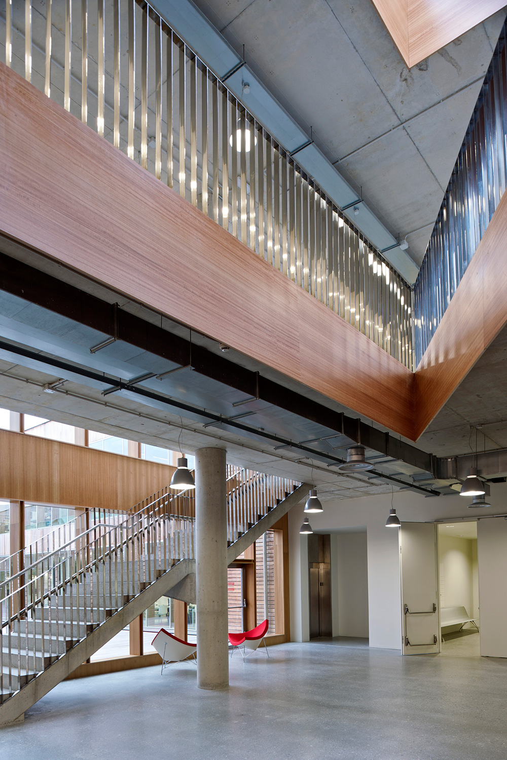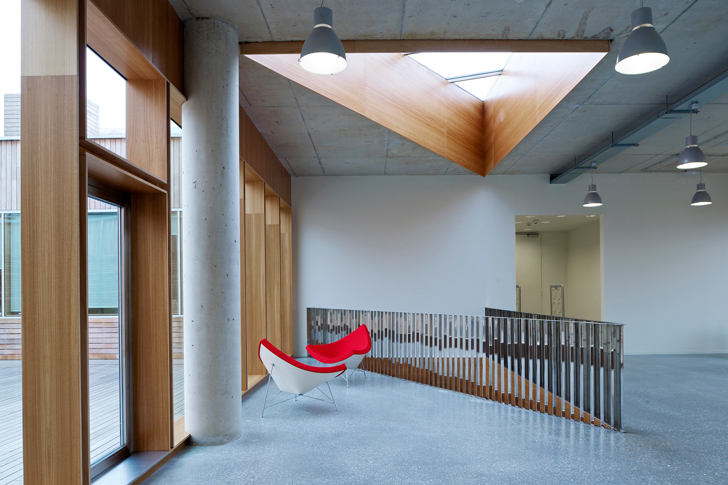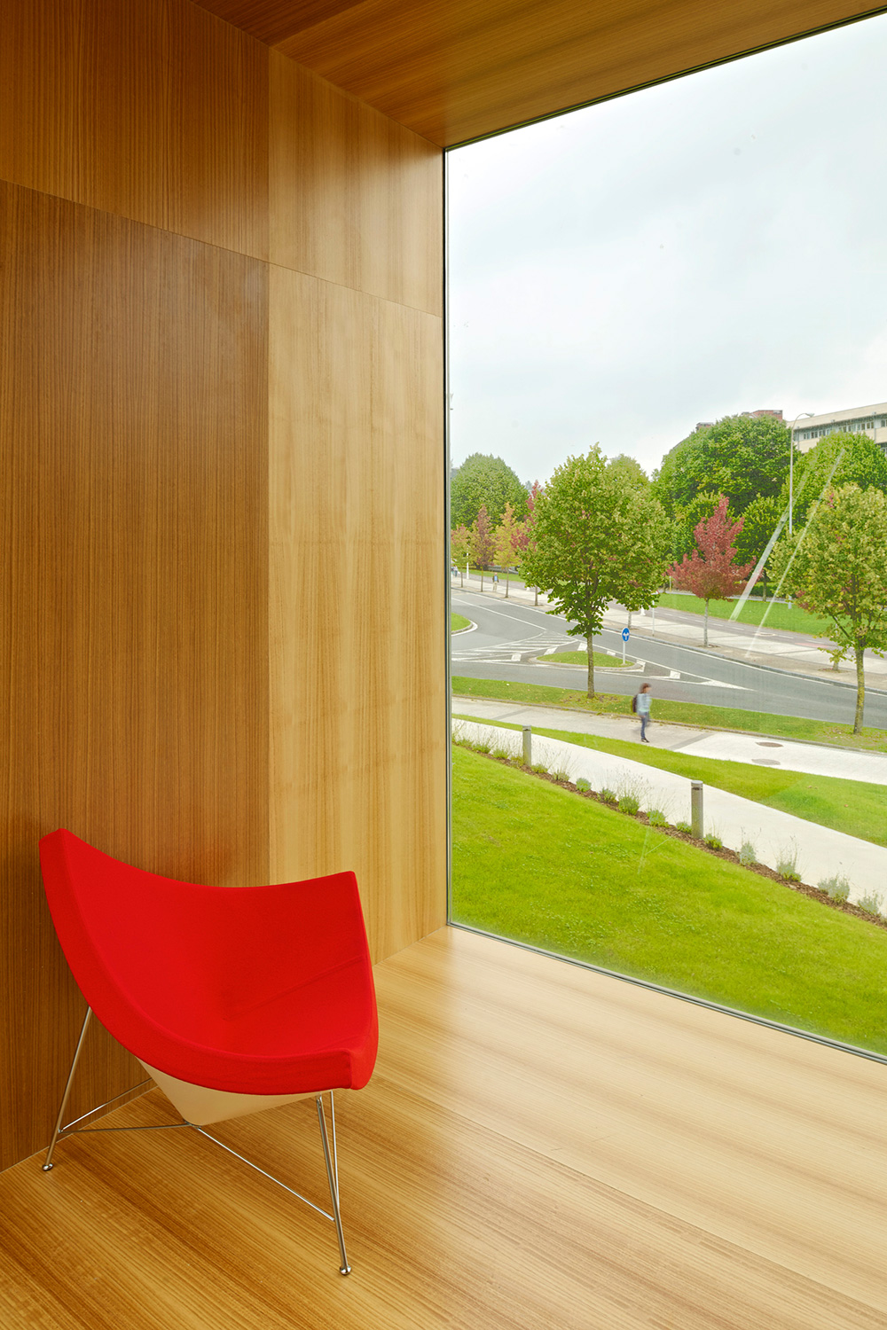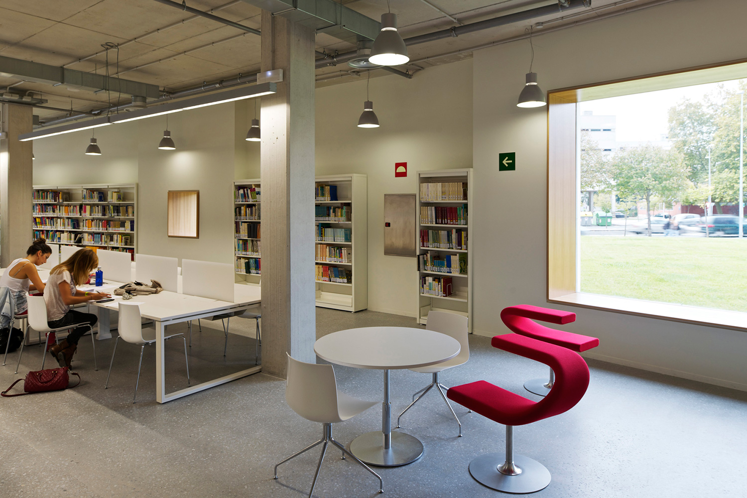 En innergård delar den två våningar höga byggnaden i två asymmetriska delar. Den större delen rymmer bibliotekets boksamling. Den andra, mindre delen erbjuder läsesal och auditorium. BCI levererade 17.000 löpmeter av 60/30 Stålhyllor med 40 mm tjocka slutgavlar och topphyllplan. Specialritade vita bokvagnar fulländar inredningskonceptet.