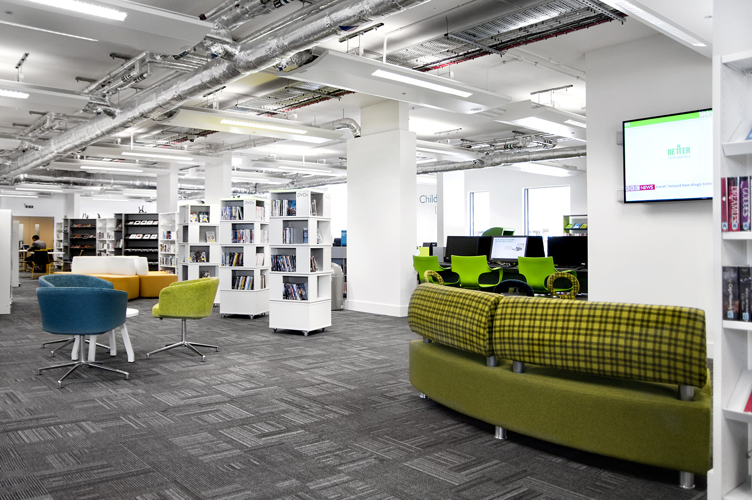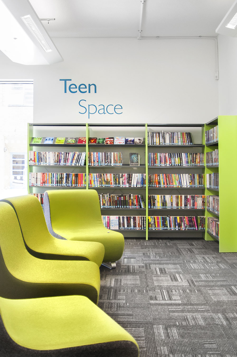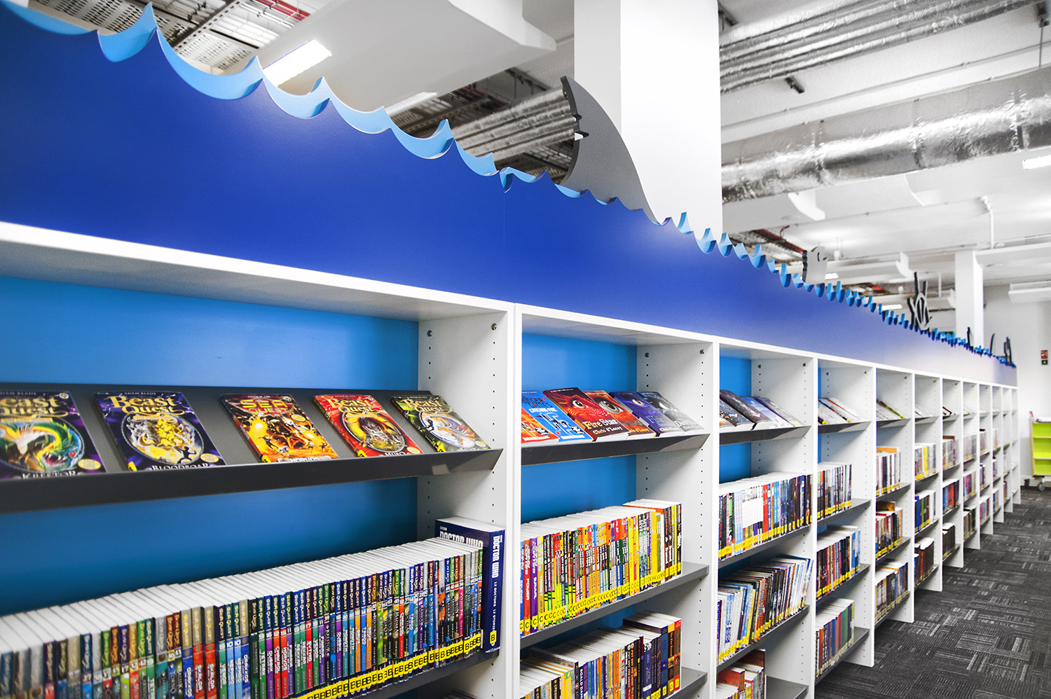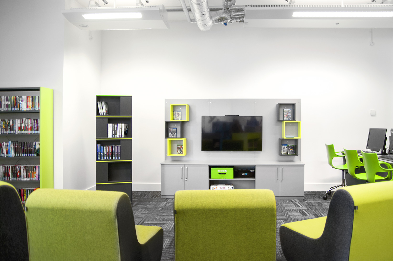 Unga får möjlighet att njuta av bibliotekszoner utrustade med spelkonsoler, stora skärmar samt fräcka och innovativa möbler för bästa komfort.