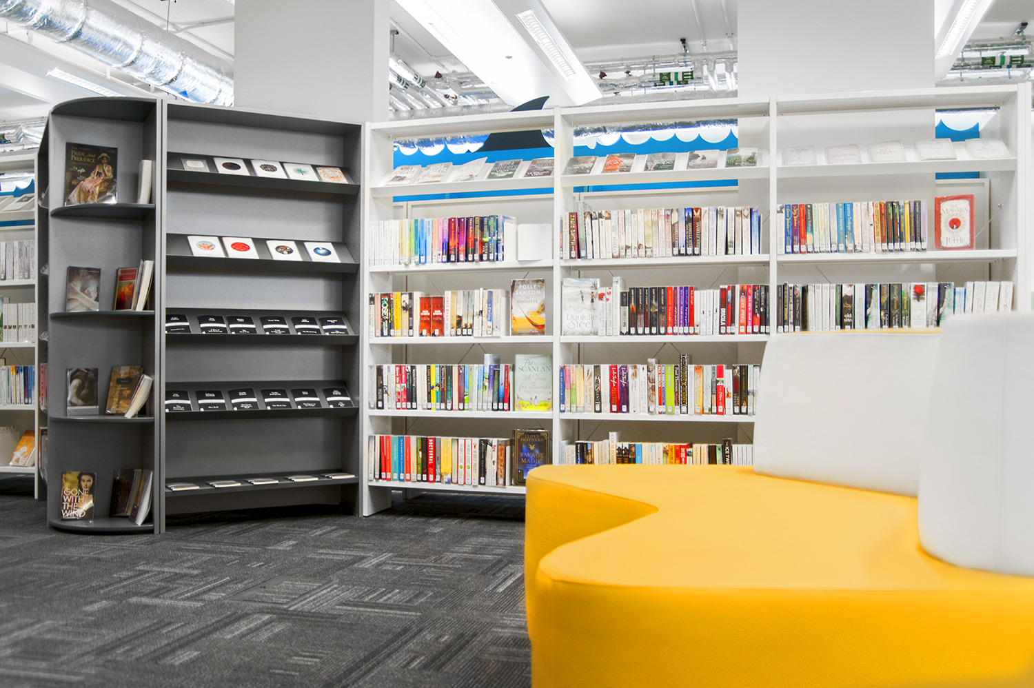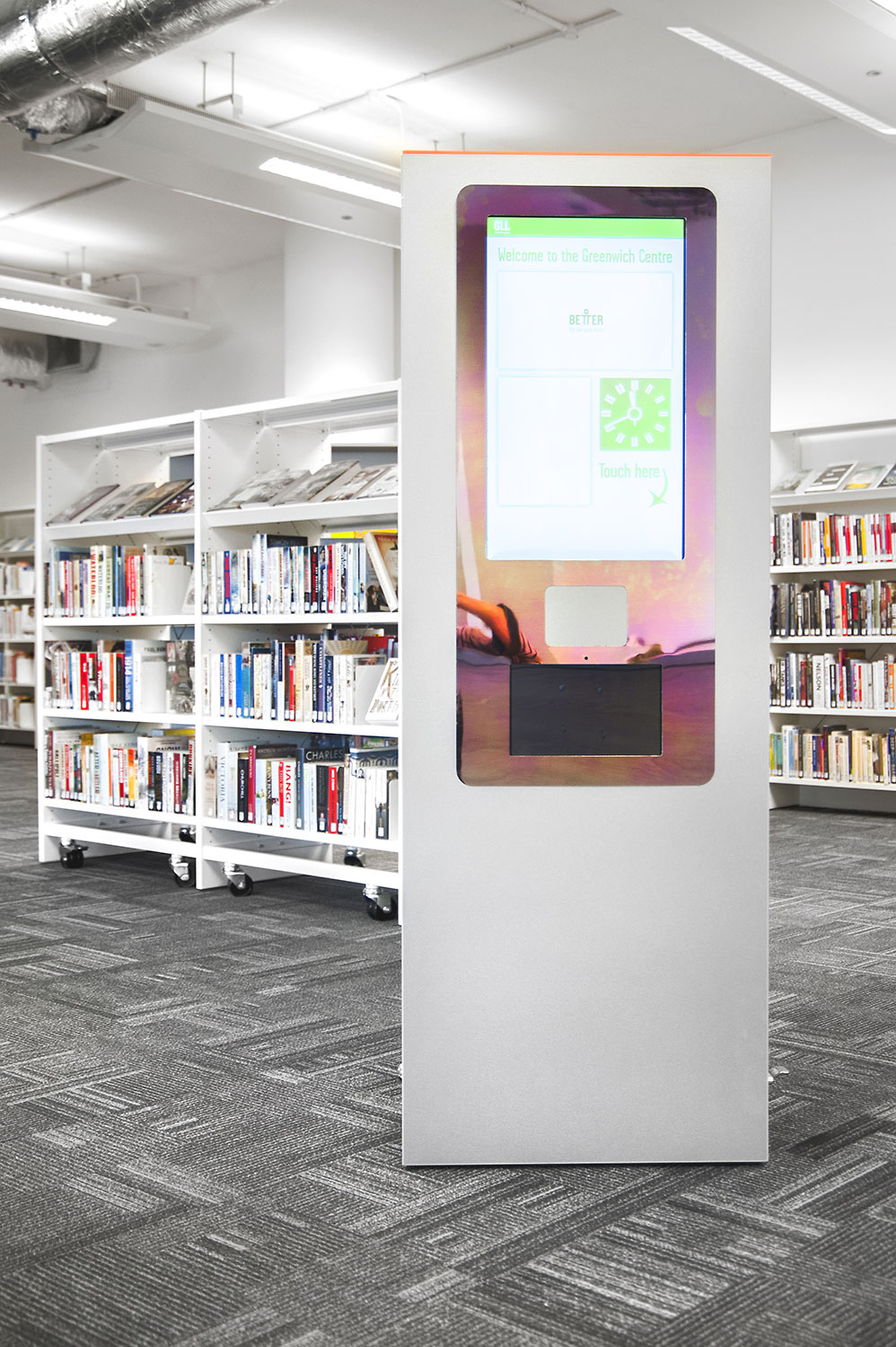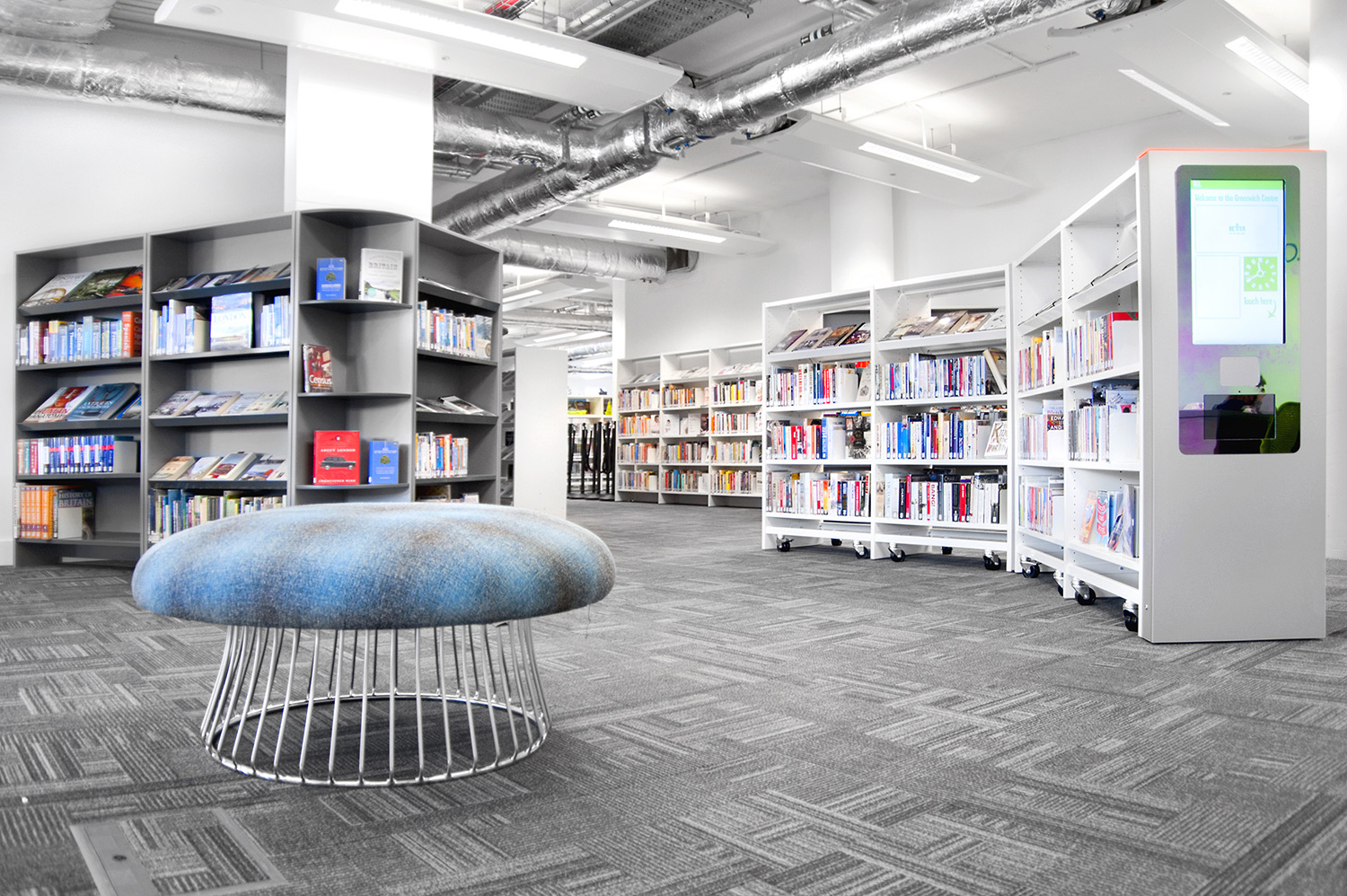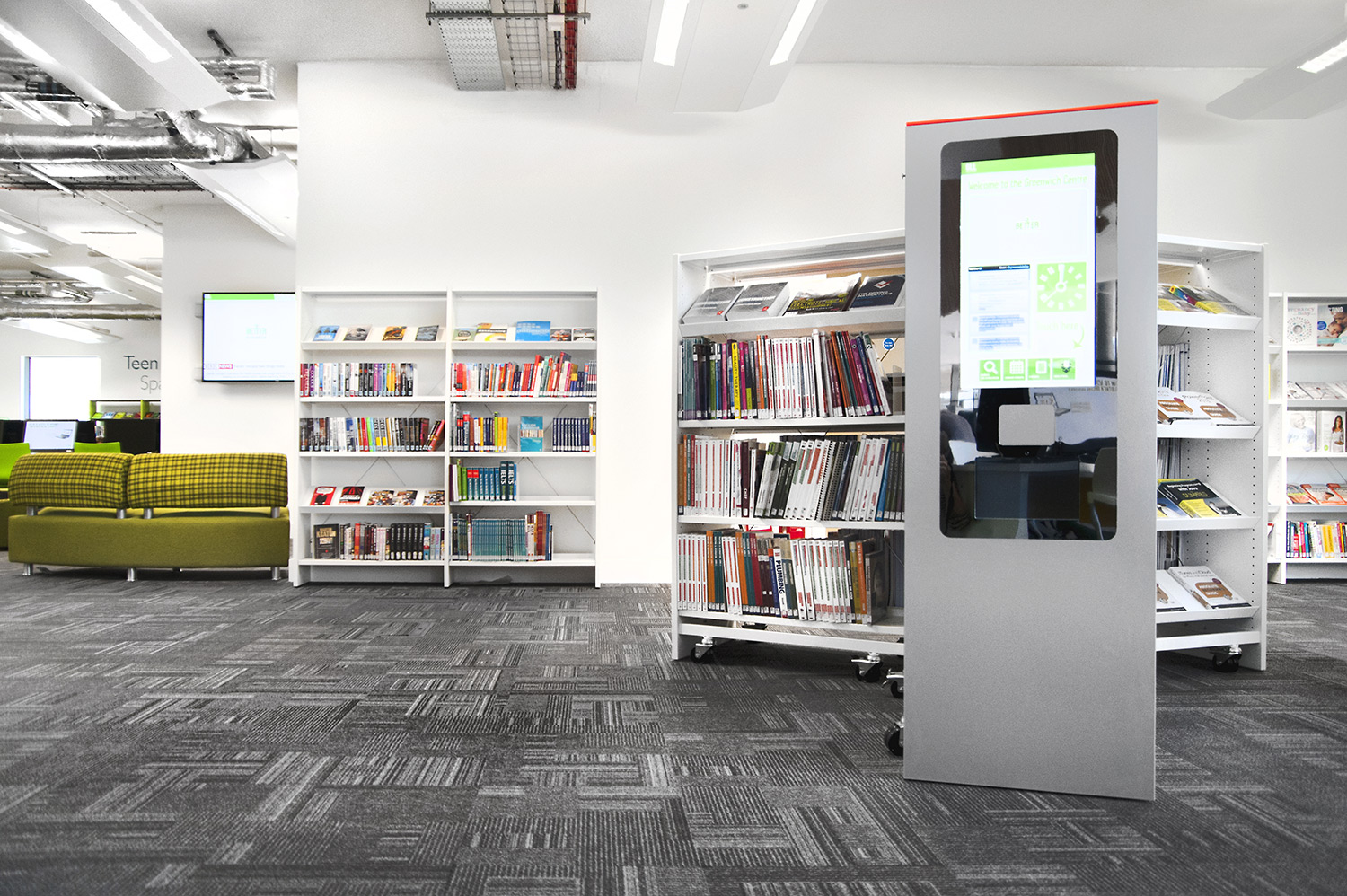 Överallt på biblioteket syns digitala paneler på hyllgavlarna som gör det möjligt för kunderna att leta efter specifika böcker och författare. Man får också tillgång till bibliotekets egna app som lyfter fram nya böcker och tjänster som finns tillgängliga för alla besökare.