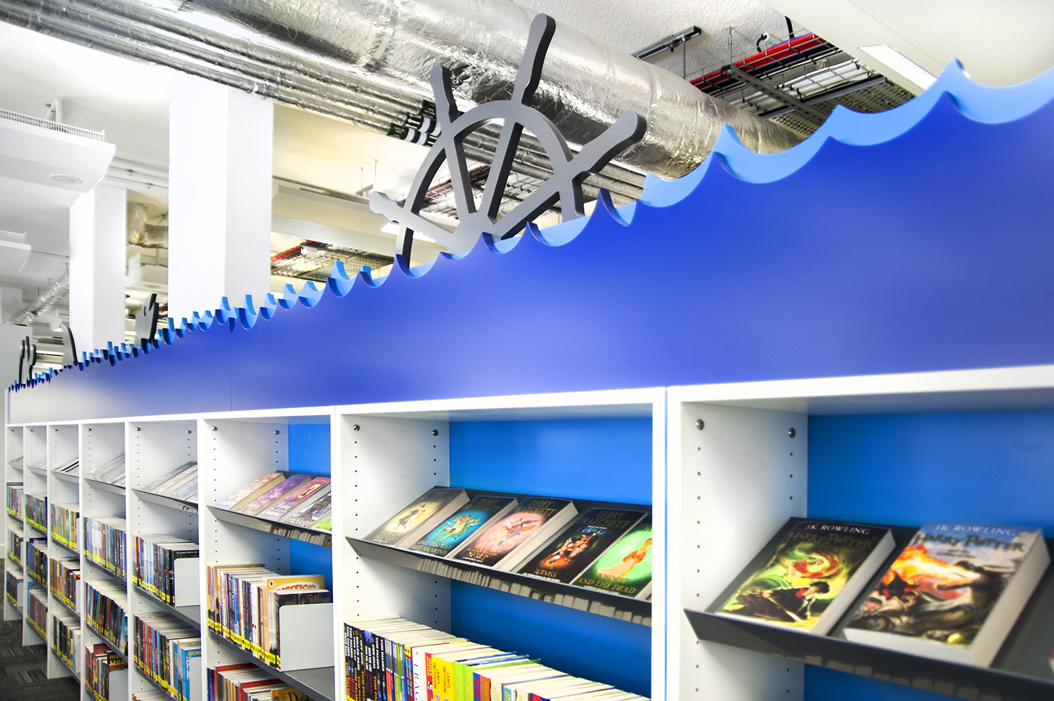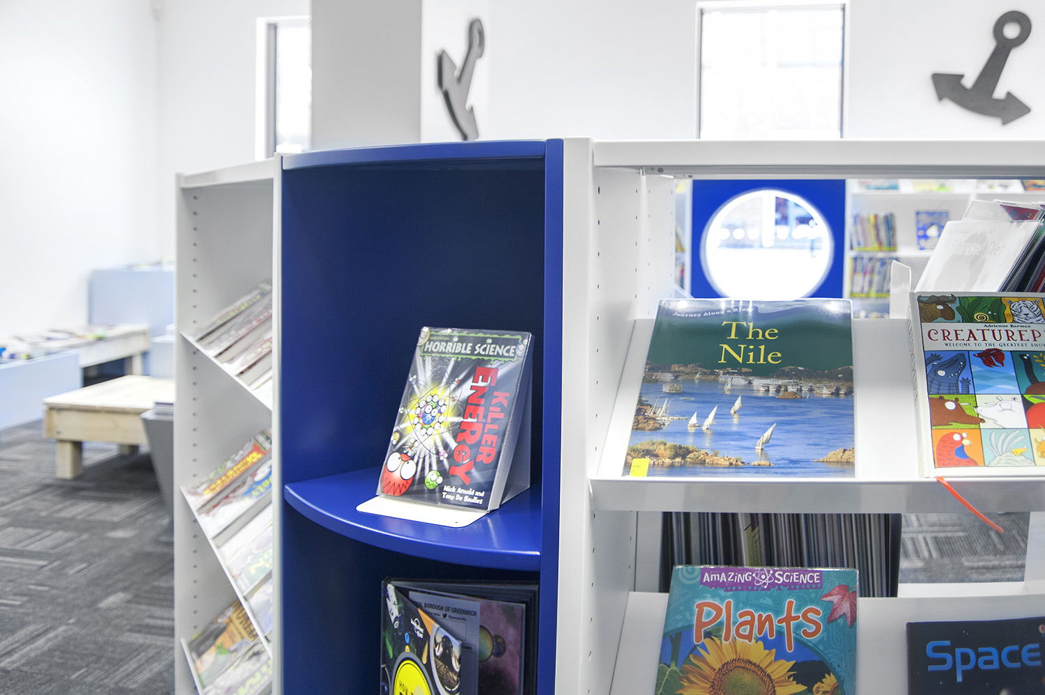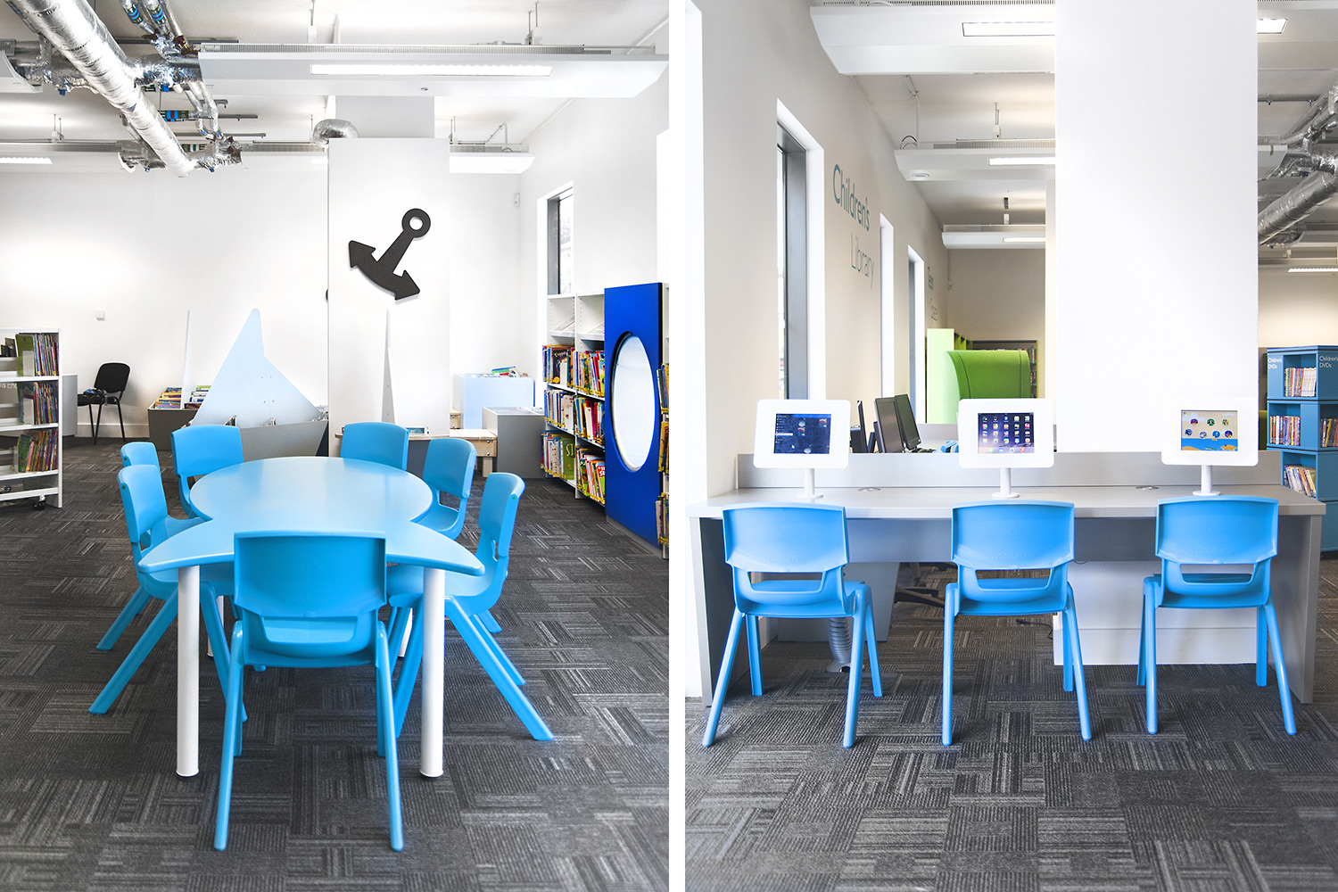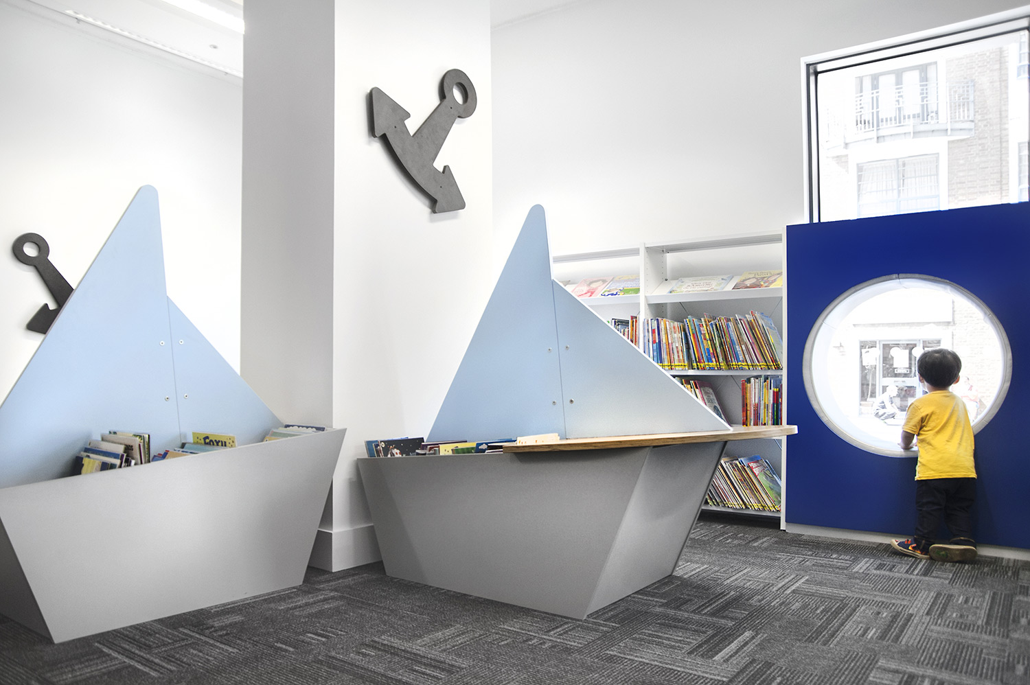 Då man önskat lyfta Greenwichs rika, maritima historia har barnavdelningen inretts i detta tema. Bilderbokslådor i form av båtar, hyllor dekorerade med vågor, ankare och ventiler för att lustfyllt väcka läslusten hos de små. Barnens bibliotek har även datorer och läsplattor tillgängliga för de yngre besökarna.