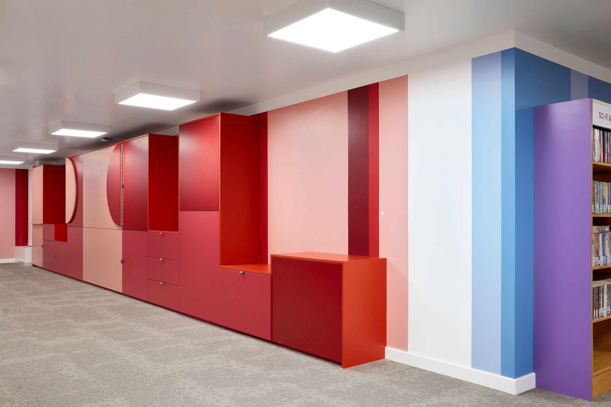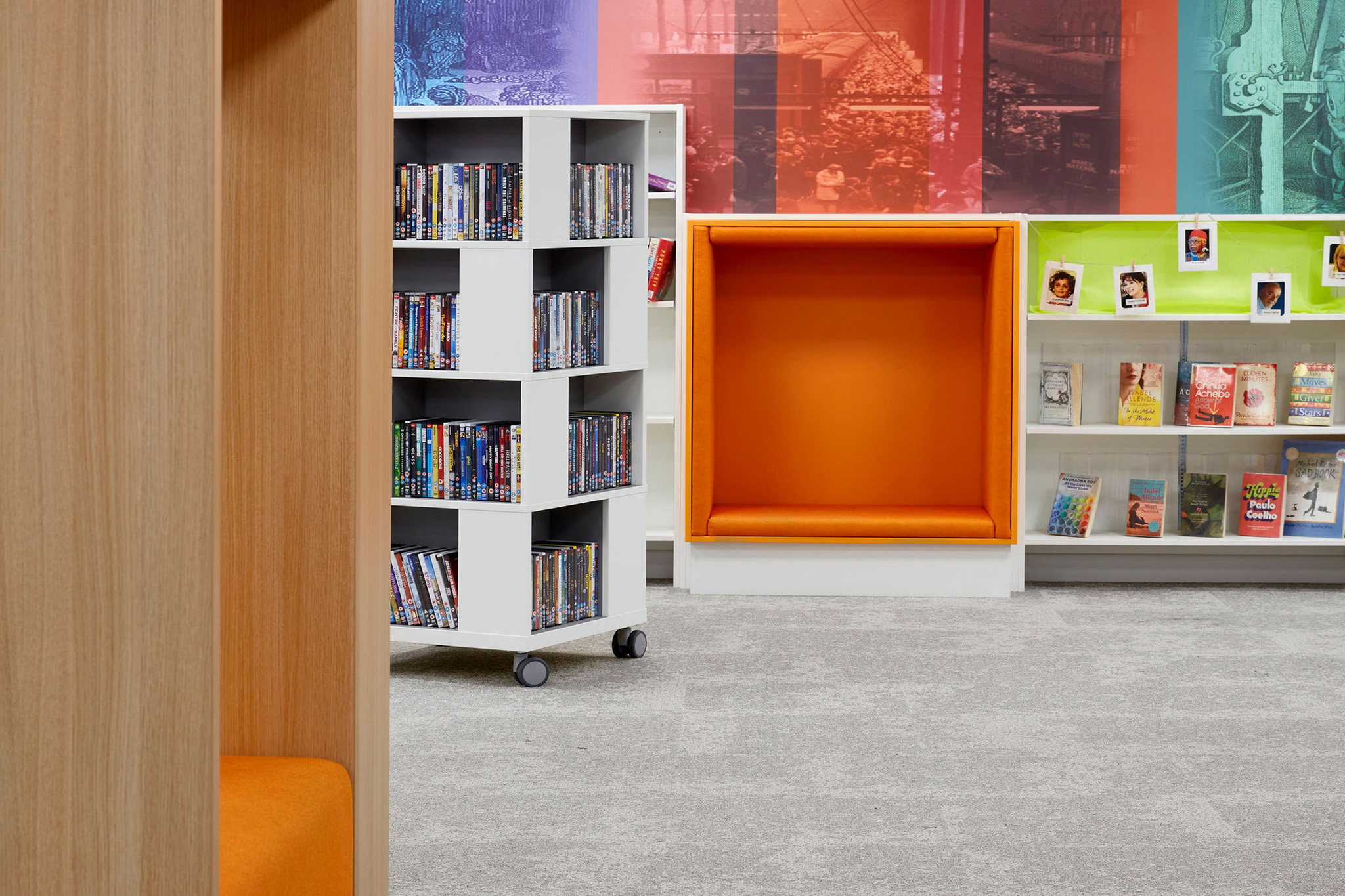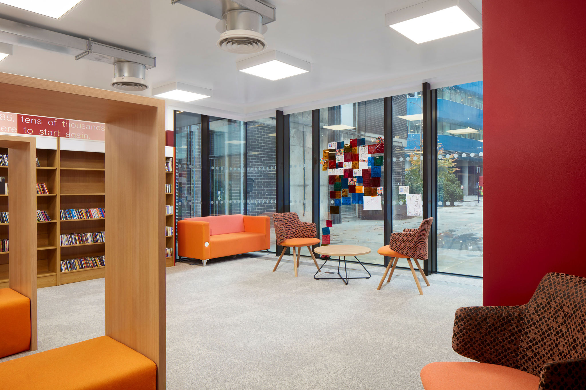 Alla vägghyllor har återanvänts och uppdaterats med moderna skyltar, och flera av de tidigare biblioteksmöblerna har också återinförts i den nya designen. Ett nytt loungeområde för grupparbete har tillkommit med nya möbler med integrerad strömförsörjning, så att besökarna kan koppla in sina egna enheter. Fler bärbara bord har lagts till runt om i biblioteket, vilket uppmuntrar besökare i alla åldrar att sitta var de vill.