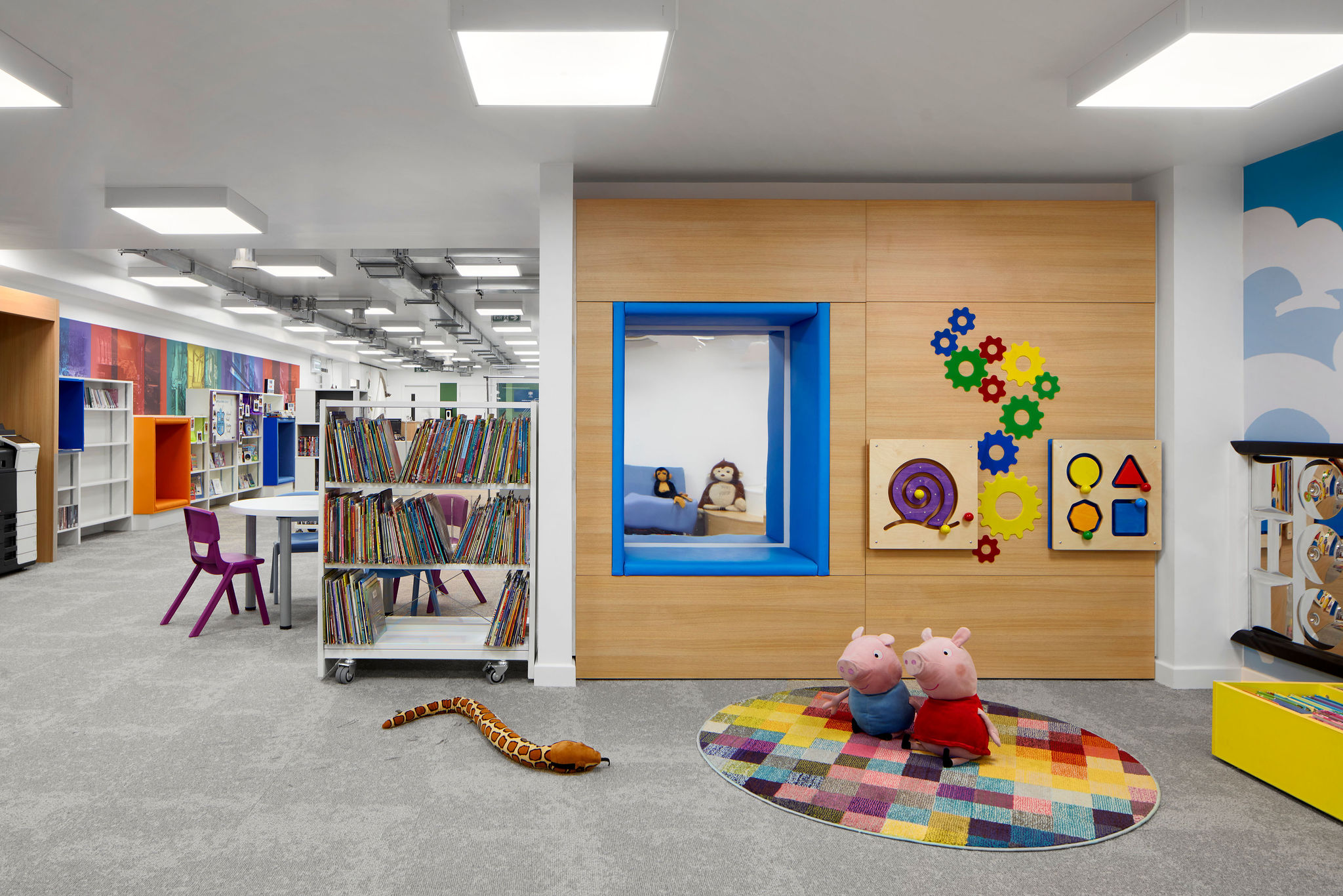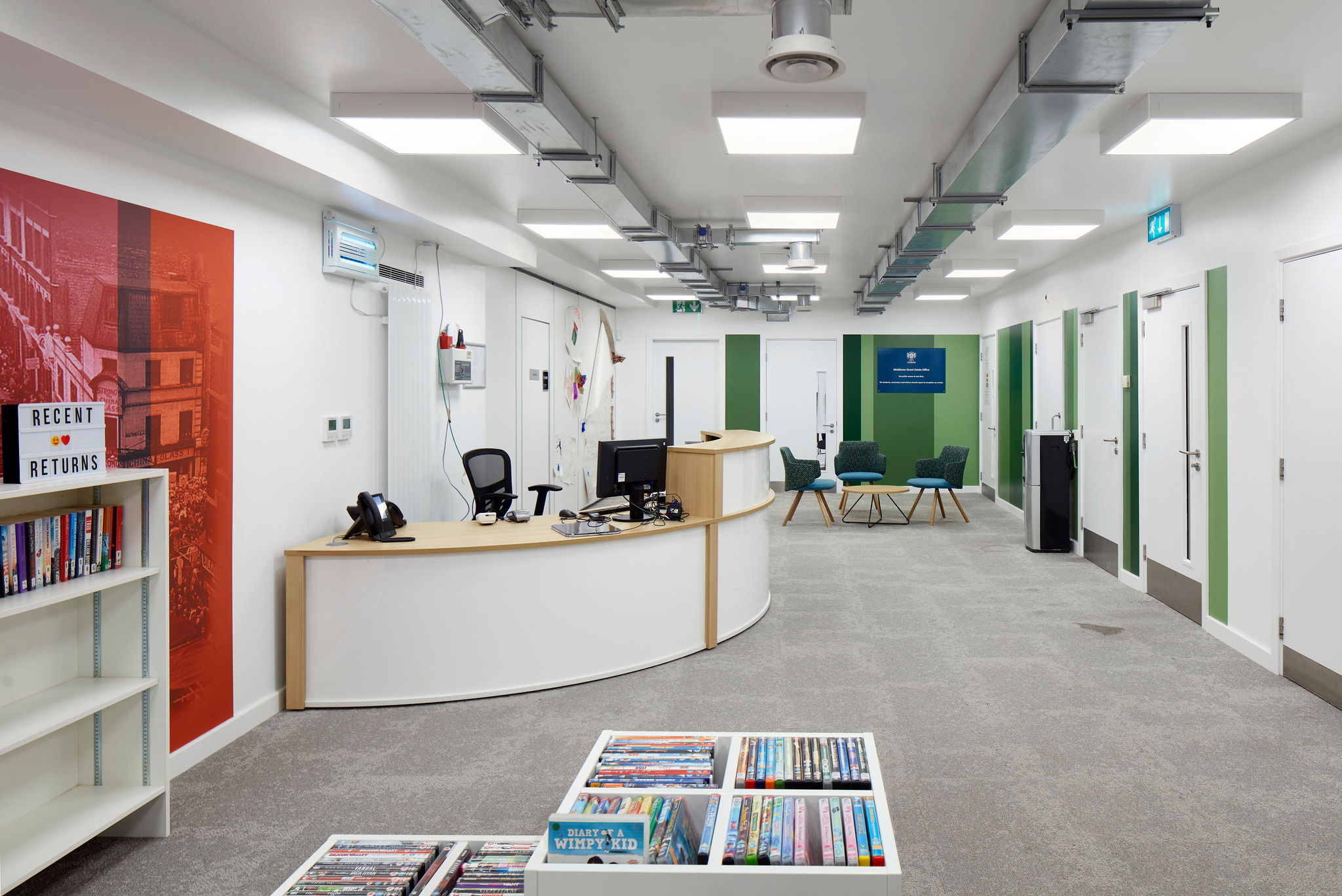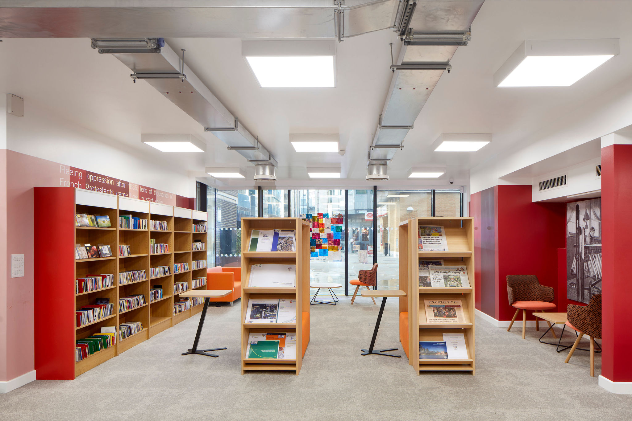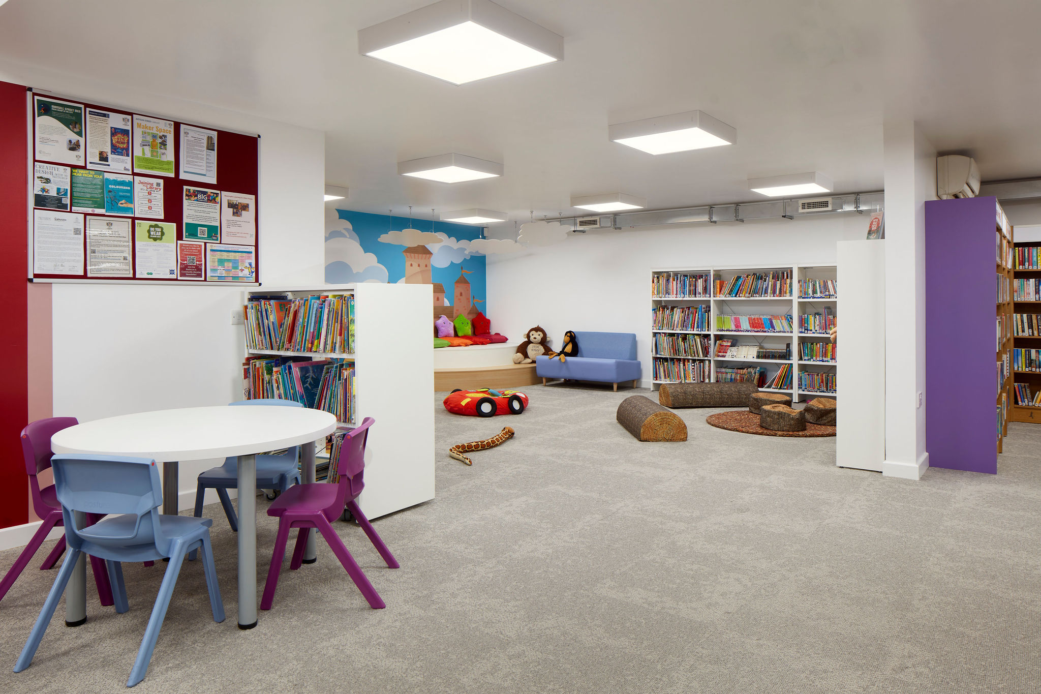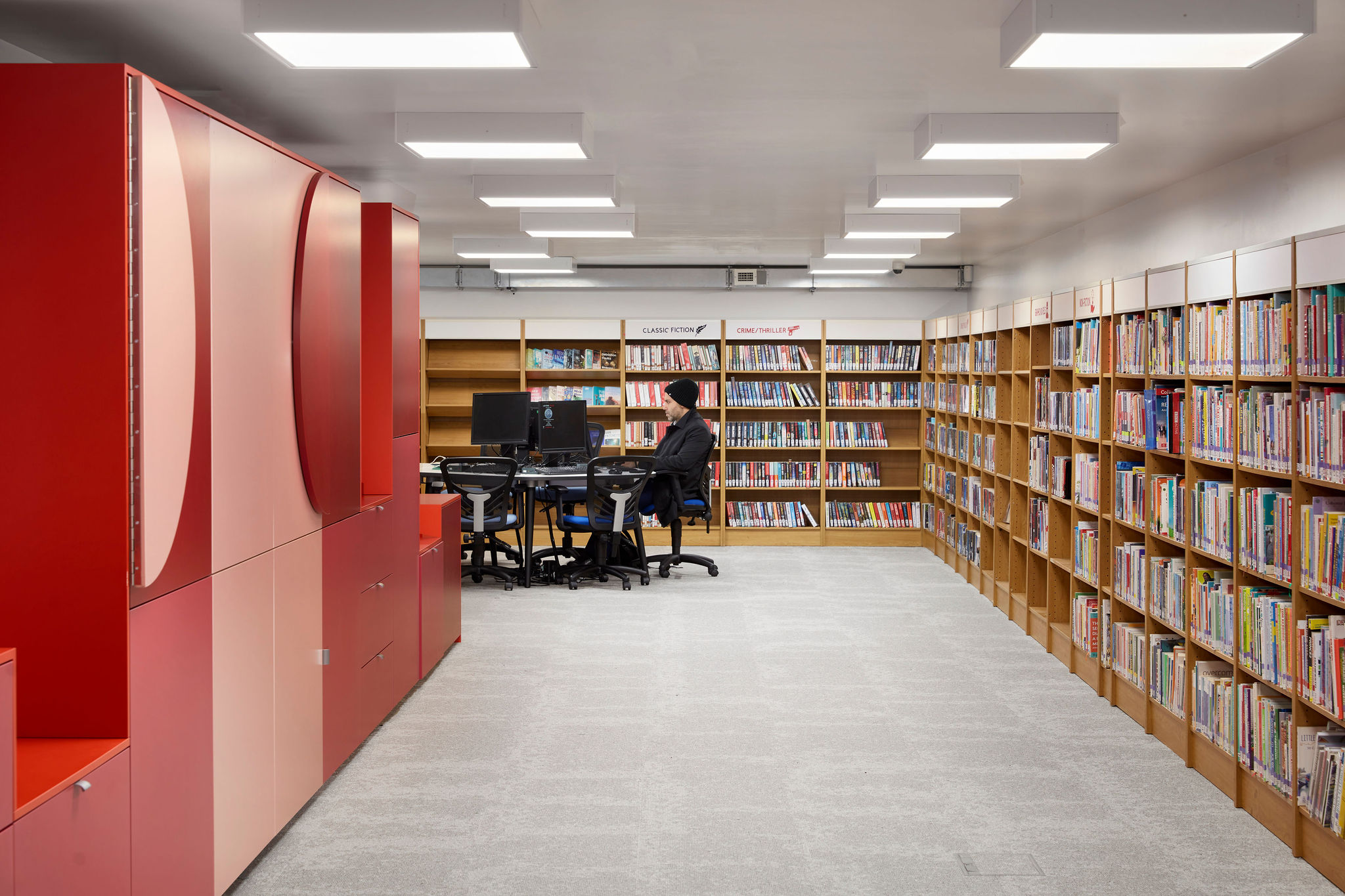 Vår uppgift på thedesignconcept ltd. var att skapa en modern, livfull och välkomnande design som återspeglar kvarterets kulturarv. Receptionsområdet har byggts om för att tillgodose behoven hos de boende i kvarteret och för att bättre kunna betjäna bibliotekets besökare, som främst är familjer med små barn och yrkesverksamma. De små och mobila hyllorna, grupperade i små öar, skapar större flexibilitet och utrymme för gruppaktiviteter, medan läshörnor kan användas för att dra sig tillbaka och njuta av en bok i tystnad.