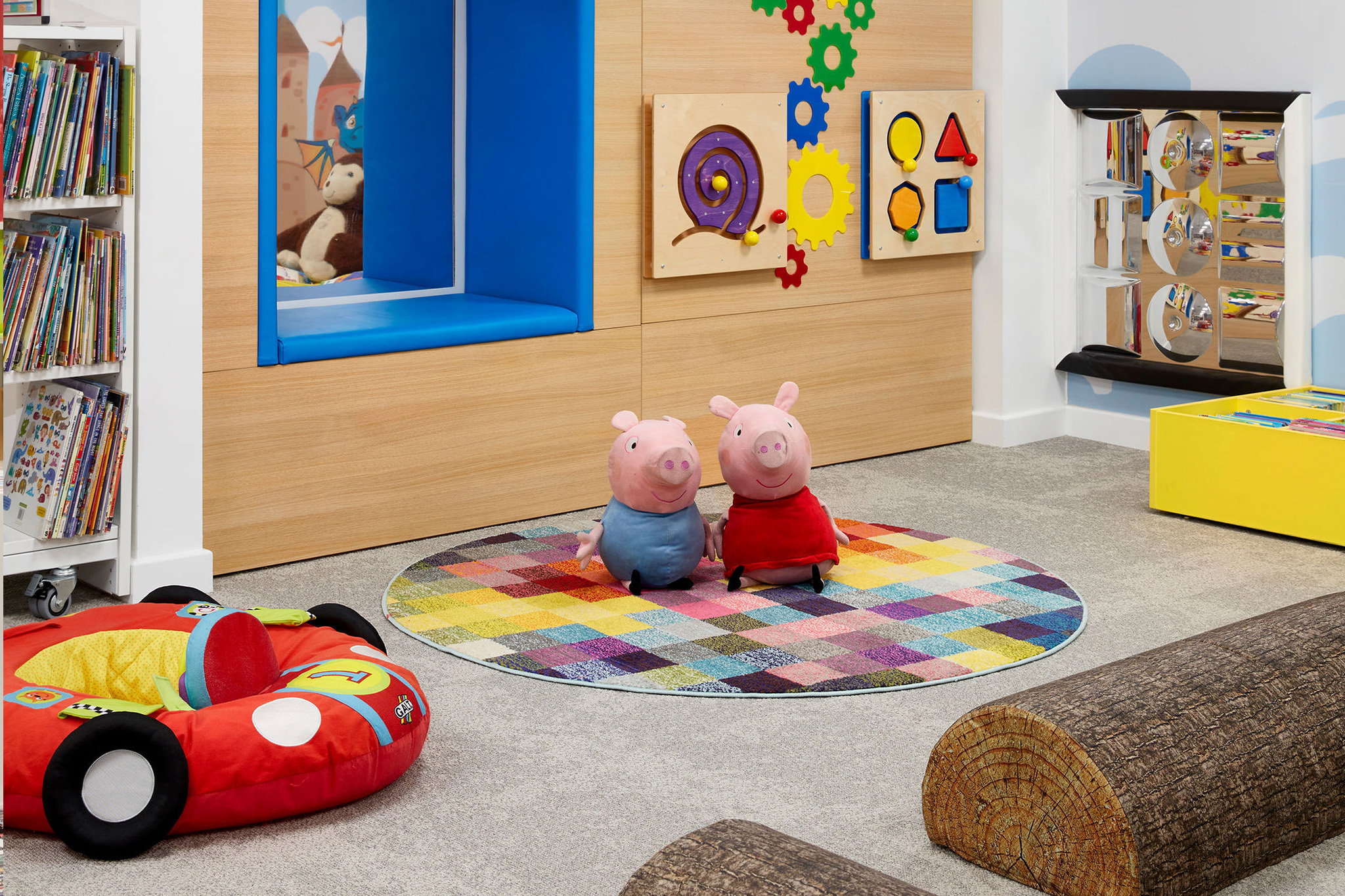 I nära samarbete med reForm Architects såg vi till att färger och material matchade hugenott-färgpaletten, ett unikt skräddarsytt grafiskt koncept som har varit en del av bibliotekets inredningsdesign. Färgerna bidrar till att hylla områdets rika historia och är genomgående i hela biblioteket - särskilt på framsidan och i entrén. Barnbiblioteket har också en stor och lekfull väggrafik som stöder temat och färgsättningen.