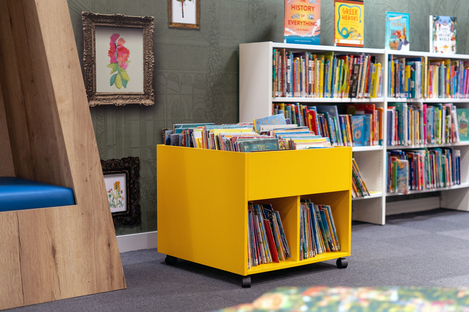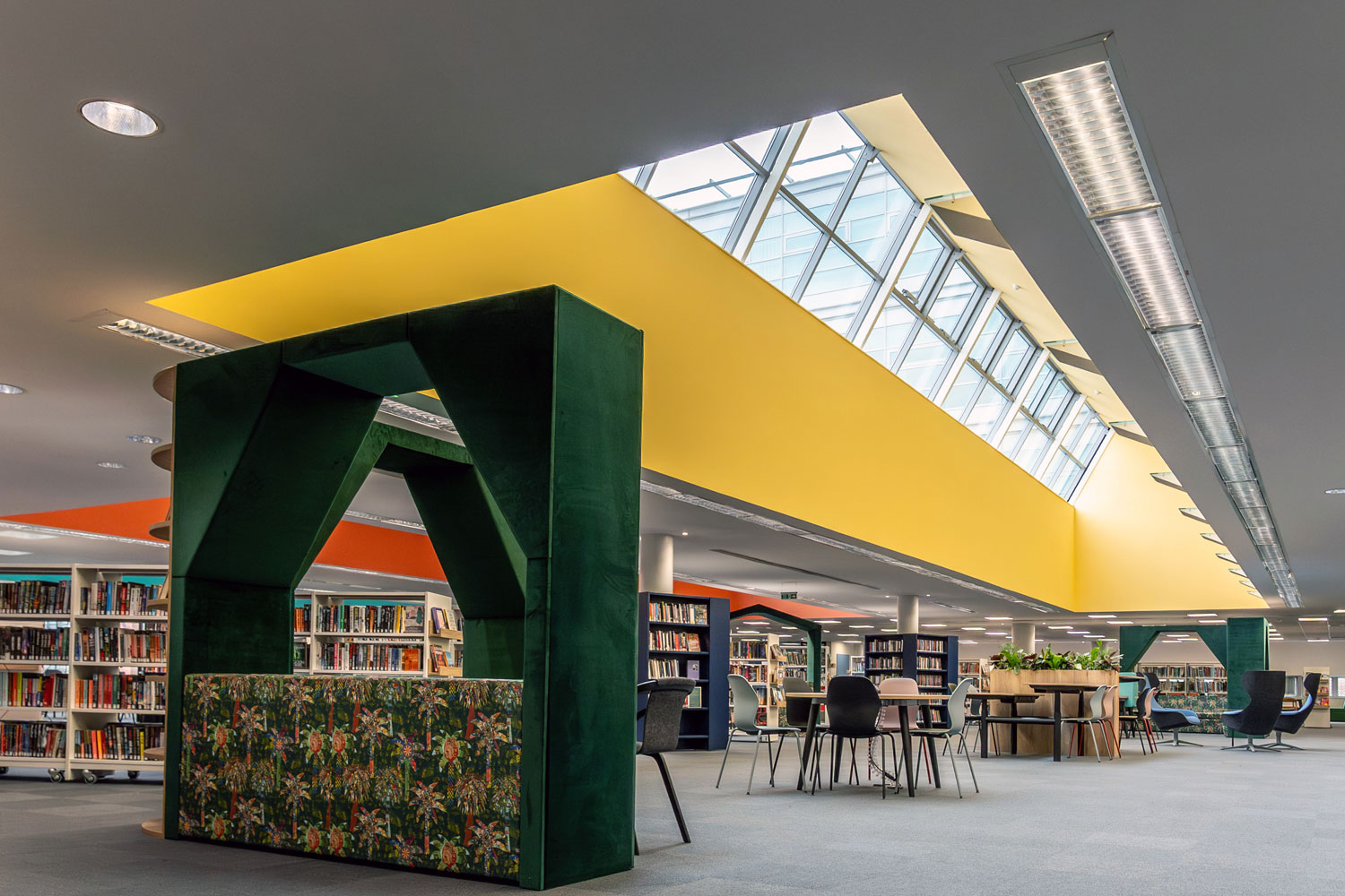 Förutom de vackra böckerna erbjuder det nya biblioteket även växter, väggmålningar, utställningar, konstverk – och till och med en liten flygel.