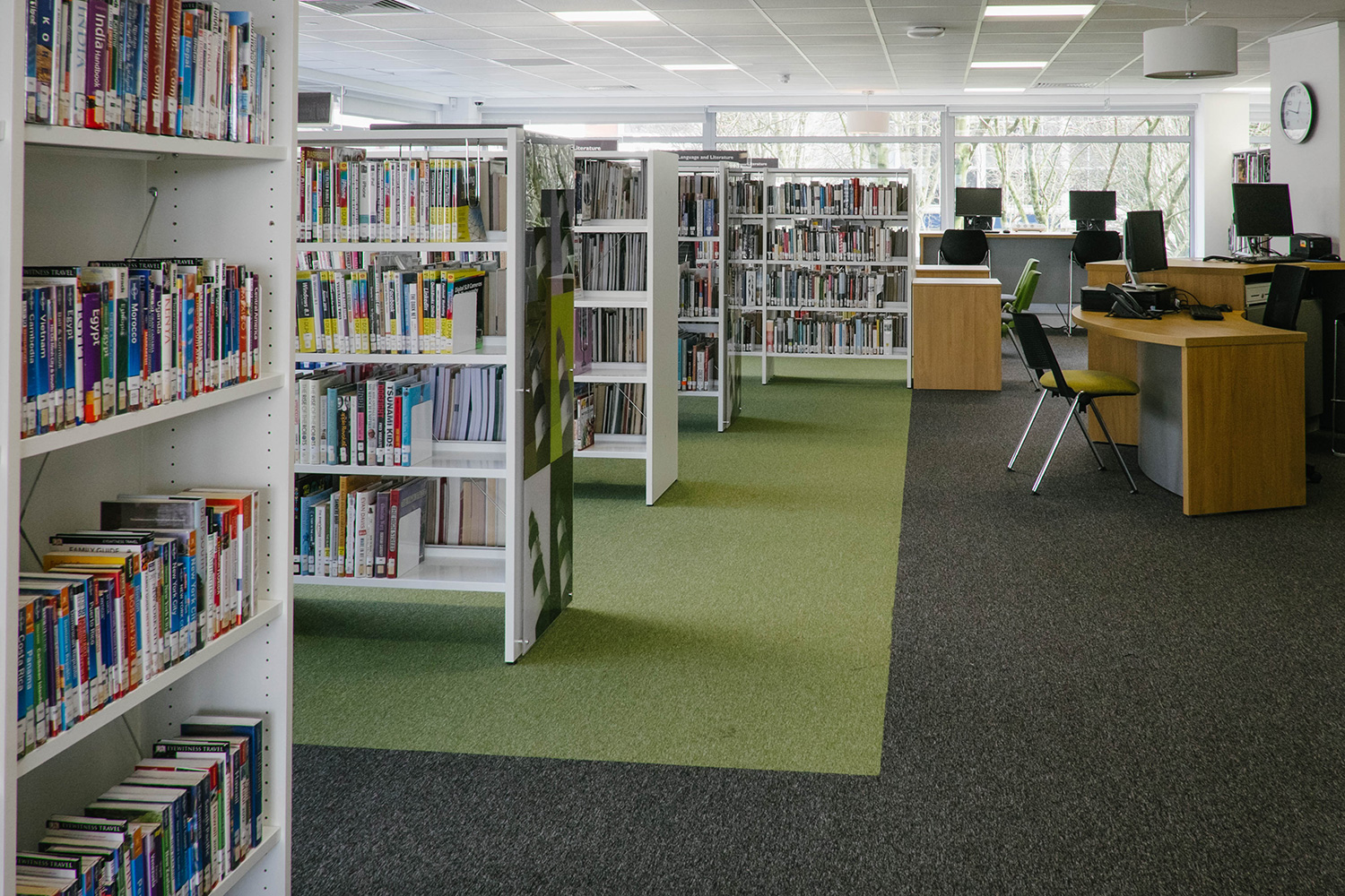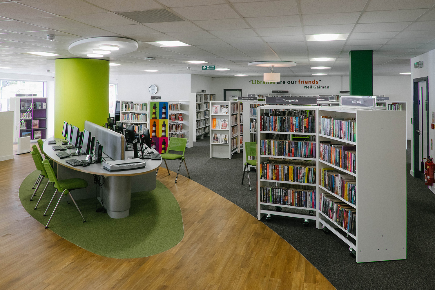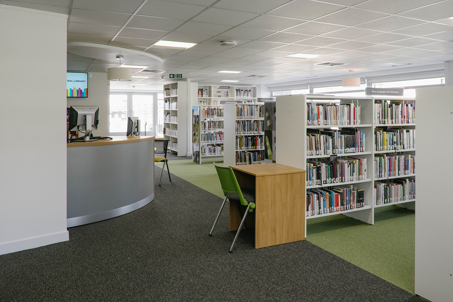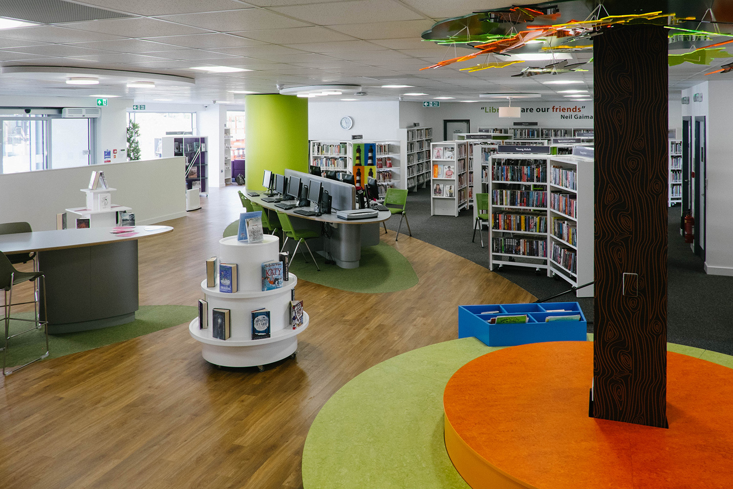 Efter att ha bytt lokaler var biblioteket klart för att öppna igen, mitt i stadens centrum och affärsstråk. Thedesignconcept antog utmaningen att designa ett bibliotek som skulle vara iögonfallande och inbjuda till besök. Designen utgick från en installation på barnavdelningen; ett ”statement tree” omgivet av färgglada möbler och specialgjord väggrafik i form av väggord, citat och bilder. Denna design åstadkommer en välkomnande och inbjudande omgivning för alla besökare.