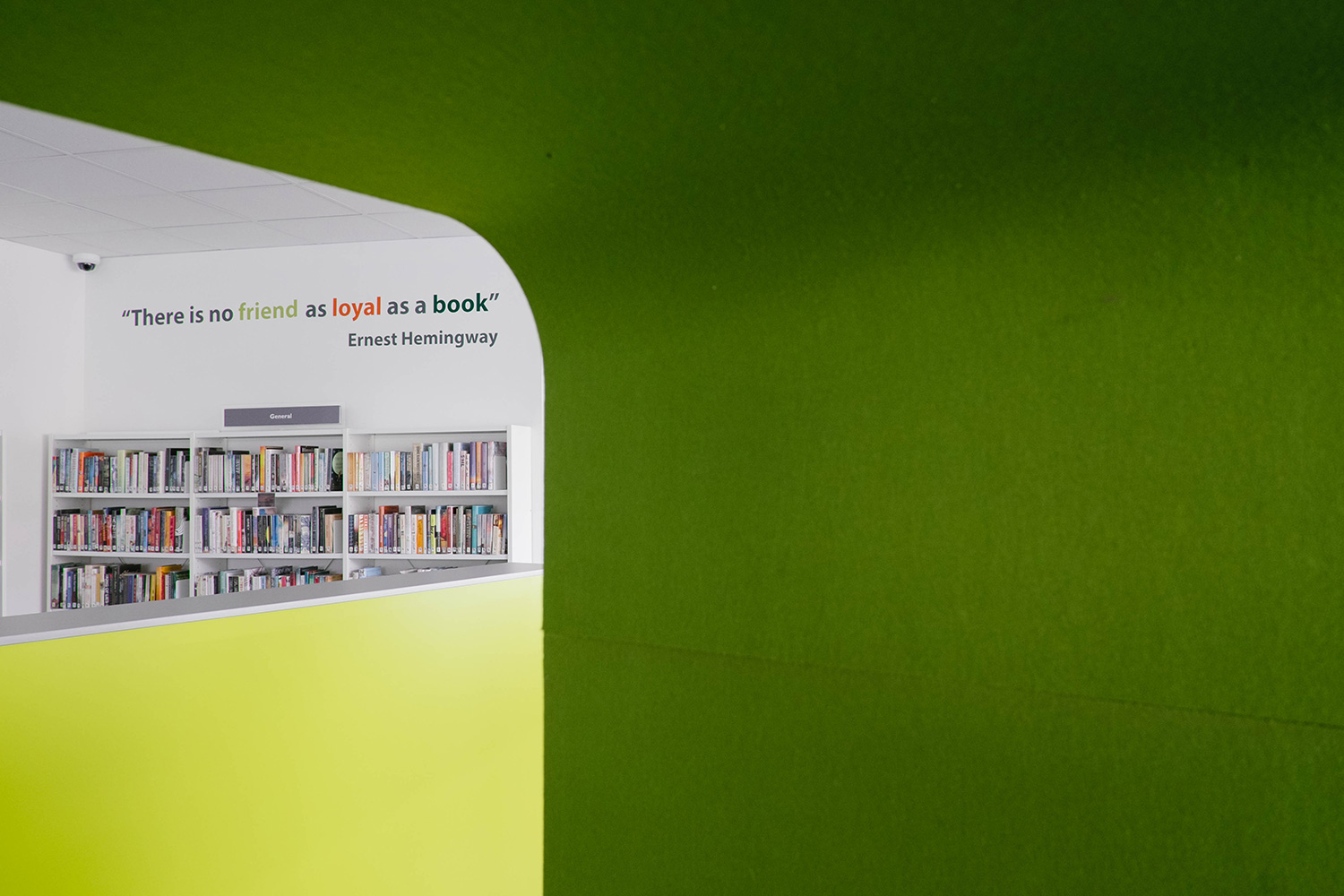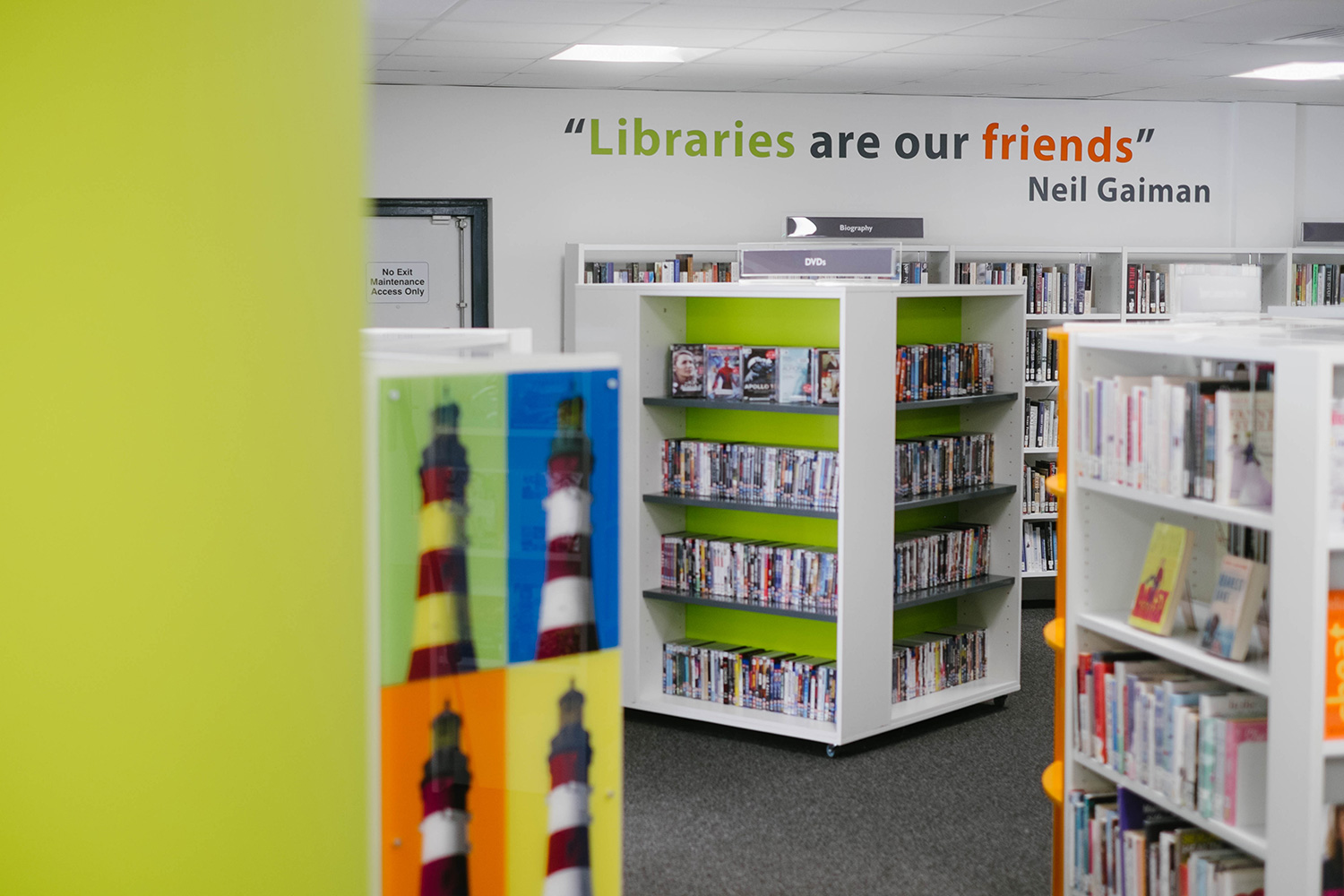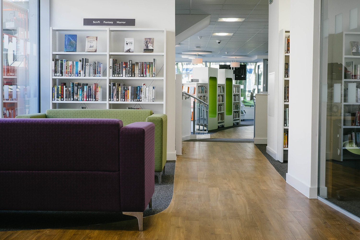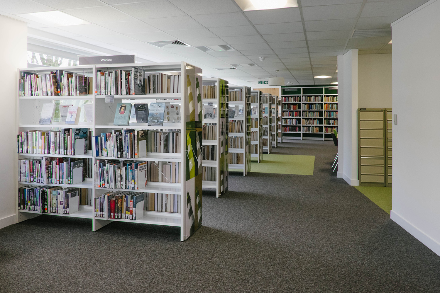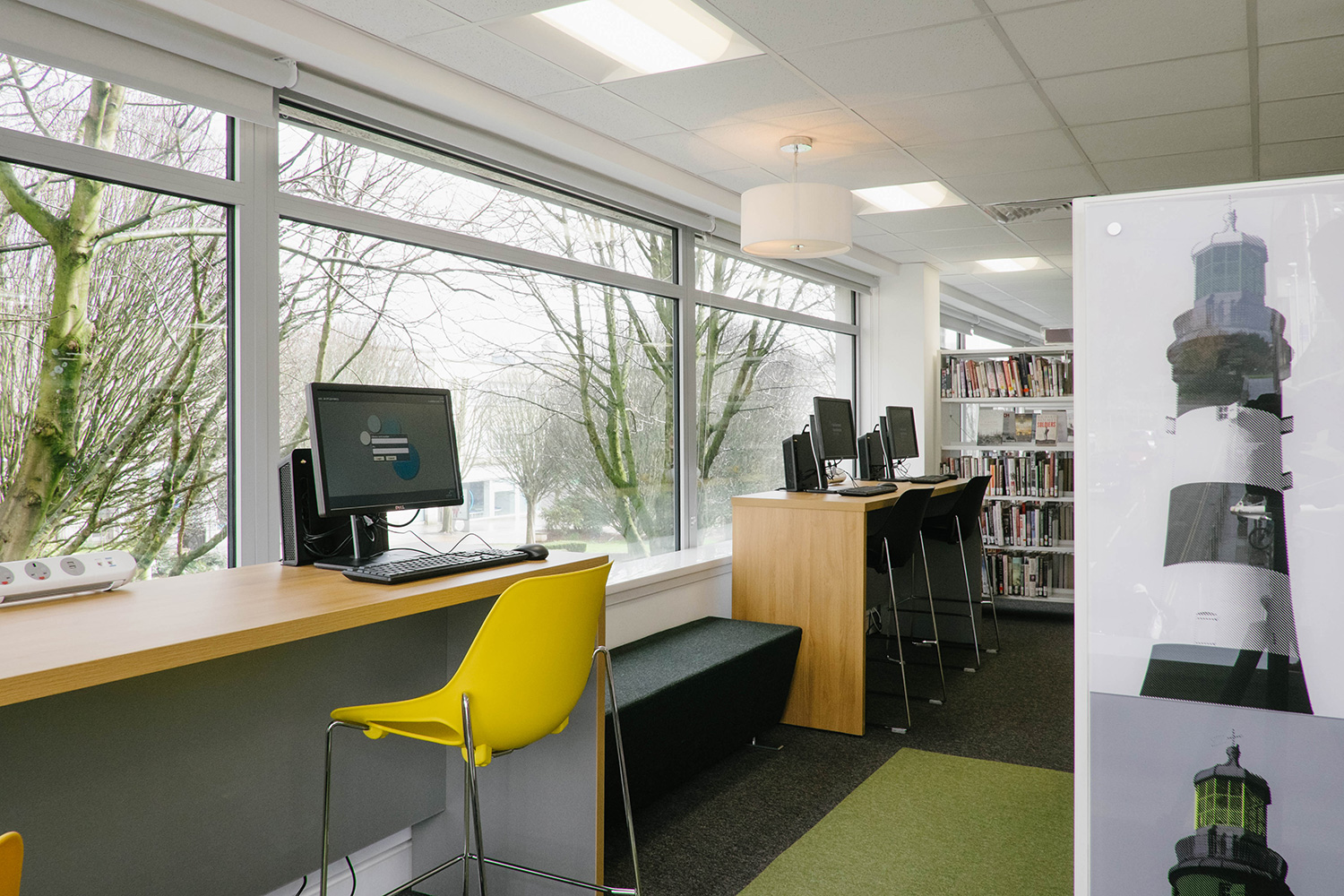 Efter att ha bytt lokaler var biblioteket klart för att öppna igen, mitt i stadens centrum och affärsstråk. Thedesignconcept antog utmaningen att designa ett bibliotek som skulle vara iögonfallande och inbjuda till besök. Designen utgick från en installation på barnavdelningen; ett ”statement tree” omgivet av färgglada möbler och specialgjord väggrafik i form av väggord, citat och bilder. Denna design åstadkommer en välkomnande och inbjudande omgivning för alla besökare.