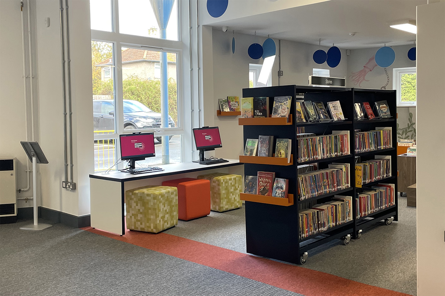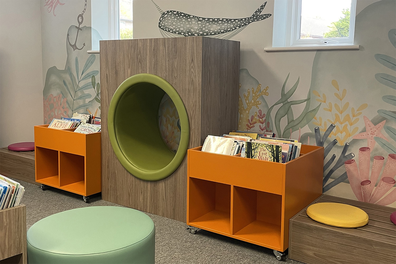 Barnbiblioteket är inrett på ett lekfullt och livfullt sätt. Barnen kan ha roligt eller lyssna på berättelser på en skräddarsydd scen. Det finns låga bilderbokstråg och exponeringshyllplan placerade i barnhöjd som uppmuntrar barnen att bläddra bland böckerna. Barnområdet är ett fantastiskt, roligt och attraktivt område som är uppdelat i små avsnitt med hyllor, bilderbokstråg och andra möbler för att också ge utrymme för koncentration och avskildhet.