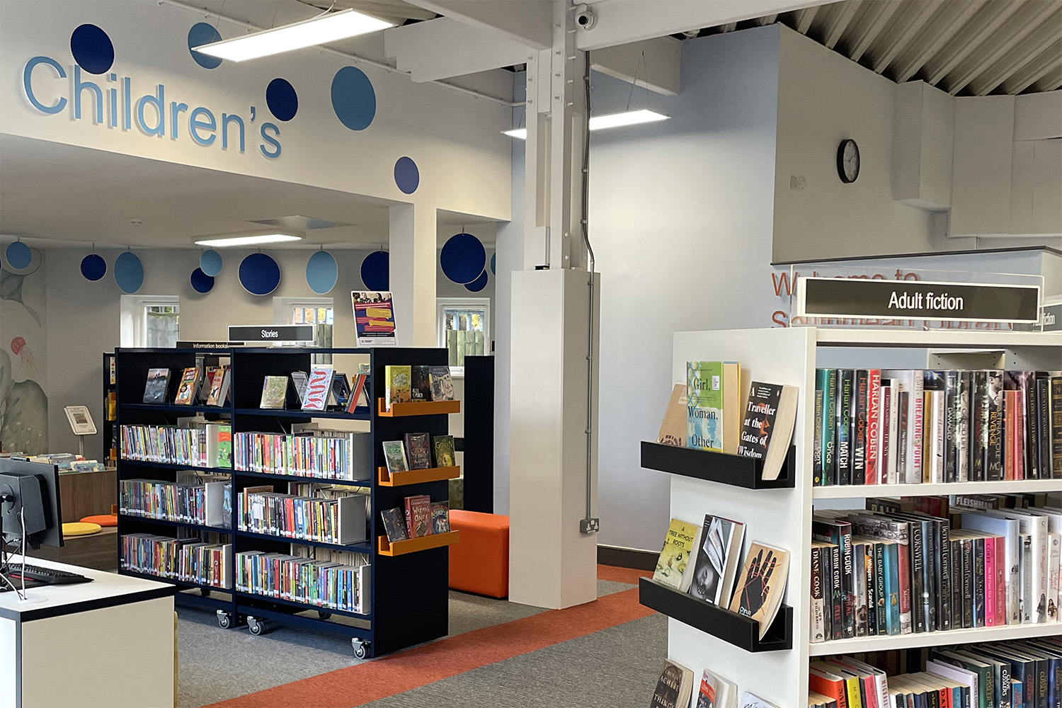 Vid bibliotekets huvudingång möts besökarna av moderna utställnings- och sittytor med inbyggda bänkar. Det finns infopodier i olika höjder för personalen, och layouten är utformad med fokus på att skapa ett överskådligt utrymme där besökarna inte känner sig inklämda. Det finns gott om utrymme mellan hyllraderna, gott om passage och inga blindgångar i de öppna ytorna. Vid entrén finns tydliga skyltar som visar var barnbiblioteket och personalen finns. De senaste böckerna visas på exponeringshållare på bokhyllornas gavlar. Vi har gjort biblioteket ännu mer trivsamt genom att ha ett område med Cocoon sitthål där man kan koppla av och njuta av en lugn stund.