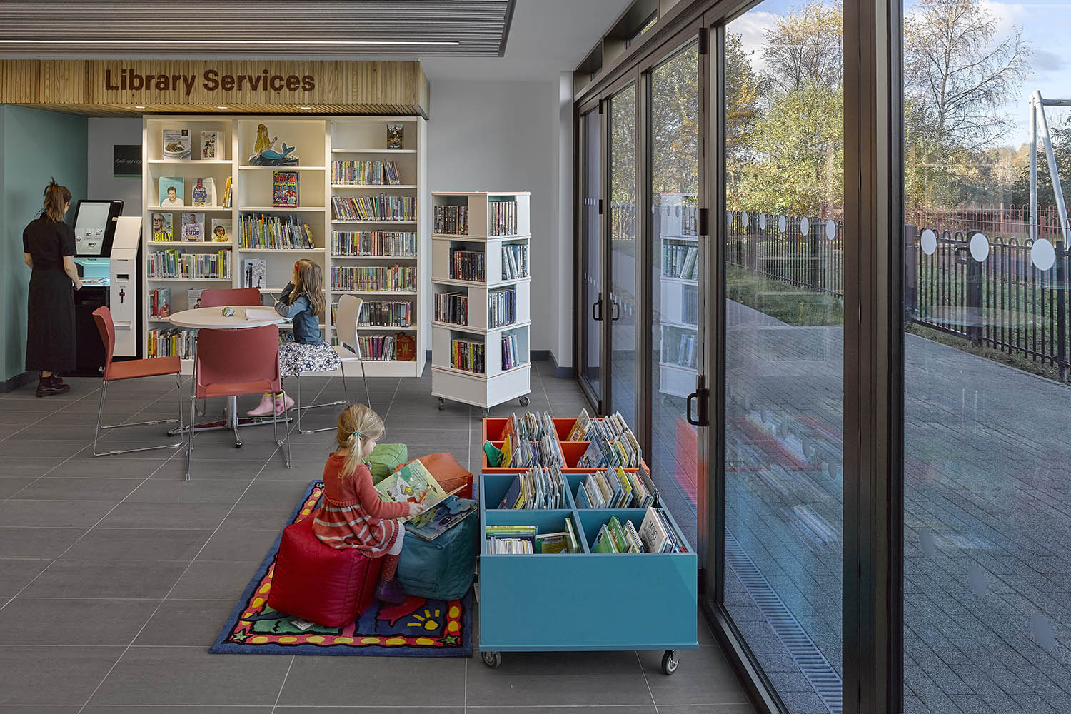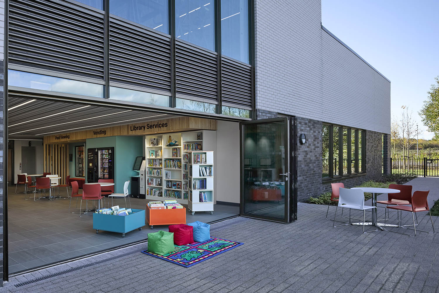 Biblioteket är litet, men perfekt utformat och vikdörrar släpper in utsidan. De öppnar upp biblioteket mot en vacker uteplats med sittgrupper. Det inkluderar självbetjäning av boklån och gratis offentliga datorer. Där finns också ett receptions-/socialt område, som tar emot community hub-användare och sittplatser. Biblioteket utformades för självbetjäning och fokuserar på två universella områden – läsning och information.