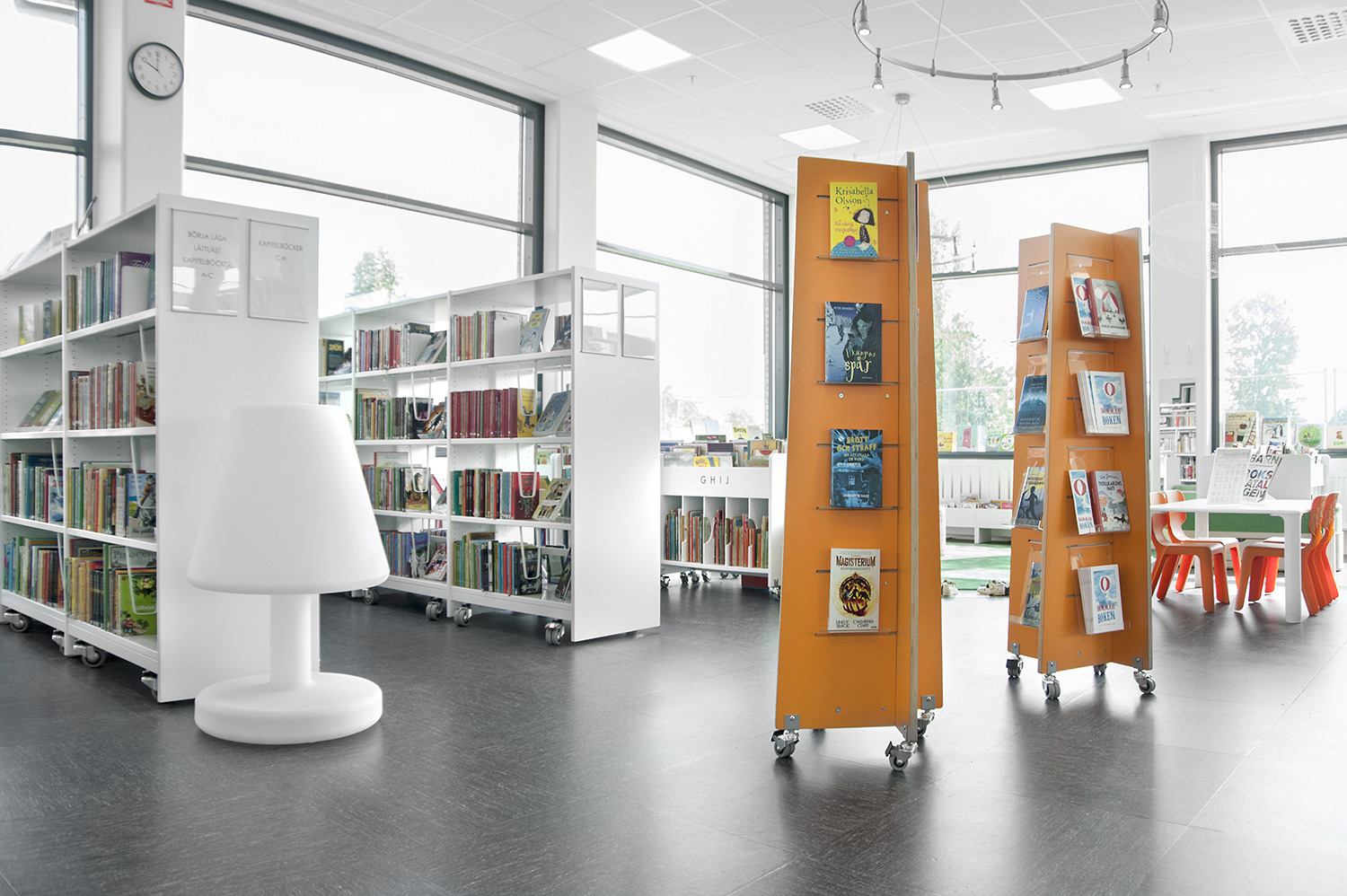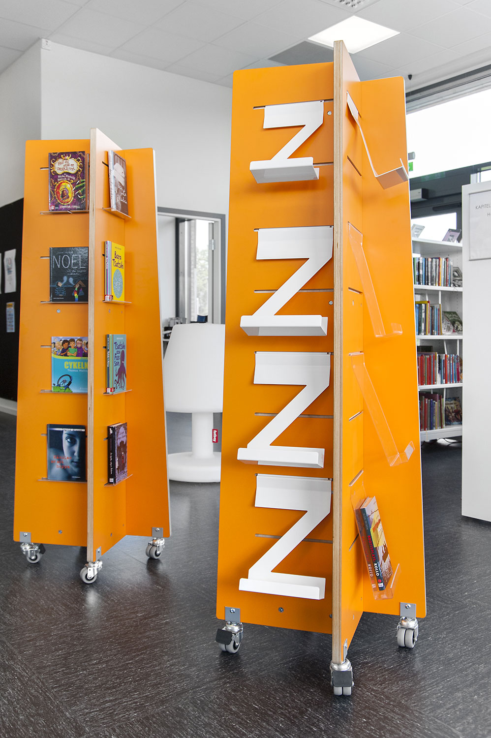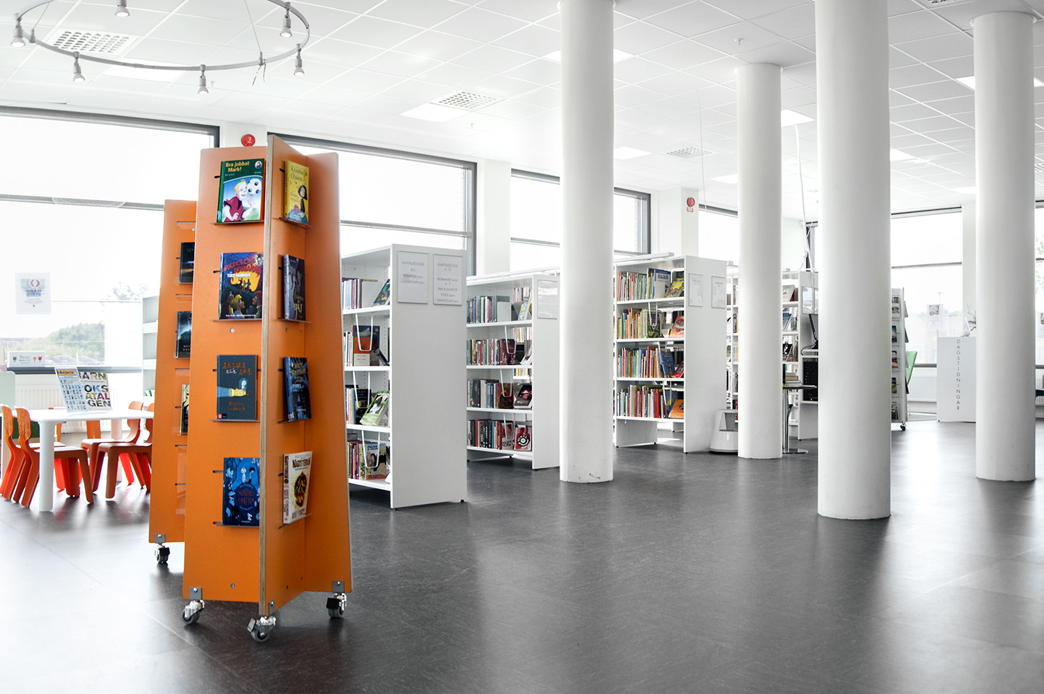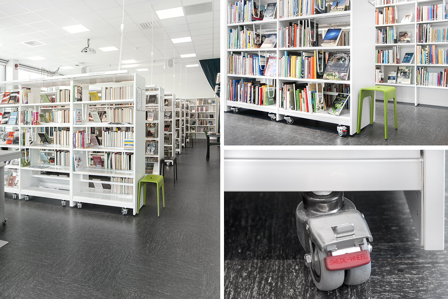 Hyllsystemen skulle delvis vara på hjul och därmed flyttbara för ökad flexibilitet och möjlighet att använda delar av lokalen till olika event. En del hyllgavlar har man använt till databord Eureka, andra låter man vara en del av skyltningen genom att använda text på. För att exponera nyheter, teman och skapa intresse använder man Quattro exponeringstorn i vitt och orange i två olika höjder