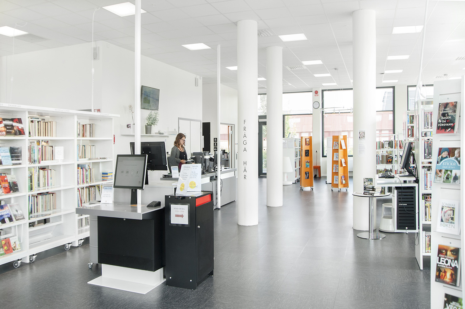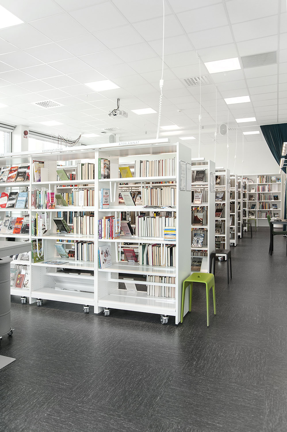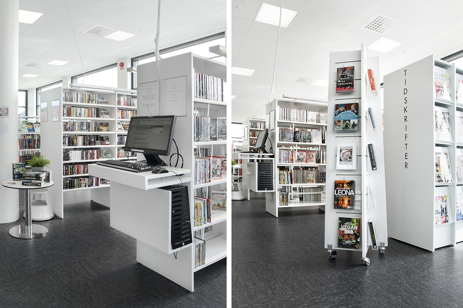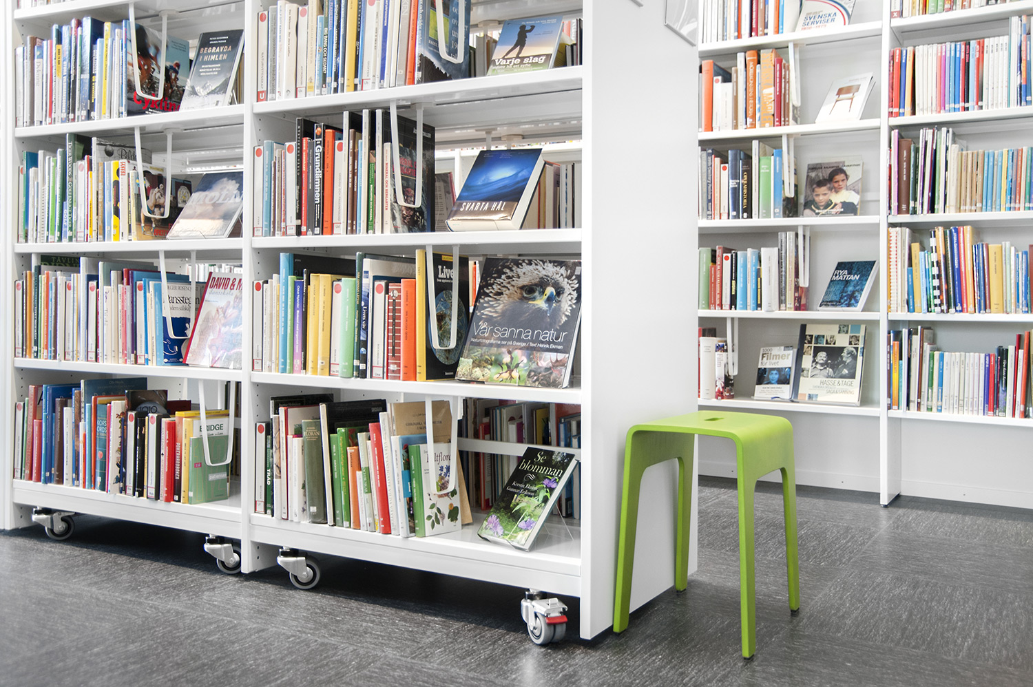 Hyllsystemen skulle delvis vara på hjul och därmed flyttbara för ökad flexibilitet och möjlighet att använda delar av lokalen till olika event. En del hyllgavlar har man använt till databord Eureka, andra låter man vara en del av skyltningen genom att använda text på. För att exponera nyheter, teman och skapa intresse använder man Quattro exponeringstorn i vitt och orange i två olika höjder