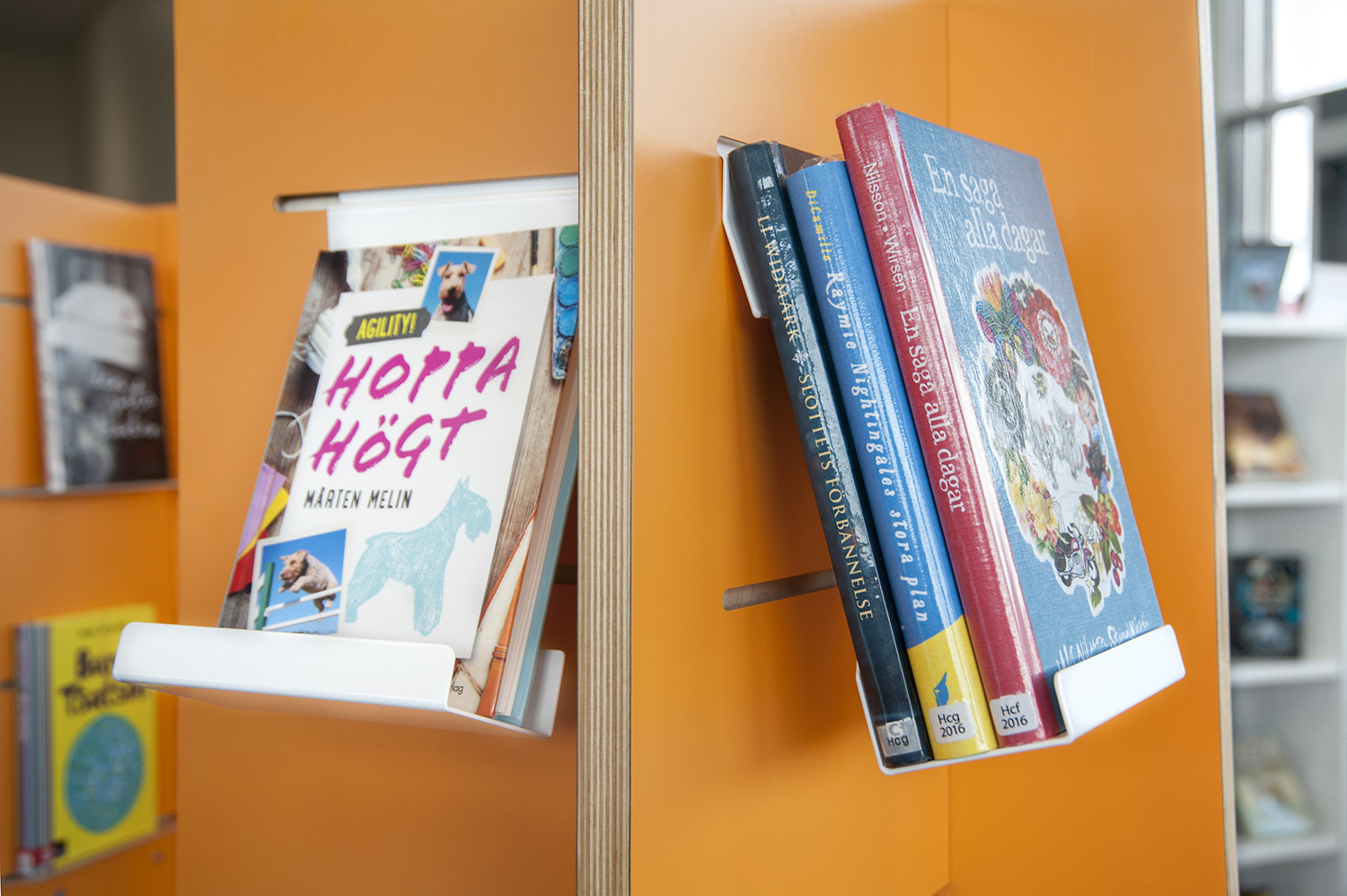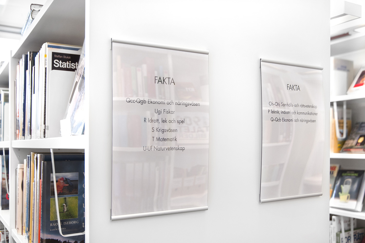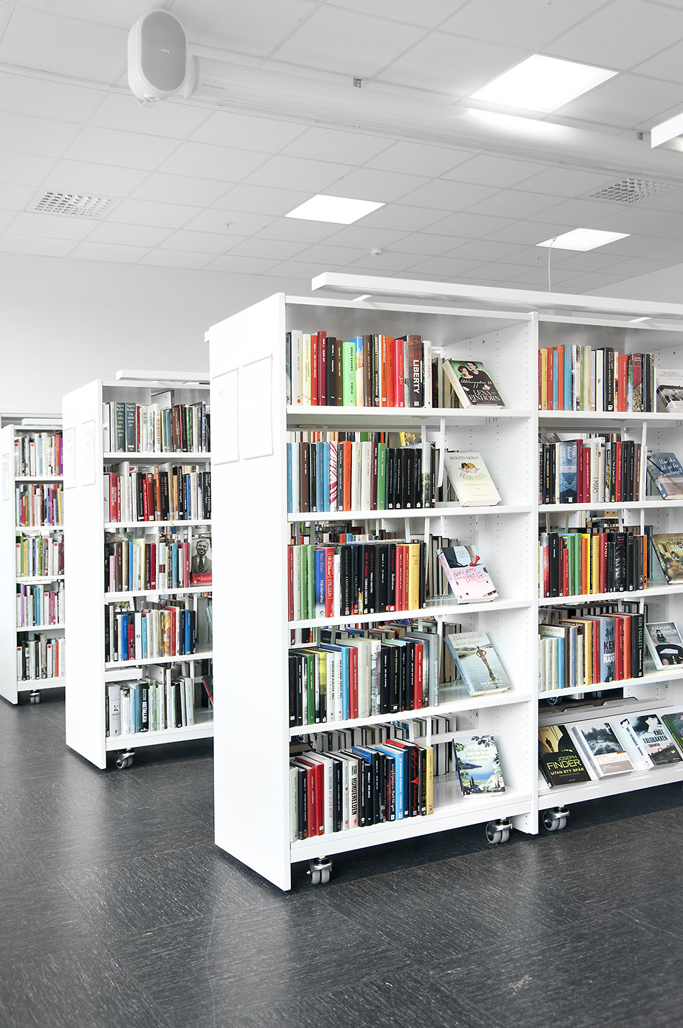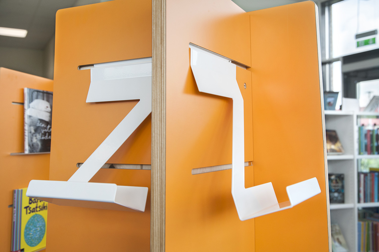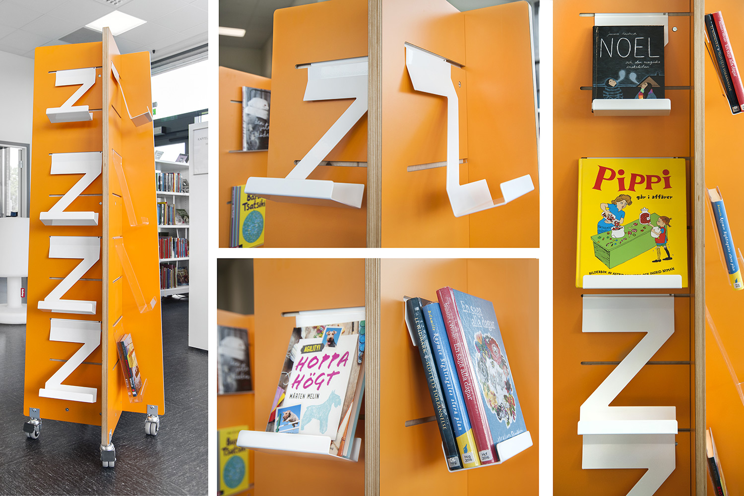 Hyllsystemen skulle delvis vara på hjul och därmed flyttbara för ökad flexibilitet och möjlighet att använda delar av lokalen till olika event. En del hyllgavlar har man använt till databord Eureka, andra låter man vara en del av skyltningen genom att använda text på. För att exponera nyheter, teman och skapa intresse använder man Quattro exponeringstorn i vitt och orange i två olika höjder