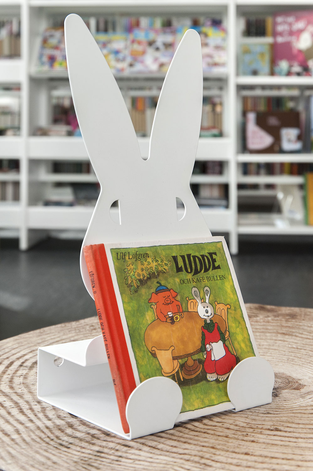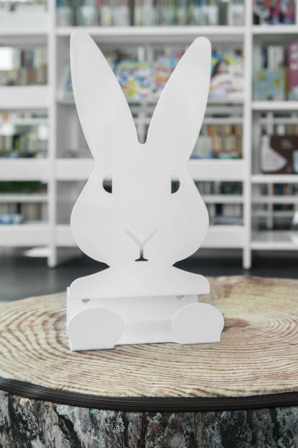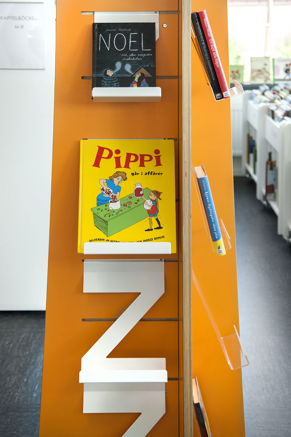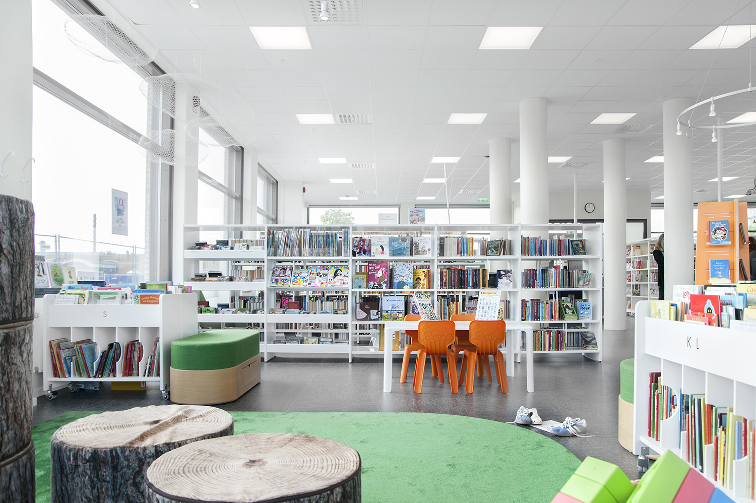 Hyllsystemen skulle delvis vara på hjul och därmed flyttbara för ökad flexibilitet och möjlighet att använda delar av lokalen till olika event. En del hyllgavlar har man använt till databord Eureka, andra låter man vara en del av skyltningen genom att använda text på. För att exponera nyheter, teman och skapa intresse använder man Quattro exponeringstorn i vitt och orange i två olika höjder