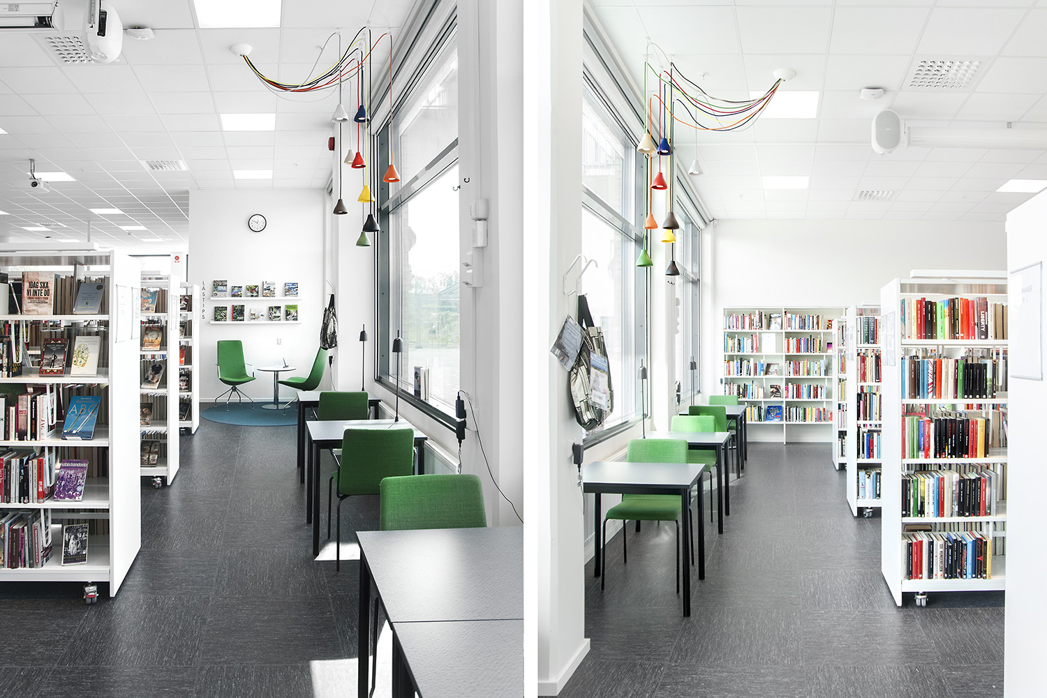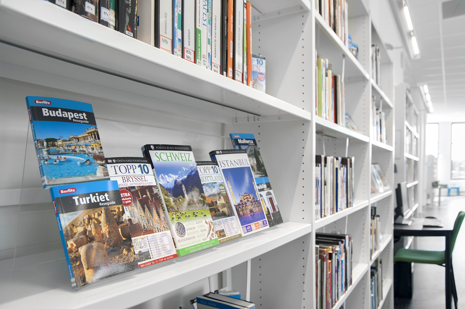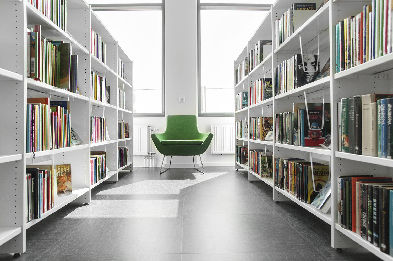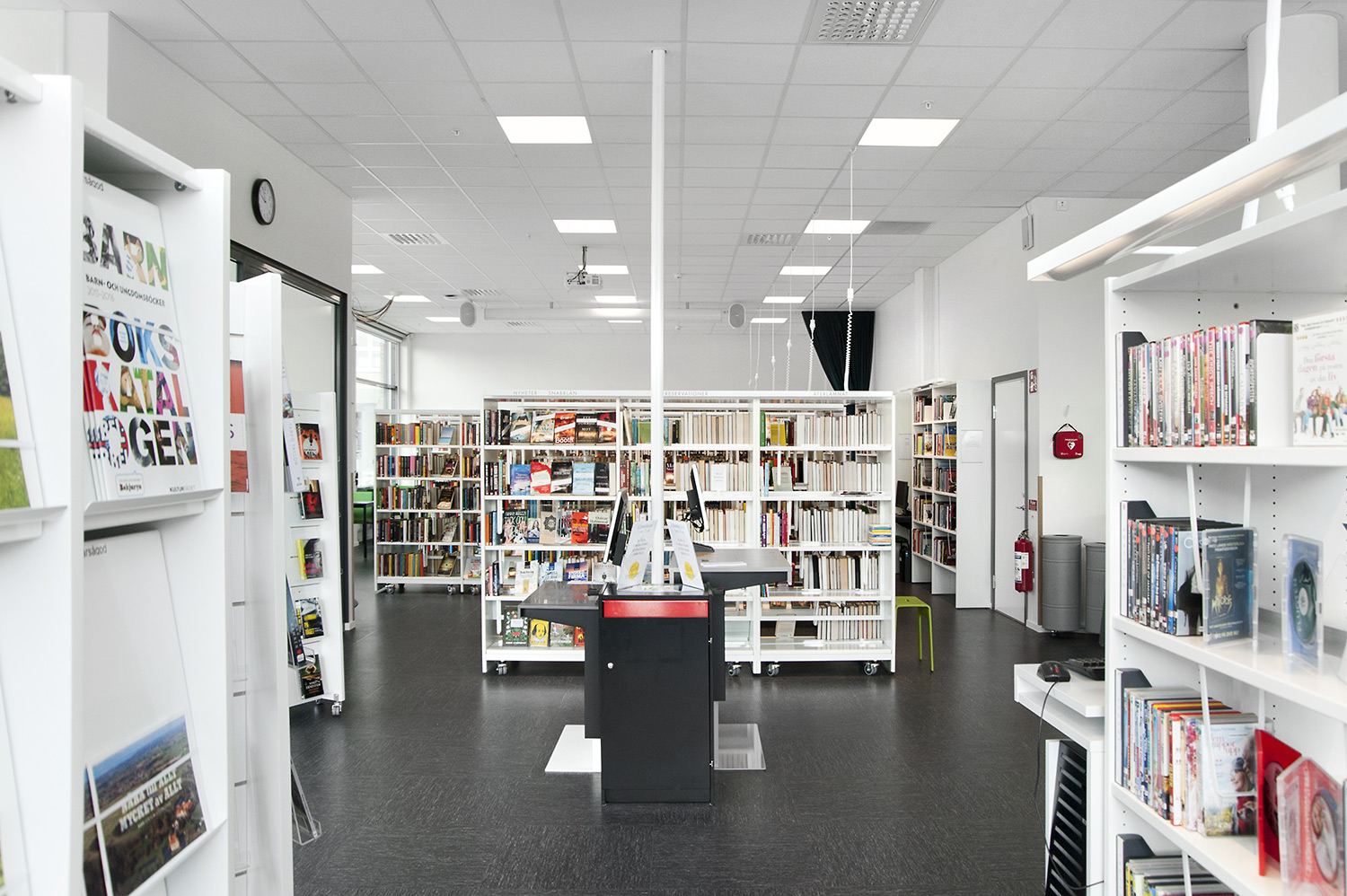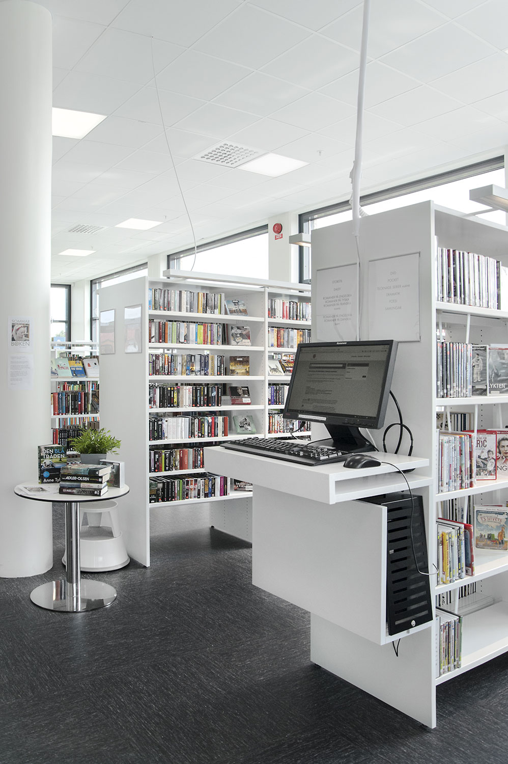 Man har satsat på vita Frontlinehyllor kompletterade med olika funktioner såsom t ex tidskriftsförvaring och exponeringshyllplan. Hyllorna skulle dessutom placeras så att det blev överskådligt oavsett var i lokalen man befinner sig.