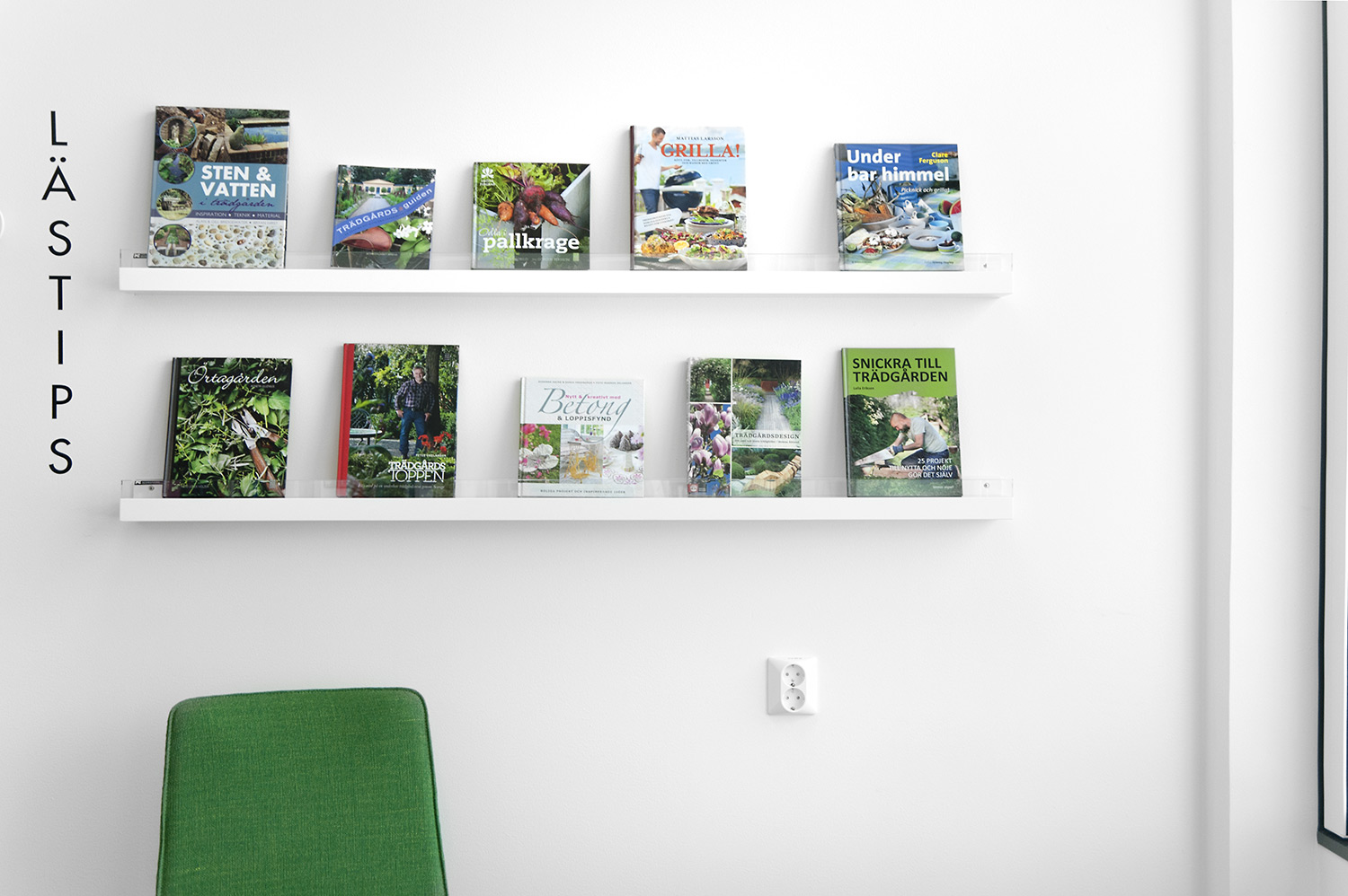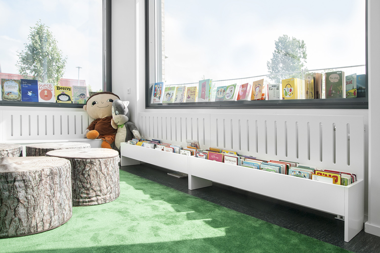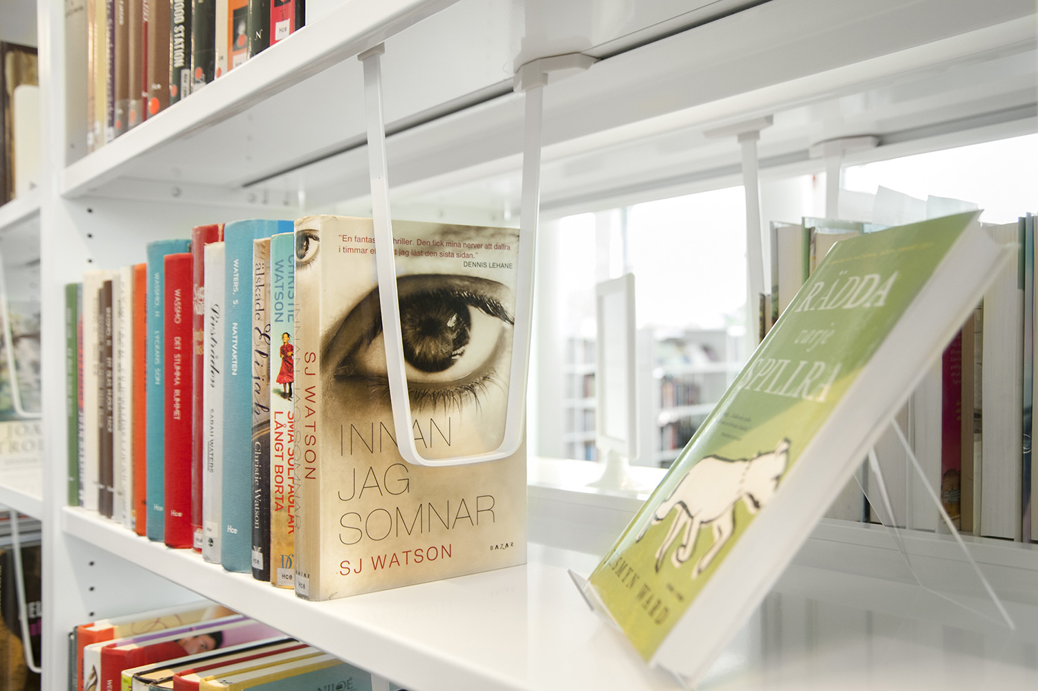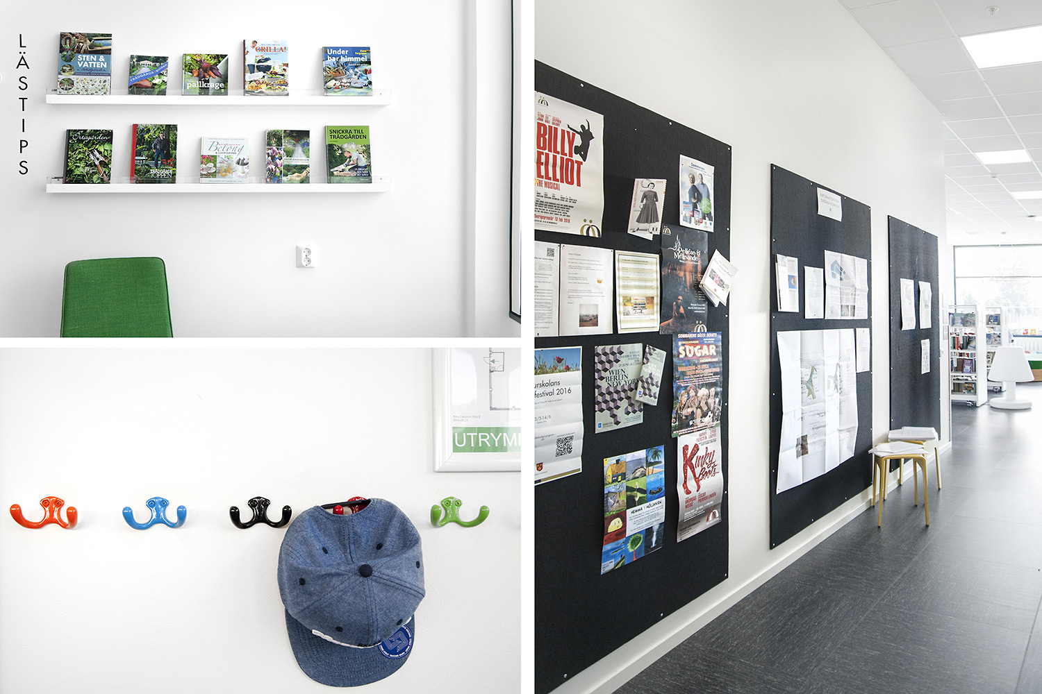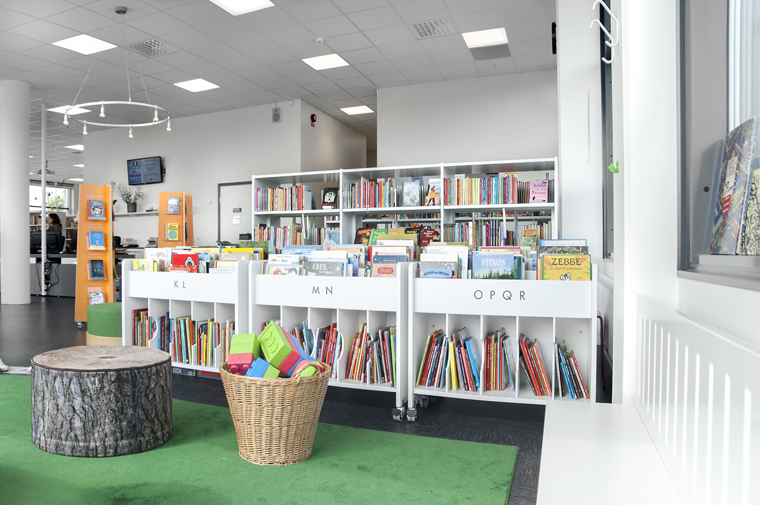 Man har satsat på vita Frontlinehyllor kompletterade med olika funktioner såsom t ex tidskriftsförvaring och exponeringshyllplan. Hyllorna skulle dessutom placeras så att det blev överskådligt oavsett var i lokalen man befinner sig.