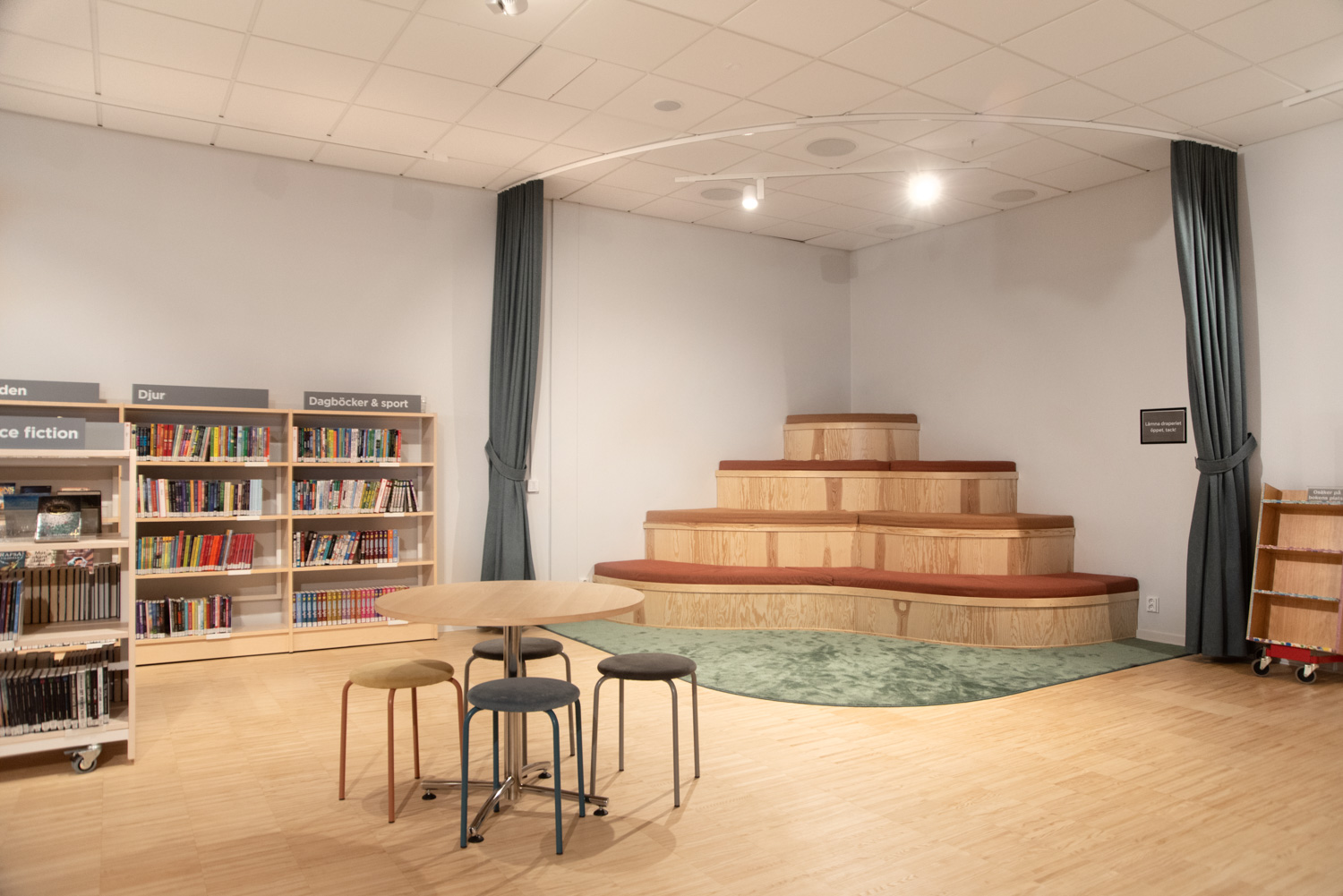 Kirunas bibliotekschef Carina Bergsten berättar: "Vi har under alla år varit mer än nöjda med den inredning som köptes in vid flytten 2012. När det nu blev aktuellt med ytterligare en flytt till Kiruna nya centrum så var därför vår inställning att vi tar med så mycket som möjligt av den befintliga inredningen. Det både ur ett hållbarhets, ekonomiskt - och miljöperspektiv men också för att inredningen fortfarande var i ett superfint skick. Vi kompletterade sedan med den inredning som vi behövde med anledning av de nya lokalernas utformning. Men som sagt, det mesta av inredningen har vi tagit med vilket känns mycket bra."