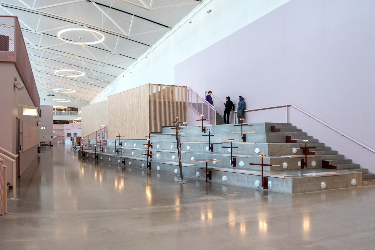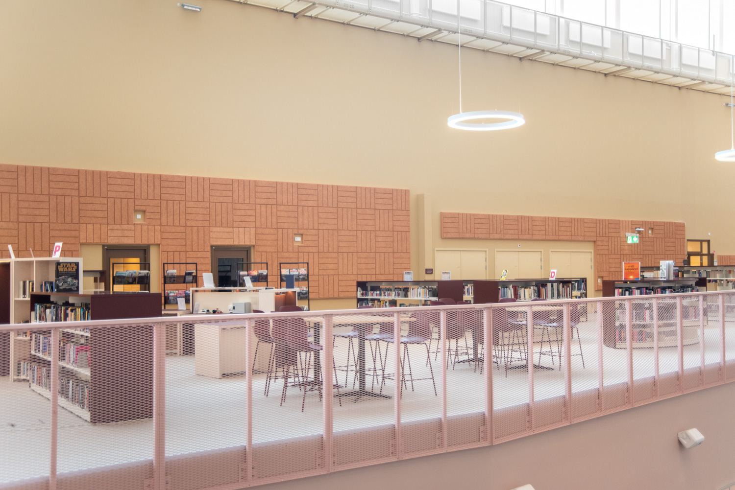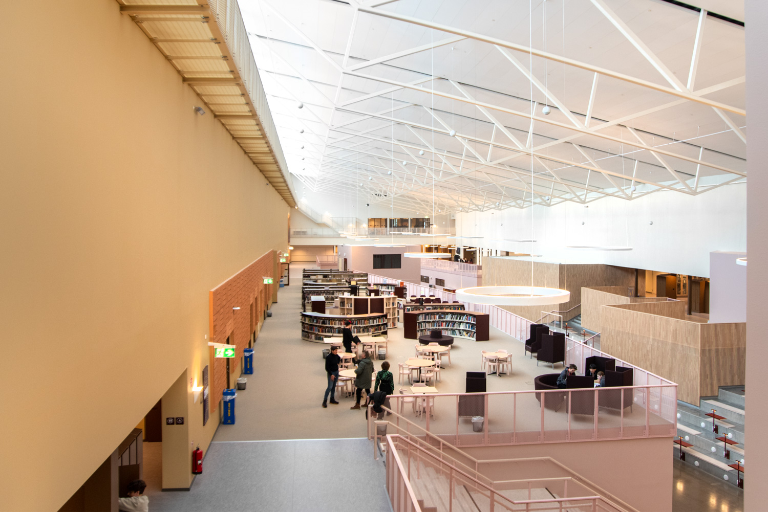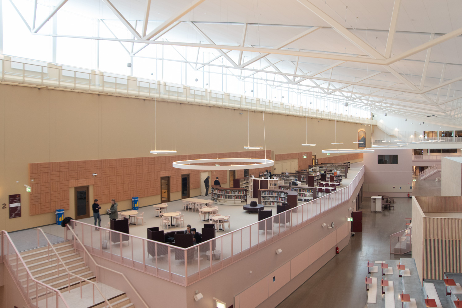 I hjärtat av byggnaden finns ett centralt torg som utgör en länk mellan kunskapsstaden och resten av stadskärnan. Härifrån leds besökaren in i ett rymligt atrium där stadens och skolans verksamheter möts i ett gemensamt och offentligt rum. Här ligger också biblioteket, där en generös mängd dagsljus kommer från stora glaspaneler på taket, vilket inbjuder besökarna att titta upp mot himlen och följa årstidernas olika skiftningar.