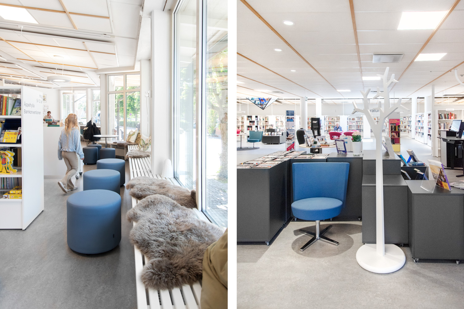 På Laholms stadsbibliotek har kombinationen av återbrukade och nya möbler skapat en tidsenlig och tillmötesgående inredning som understryker byggnadens unika kännetecken.
