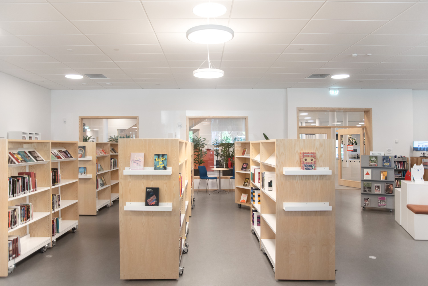 Bibliotekets arkitektur blandar funktionalitet med estetik. Stora fönster låter rummet bada i naturligt ljus och skapar en inbjudande atmosfär som passar bra för både studier och avkoppling. Inredningen är genomtänkt indelad i zoner som erbjuder särskilda områden för studier, grupparbeten och avslappnad läsning. Mjuka och ergonomiska sittmöbler gör att studenterna kan ägna sig åt sina studier på ett bekvämt sätt.